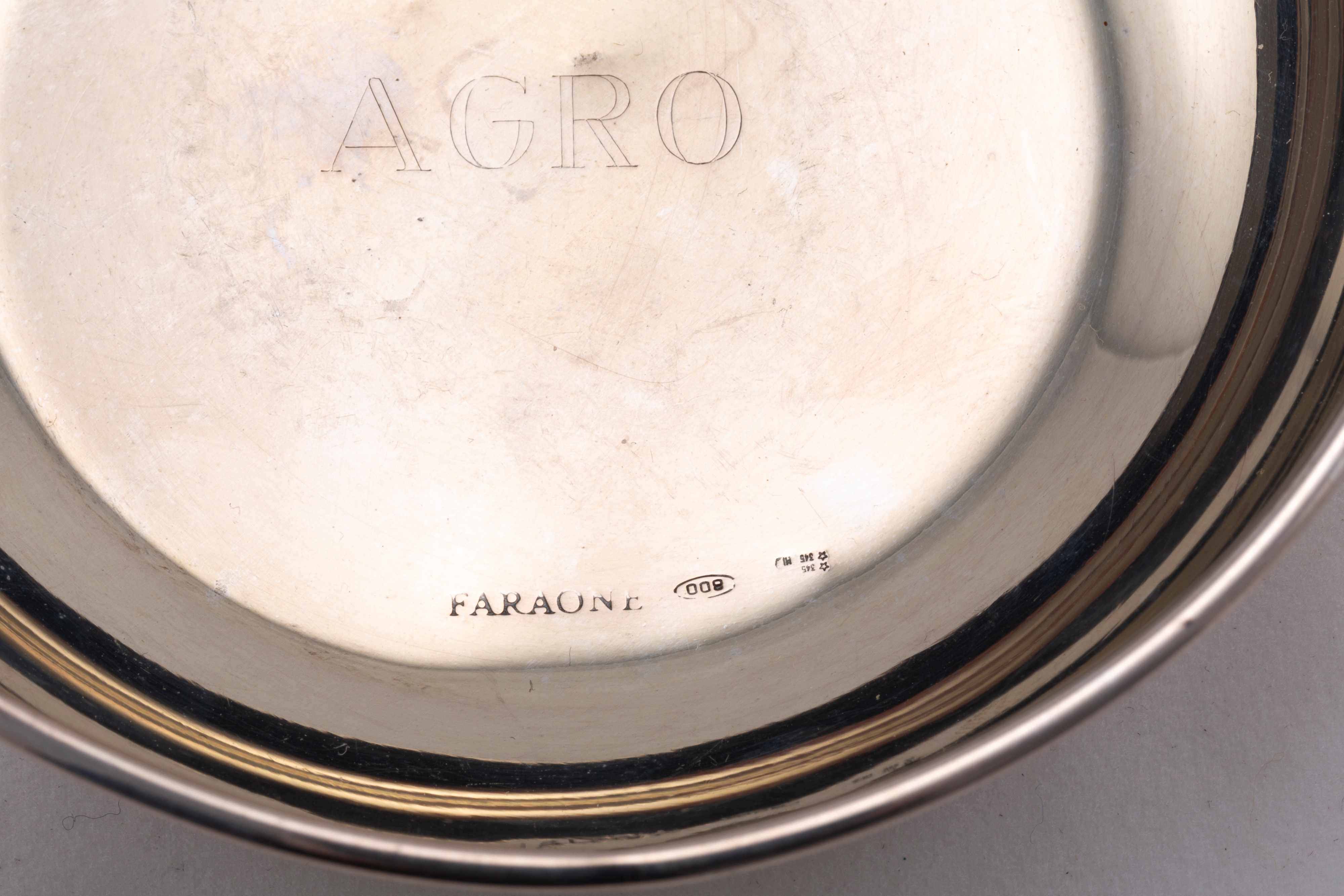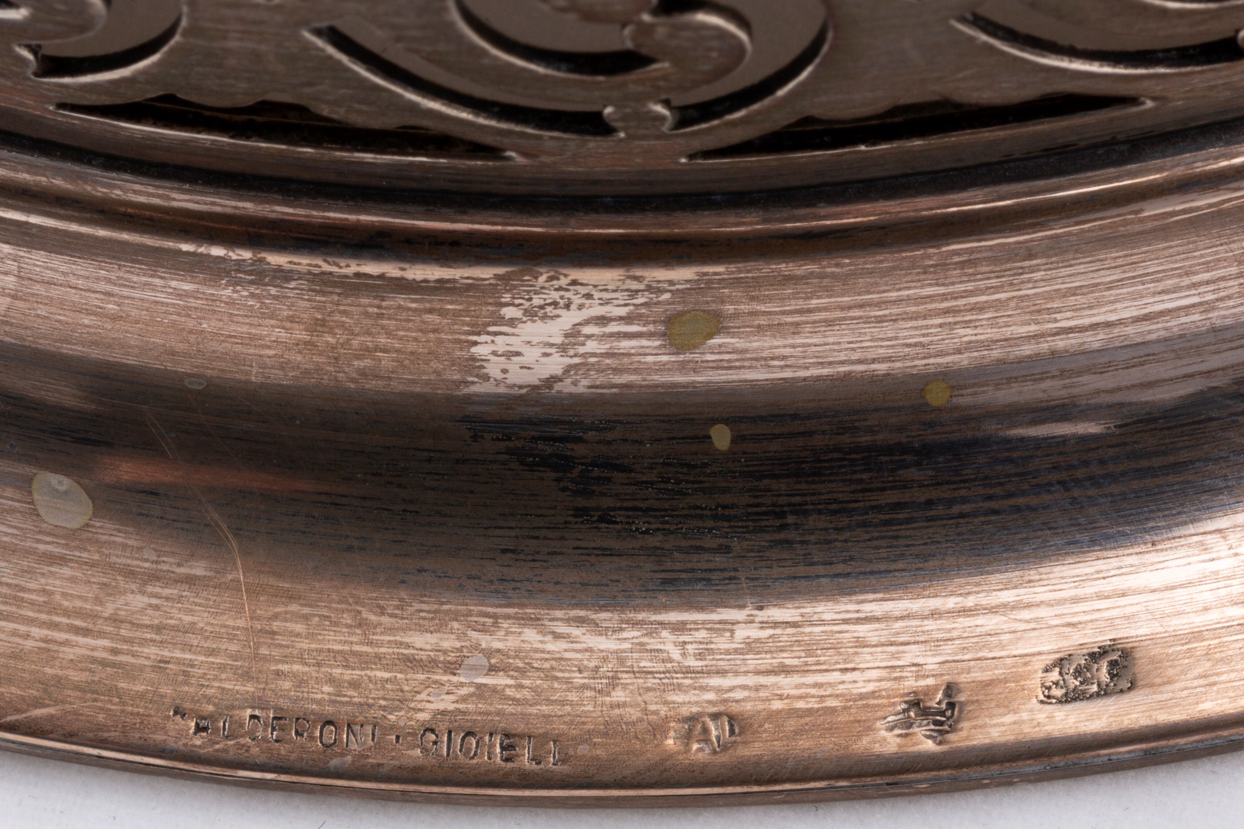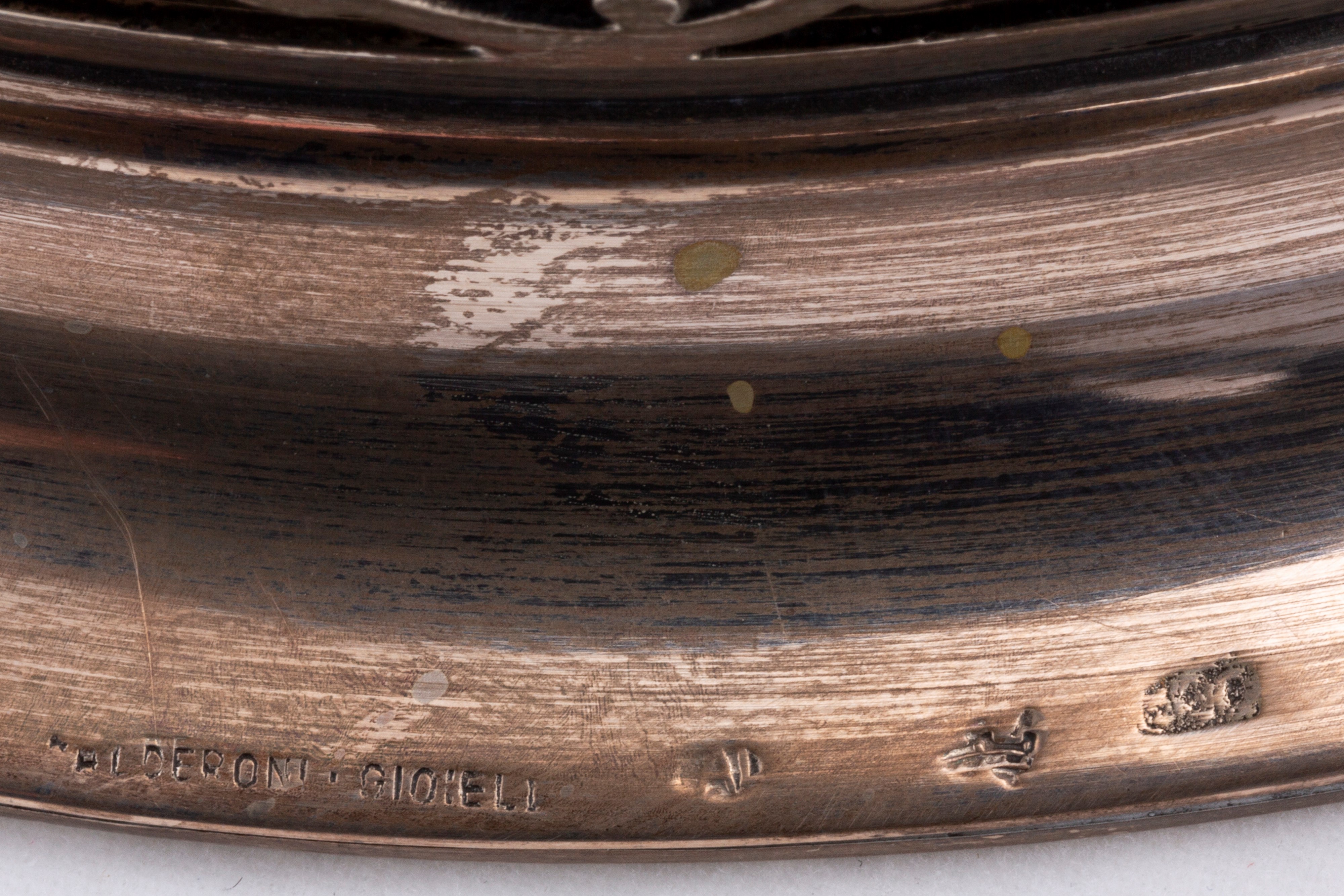 in argento 800 e 925composto da un posacenere De Vecchi, uno svuotatasche Faraone, un vassoietto Miracoli e un'alzatina reticolata Cesa per Calderoni Gioielli.
