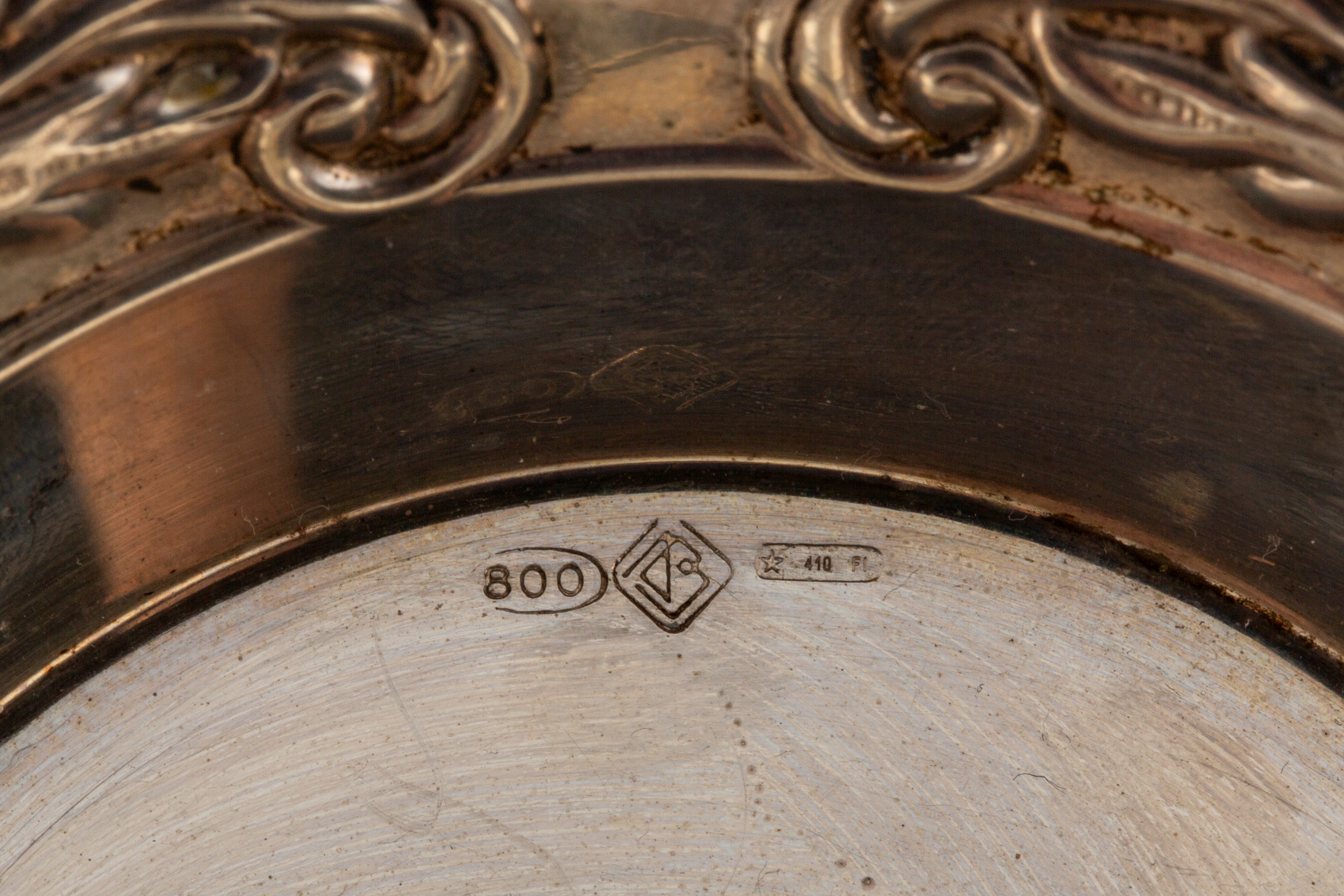 in argento e vetrouna traforata con motivi floreali, bordo a perline e piedini floreali (l cm 28,00), una polilobata e sbalzata a motivi floreali (l cm 13,00) e una circolare, sbalzata con melograni, mele, pere e viticci, con vetro interno e supporto in legno alla base (l cm 16,00).