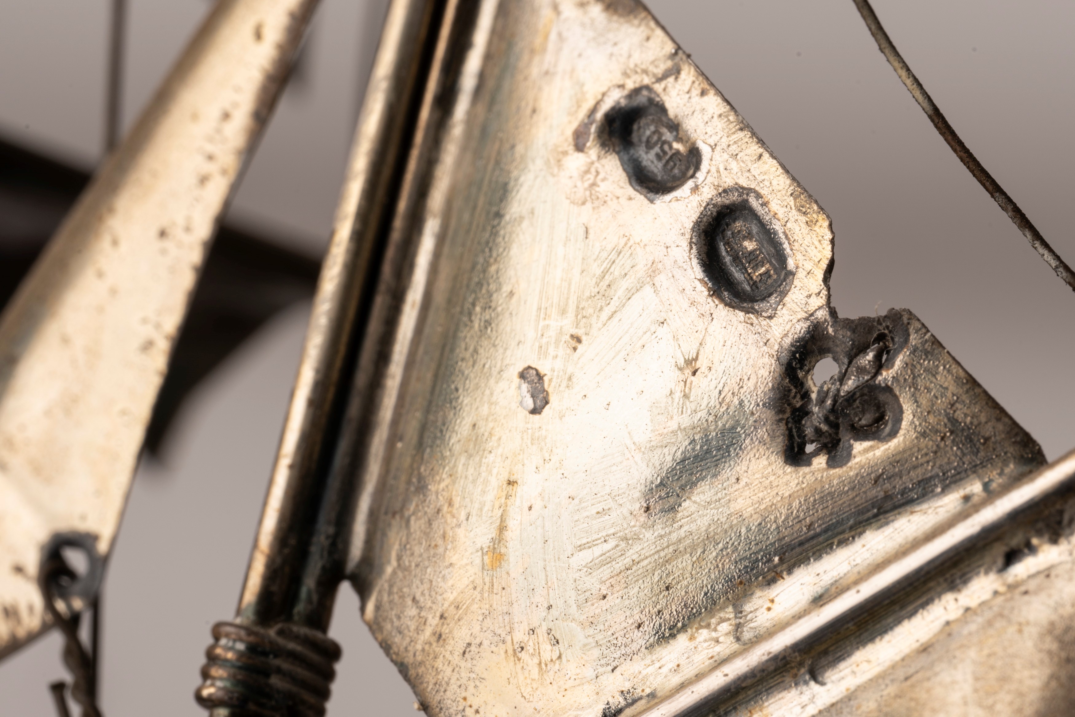 in argento 950su supporto in legno, difetti (rotture e mancanze).