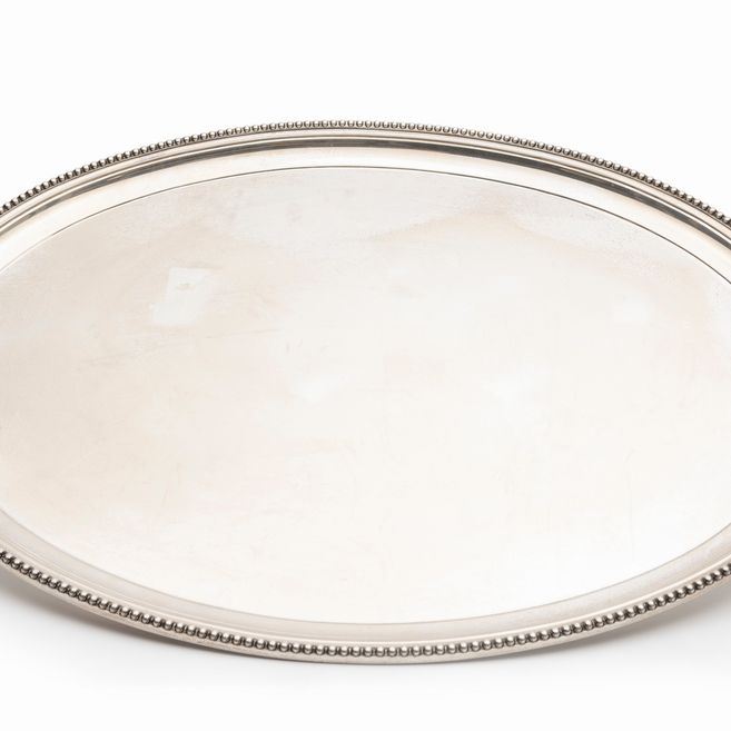 in argentodi forma ovale, a due manici, con profilo a decoro perlinato.