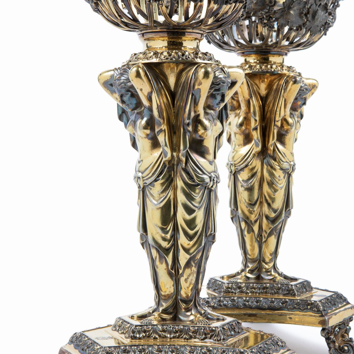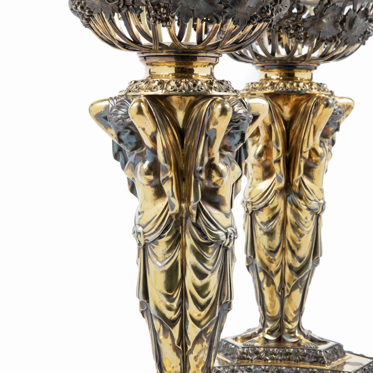 in argento vermeilpiedi a conchiglia, base gradinata, fusto con tre cariatidi che sorreggo motivo traforato ed impreziosito da foglie di vite e grappoli d'uva, difetti.