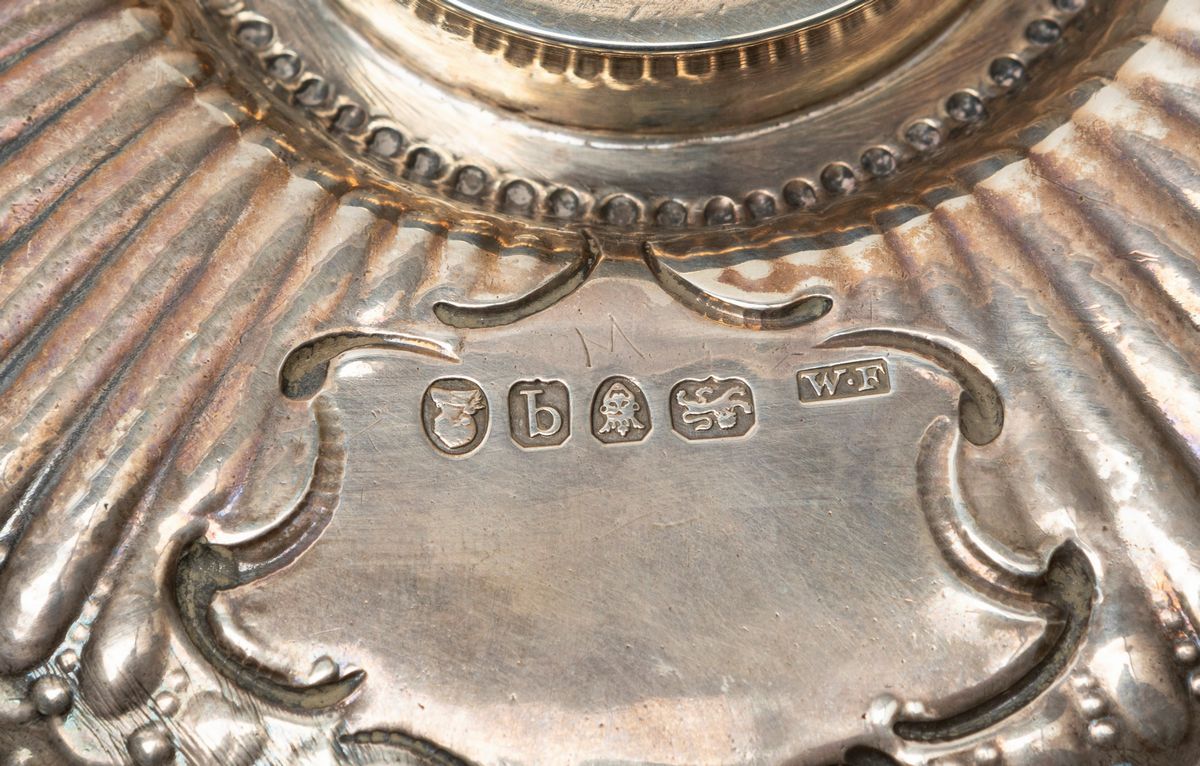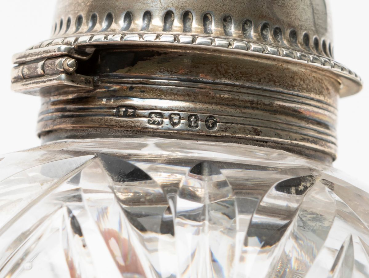 in argentocon boccetta in cristallo su piatto poggiante su tre piedini con motivo a drago alato.