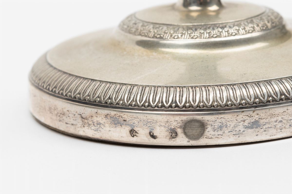 in argentoa base rotonda, fusto mistilineo con decori incisi.