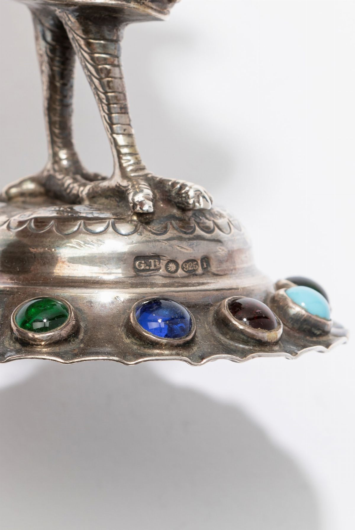 in argento, metallo e paste vitreeuna raffigurante gallina con conchiglia, l'altra una donna che fila.
