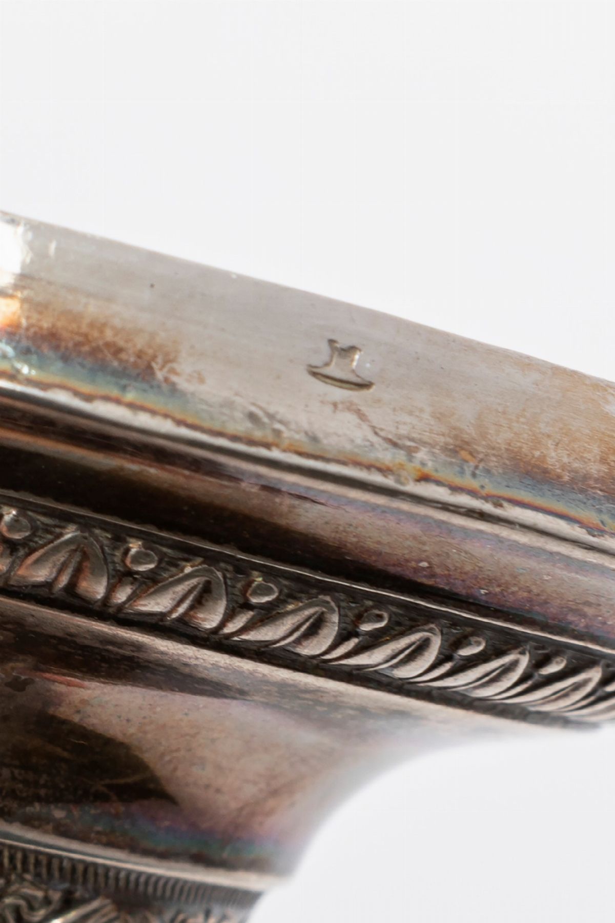in argentolampada poggiante su tre piedi con decoro ad angeli, porta mostarda con presa a cigno, difetti (mancante dei sei cucchiaini)