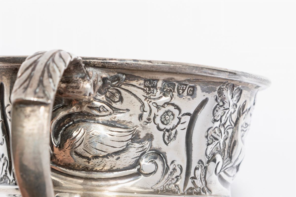 in argentocon decori a sbalzo raffiguranti fiori e animali, reca incisione "Audrey".