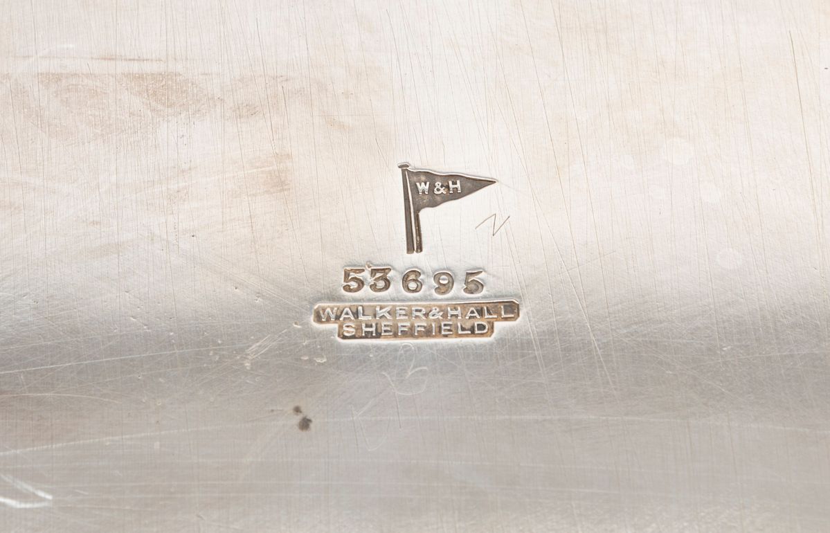 in argentopoggiante su tre piedi, di forma circolare, bordo mosso, decori floreali, centro inciso con al centro stemma