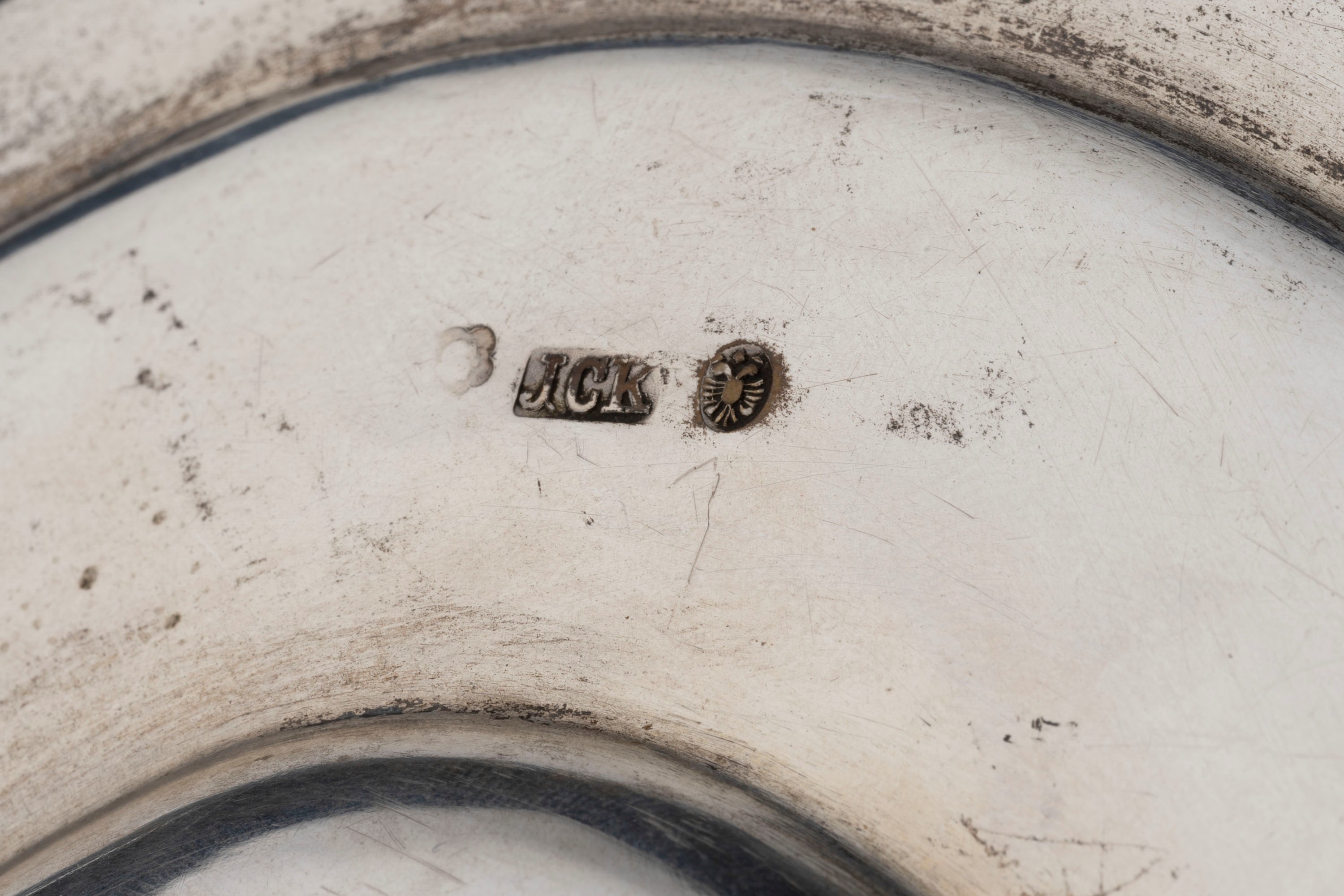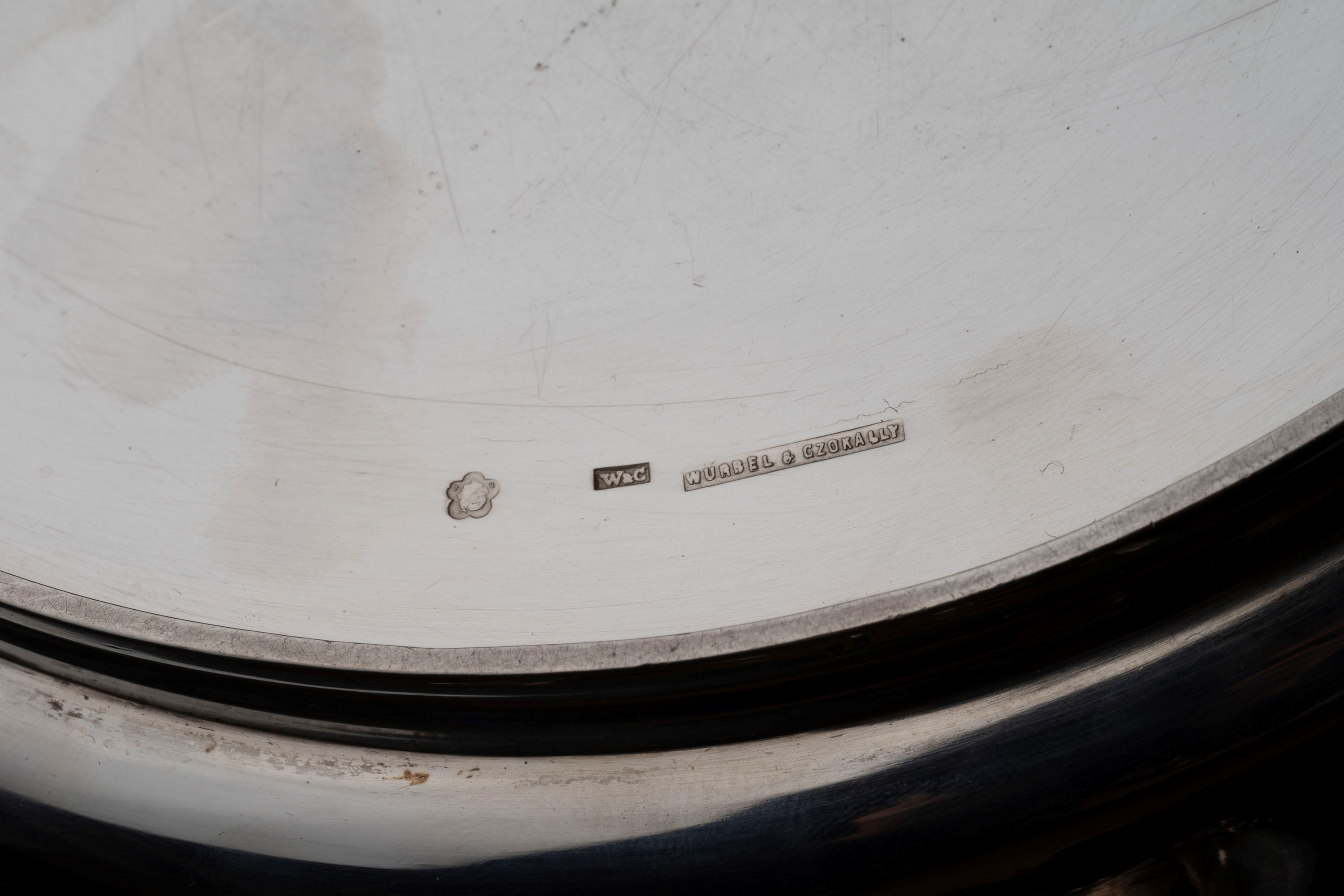 in argentocomposto da salsiera con prese decorate a motivi fogliacei, Carl Joseph Klinkosch, alzata rettangolare sbalzata e cesellata con manici, J. Reieiner, zuppiera con prese a decoro fogliaceo e a pigna, Würbel & Czokally e piatto di forma rotonda, Würbel & Czokally.