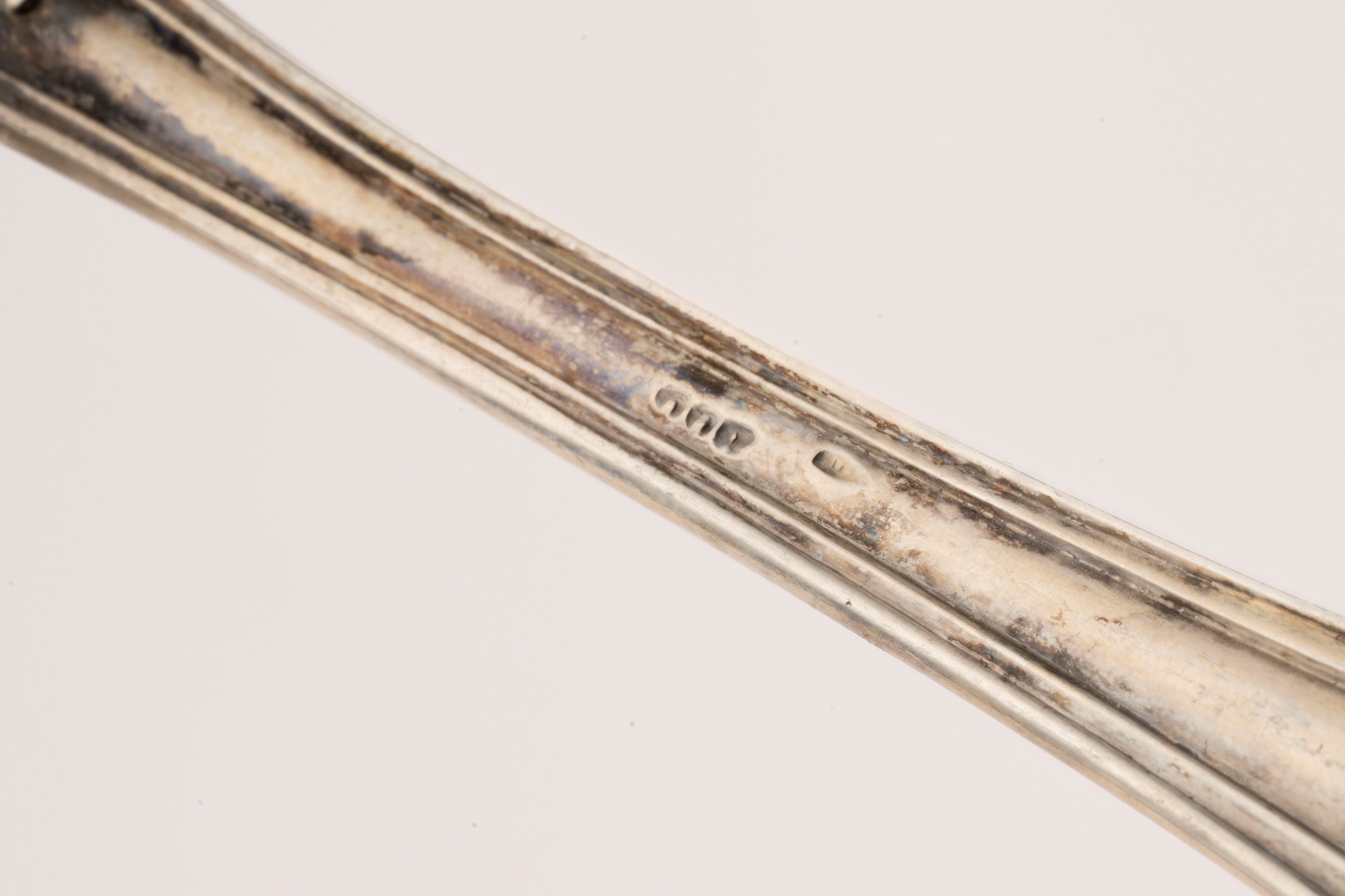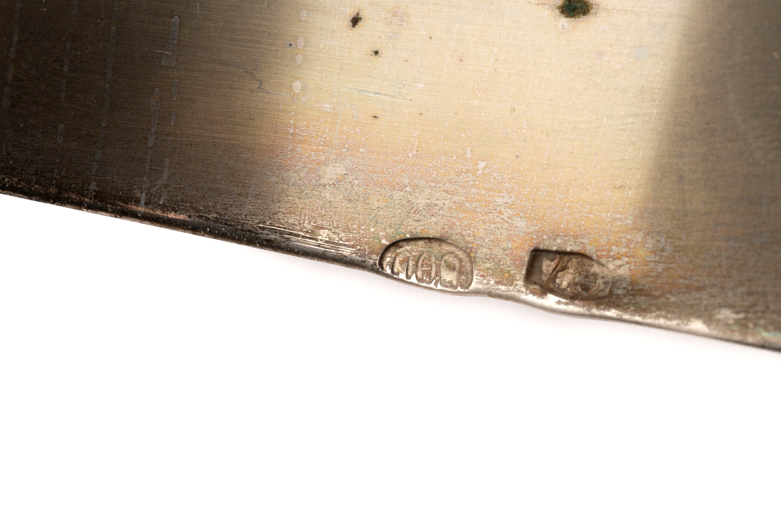 in argentosalsiera a doppio manico con cucchiaio, vaso con decori a bulino, porta grissini poggiante su quattro piedini traforati e profilo con decori a rilievo.
