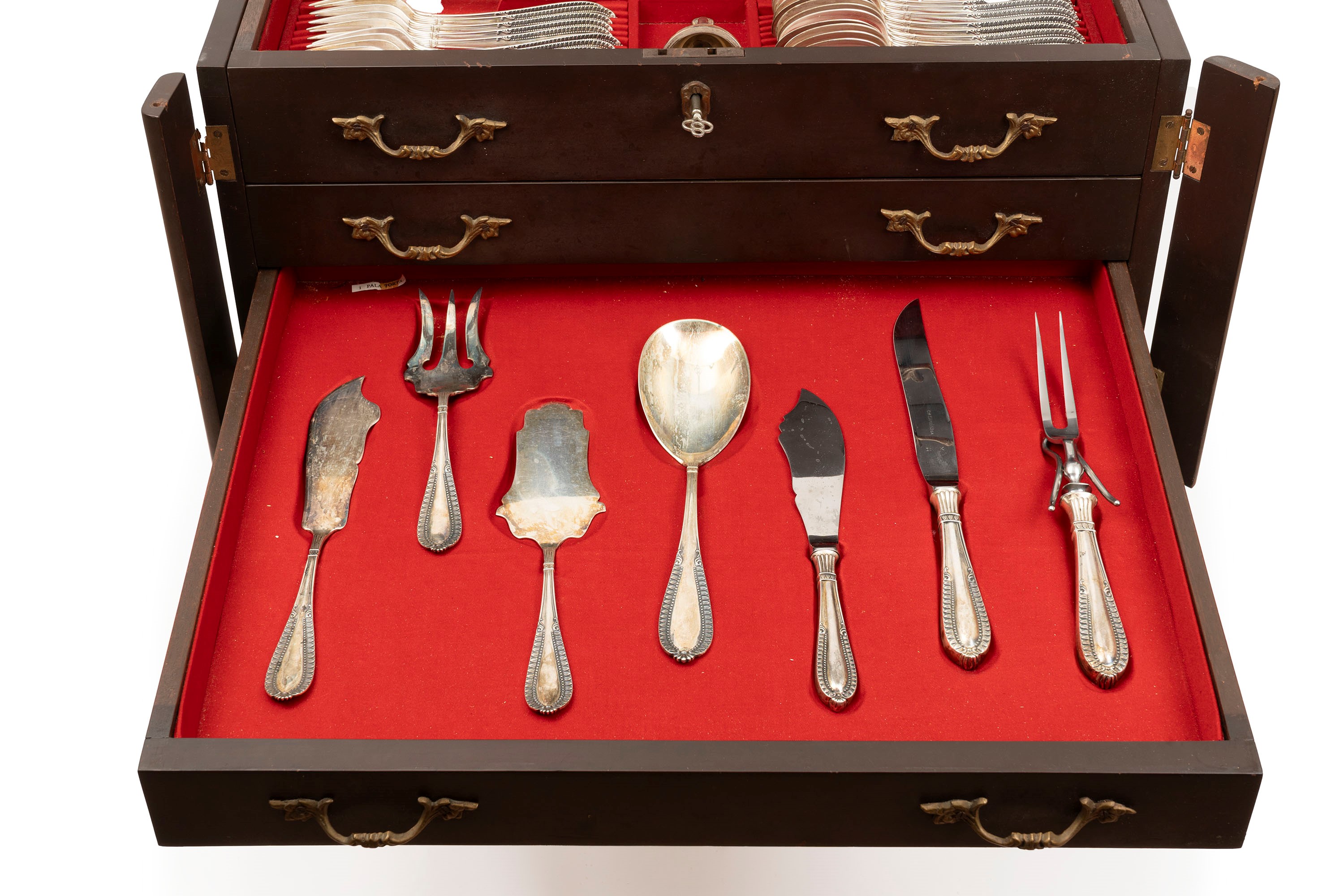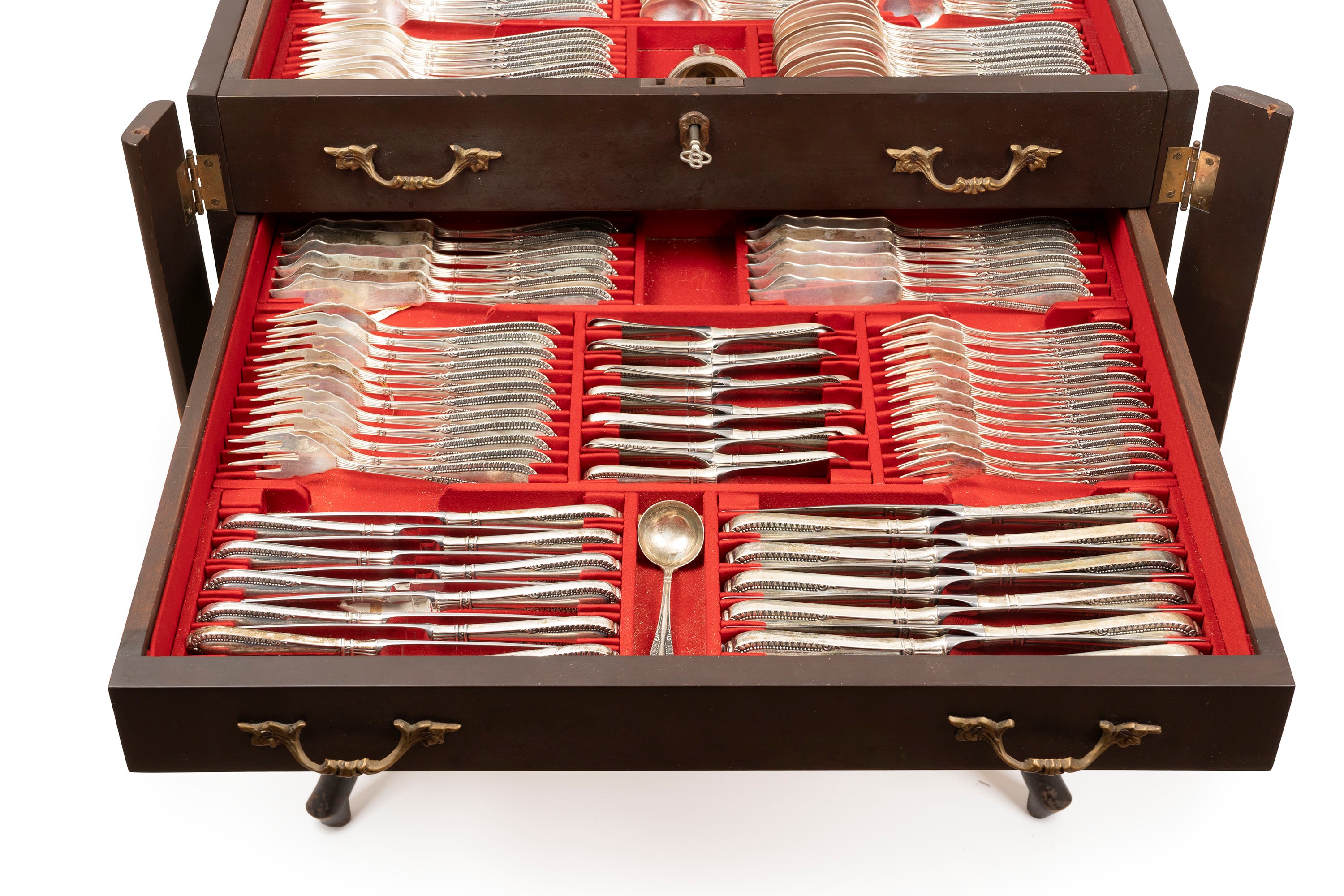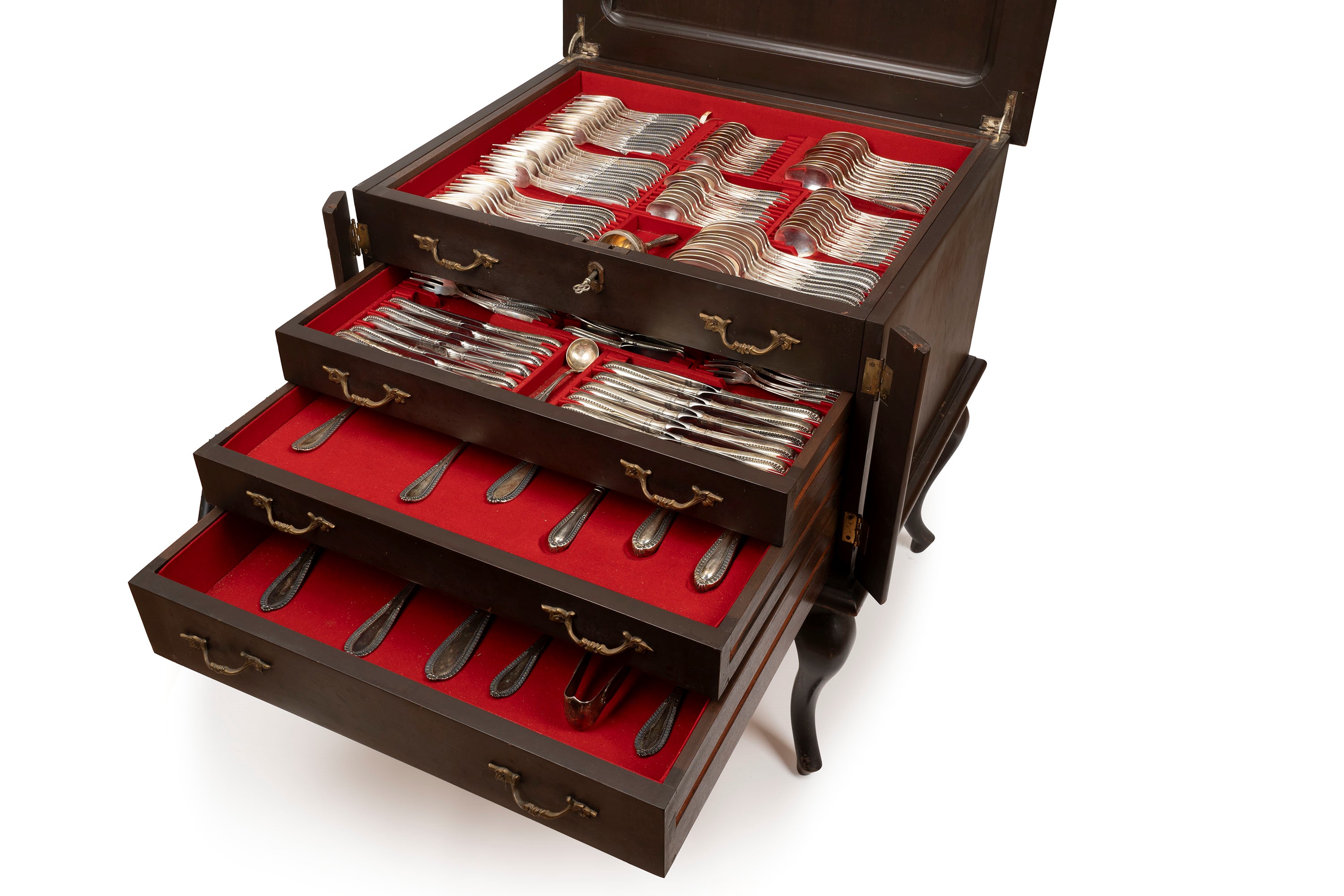 12 cucchiai grandi, 24 forchette grandi, 12 cucchiai dolce, 12 forchette dolce, 12 cucchiai da gelato, 12 cucchiaini da caffè, 12 cucchiai da tè, 24 coltelli grandi, 12 forchette pesce, 12 coltelli pesce, 12 forchette dolce, 12 coltelli da burro, 16 serviti, 1 campanella, con mobiletto in legno;