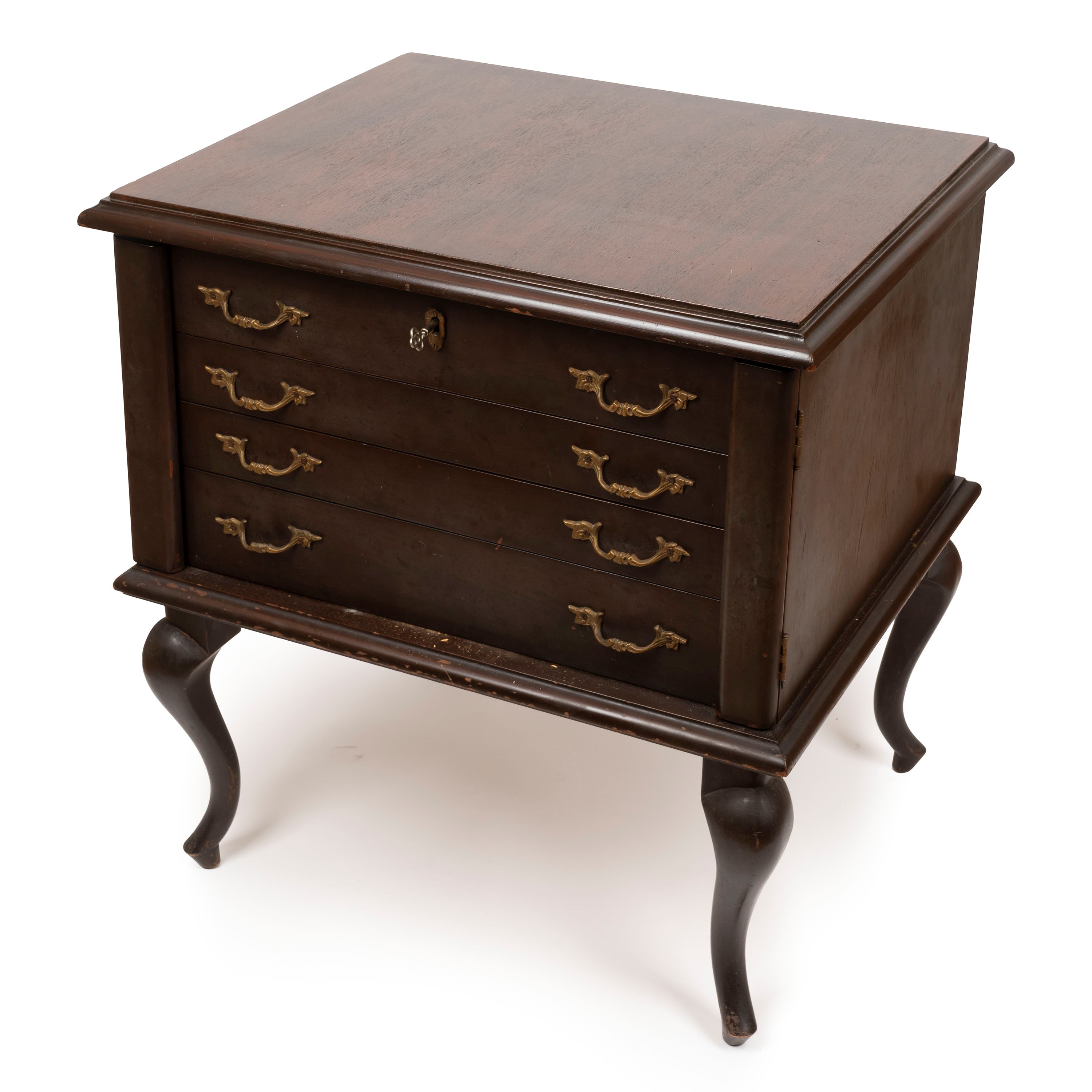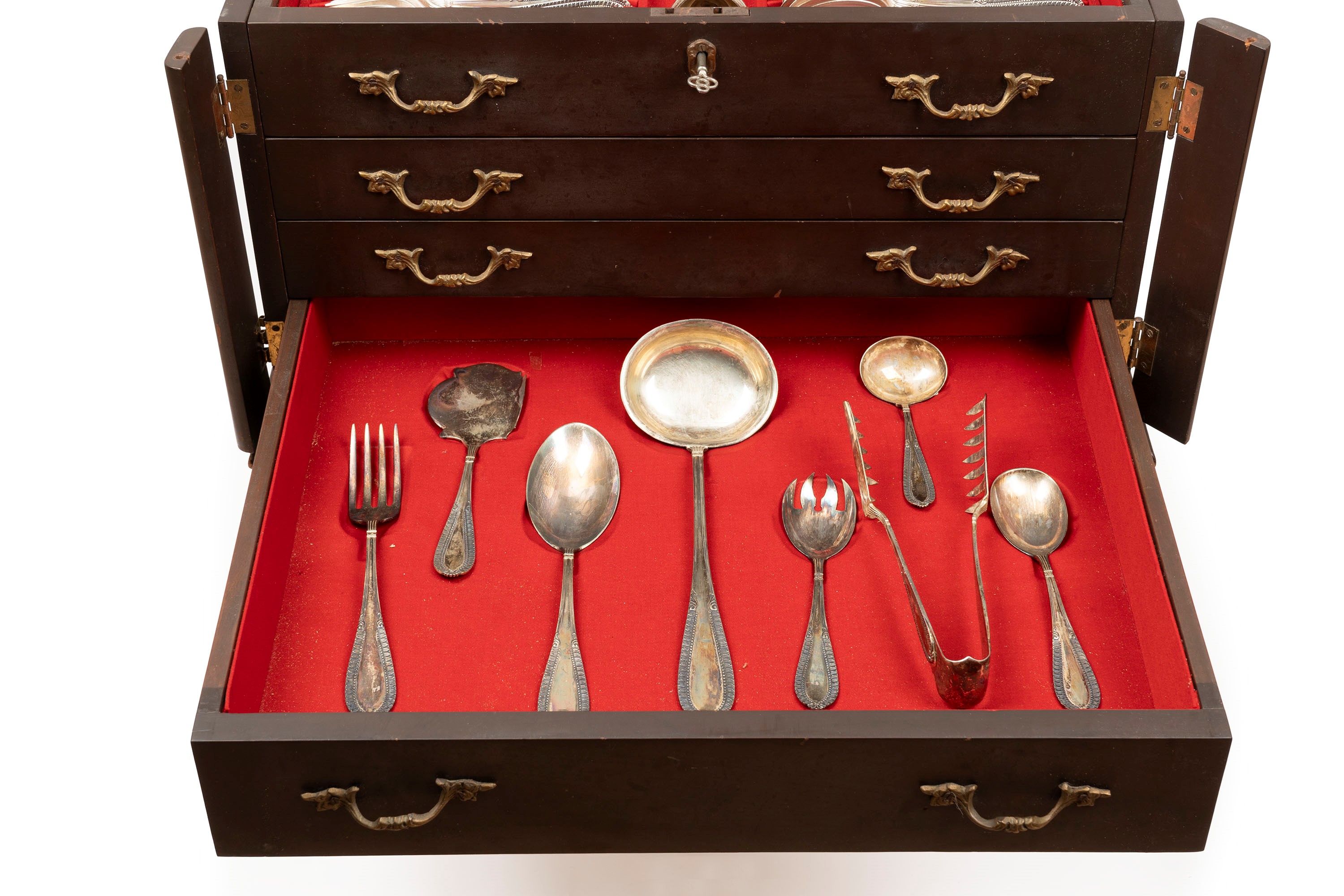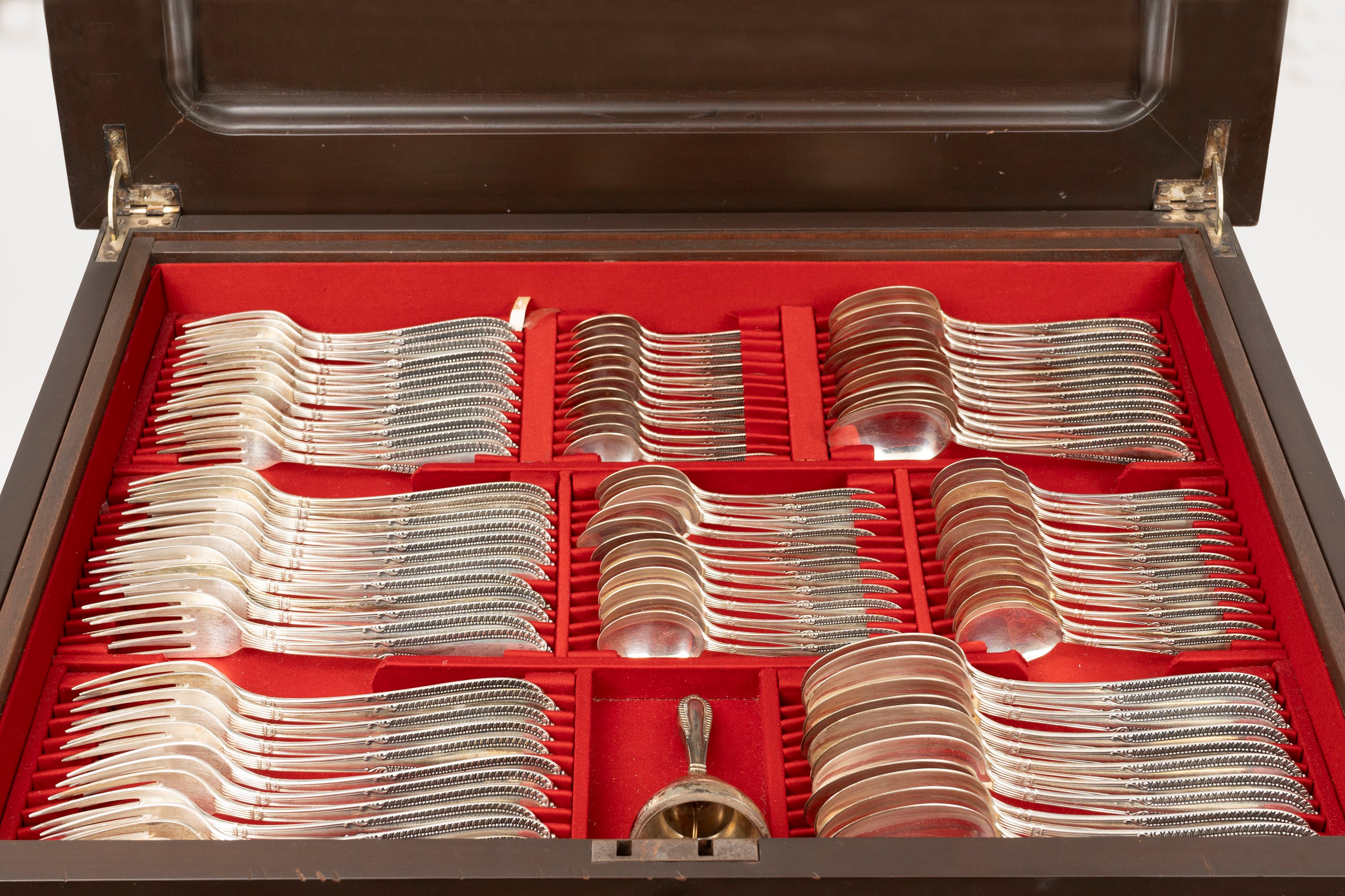 12 cucchiai grandi, 24 forchette grandi, 12 cucchiai dolce, 12 forchette dolce, 12 cucchiai da gelato, 12 cucchiaini da caffè, 12 cucchiai da tè, 24 coltelli grandi, 12 forchette pesce, 12 coltelli pesce, 12 forchette dolce, 12 coltelli da burro, 16 serviti, 1 campanella, con mobiletto in legno;