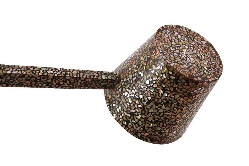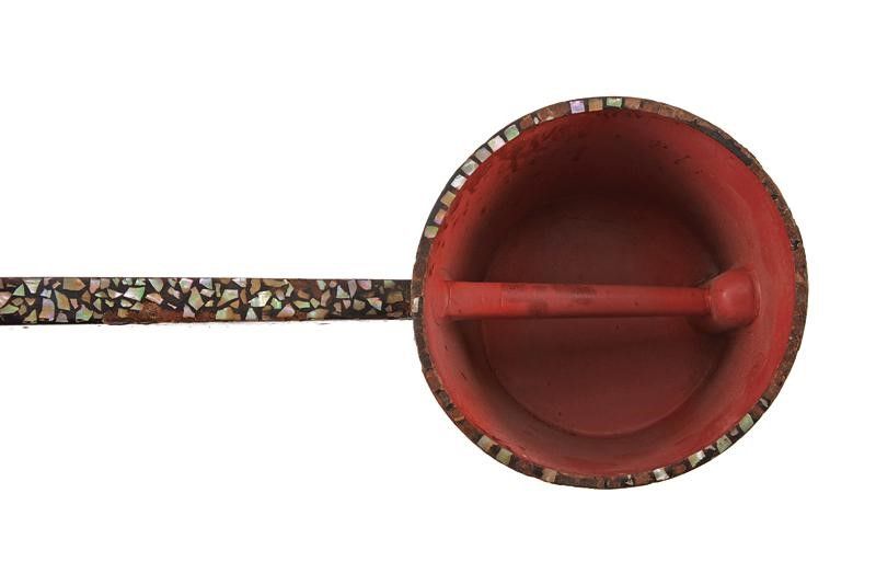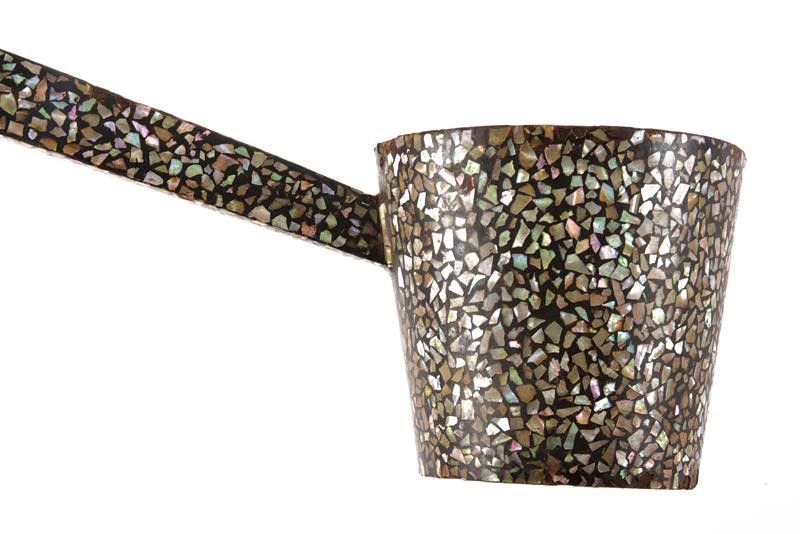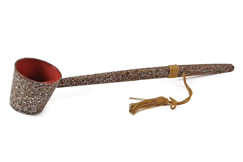 datazione: Periodo Edo (1603-1867) provenienza: Giappone, In legno con coppo troncoconico laccato rosso all'interno, dotato di lungo manico di sezione rettangolare. La superficie esterna tutta rivestita con Raden (lacca nera e decorata con mosaico di tarsie in madreperla, alcune mancanze). Raro. Tardo periodo Edo. Utensile per far abbeverare ai cavalli. lunghezza 61.5 cm.