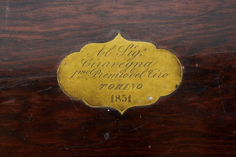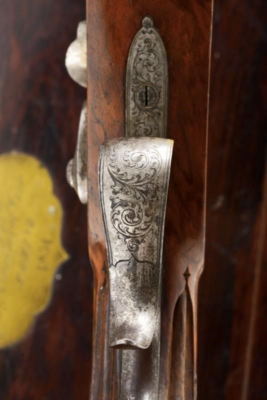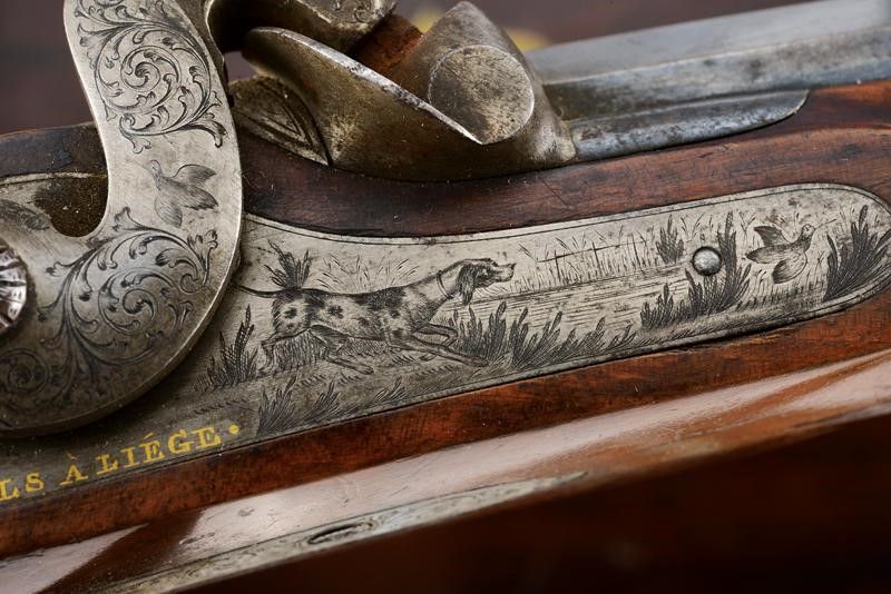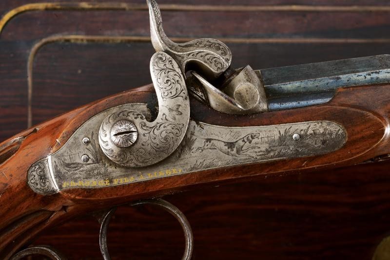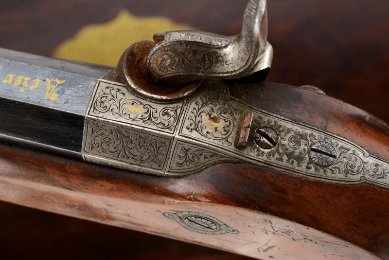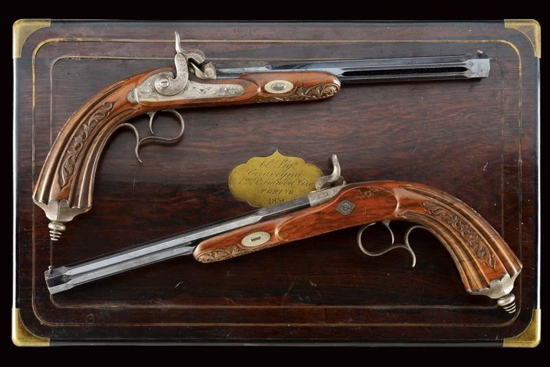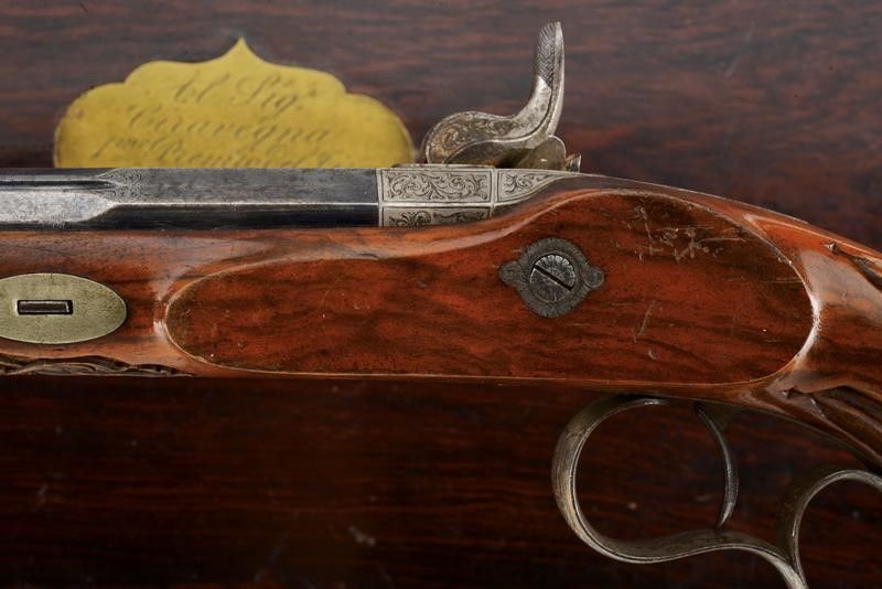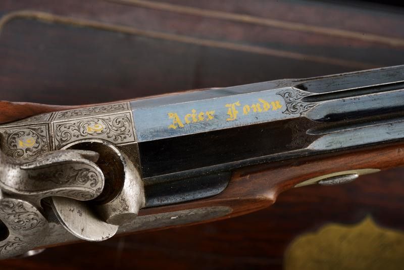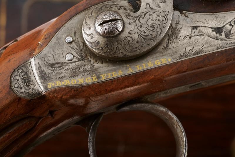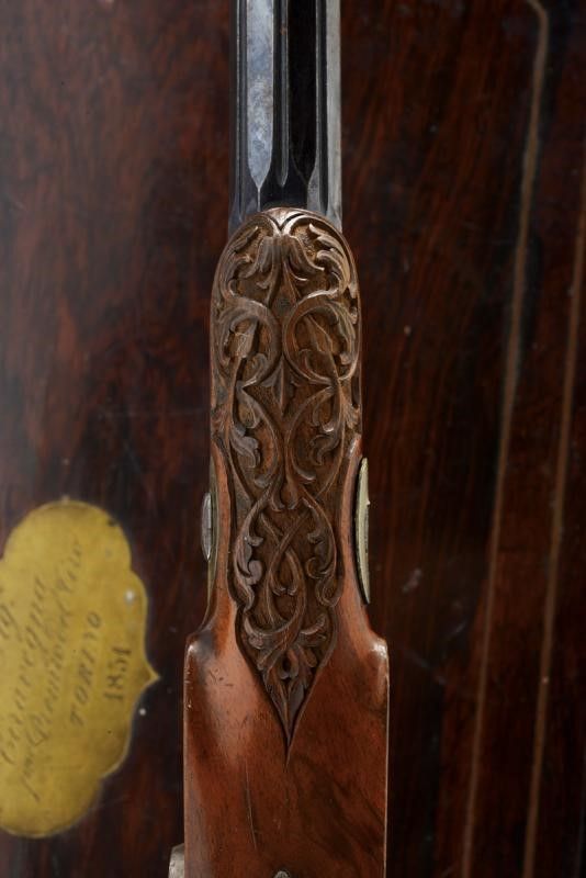 datazione: 1851 provenienza: Liegi, Canne rigate (anima pulita, una con un leggerissimo strato superficiale di ruggine, entrambe con rigatura ben visibile), con estremità ottagonali, area centrale a sette facce e decorata con scanalature, bordi incisi a motivi floreali, basi incise a fiorami e marcate '1' e '2' e con 'Acier Fondu' in oro. Mirini, volate cal. 12 mm. Le codette incise a motivi floreali, dotate di alzo regolabile e numerate en suite. Batterie a molla in avanti firmate in oro 'J. B. RONGÉ Á LIÉGE' e con fini incisioni con scene di caccia. Casse in legno intagliate a fiorami e con calci scanalati. Fornimenti in ferro incisi a motivi floreali, i ponticelli con poggiadito. Nella loro cassetta originale in legno (piccoli danni) con fornimenti in ottone, al dorso del coperchio una placca con iscrizione 'Al Sig.r Ciravegna 1.mo Premio del Tiro. Torino 1851'. Fodera interna in velluto rosso (sbiadito). Completa di tutti gli attrezzi. lunghezza 42 cm.