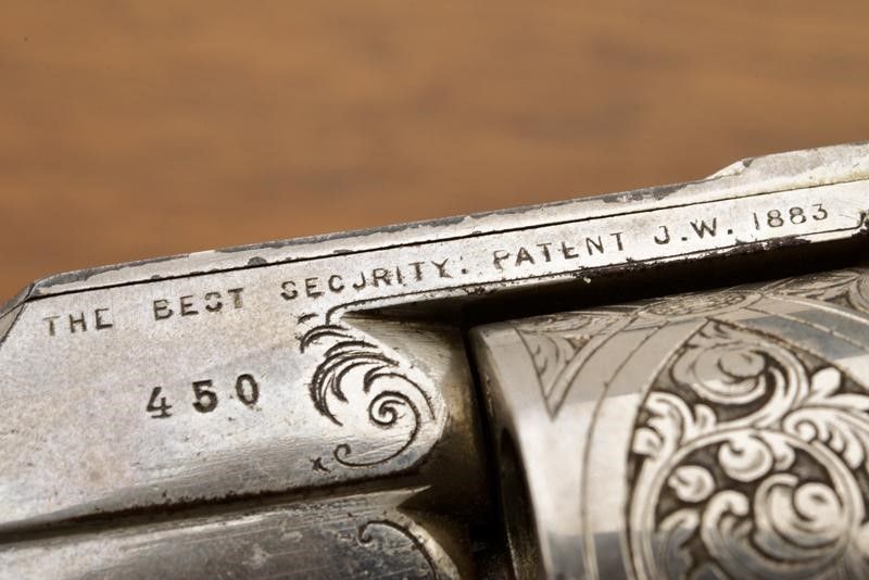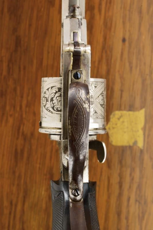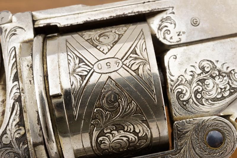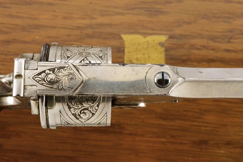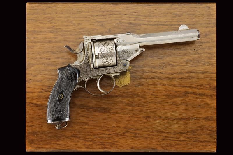 datazione: 1883 provenienza: Belgio, Canna ottagonale, rigata, con mirino a mezzaluna, marcata alla base 'G', 'N' sotto stella, '29' e con calibro 450. Tamburo a sei colpi finemente inciso a motivi floreali su fondo a trattini, con punzone del banco di prova di Liegi, varie volte '29' e con calibro '450'. Castello decorato en suite e recante matricola '357', sul lato sinistro bottone per il caricamento, estrattore automatico. Guancette in gommadura zigrinata ed incisa a motivi floreali. La nichelatura al 90 %. Anello di sospensione. In cassetta di legno foderata all'interno di velluto e con un anello estrattore di riserva. Doata di chiave. lunghezza 28.5 cm.