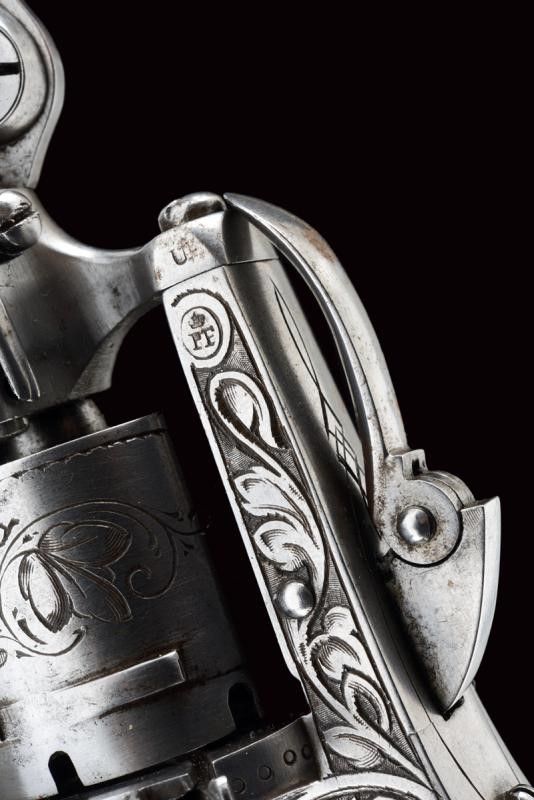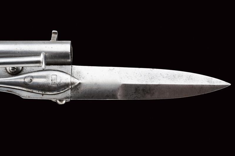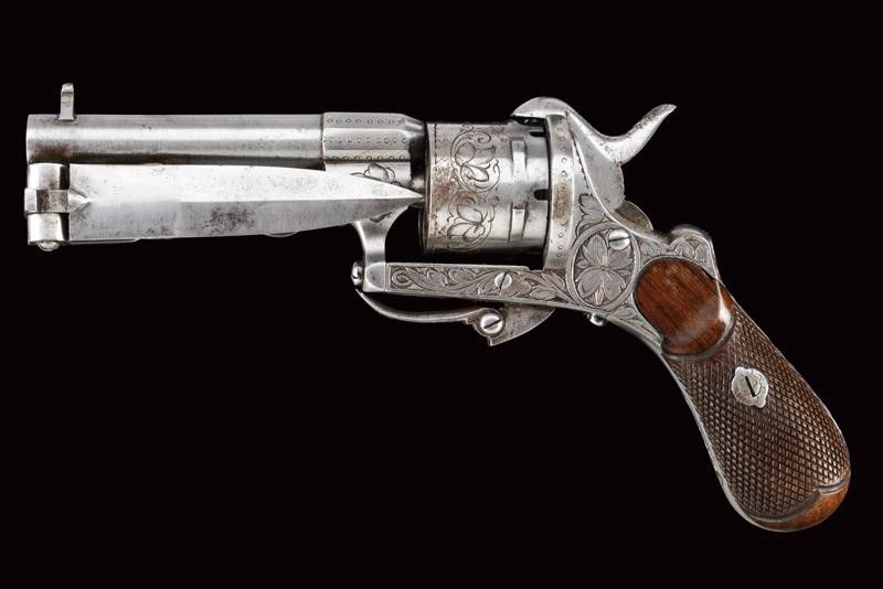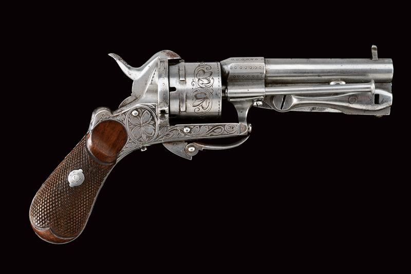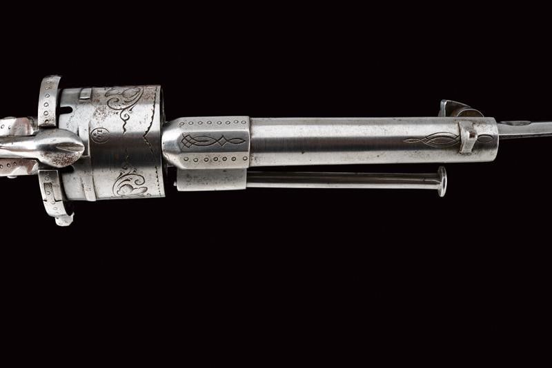 datazione: 1870 circa provenienza: Belgio, Canna tonda, rigata, con base ottagonale decorata a piccoli cerchi ed incisioni anche attorno dell'alto mirino, cal. 7 mm; sotto alla canna una lama di coltello pieghevole a due fili. Tamburo liscio a sei colpi inciso a motivi floreali e con punzone del banco di prova di Liegi. Castello finemente inciso a fogliame su fondo scuro e con punzone 'PF' sotto corona. Estrattore, sportellino di caricamento e grilletto pieghevole. Guancette in legno zigrinato. Raro. lunghezza open 26.5 cm.