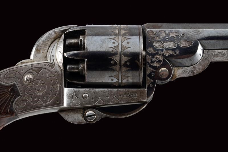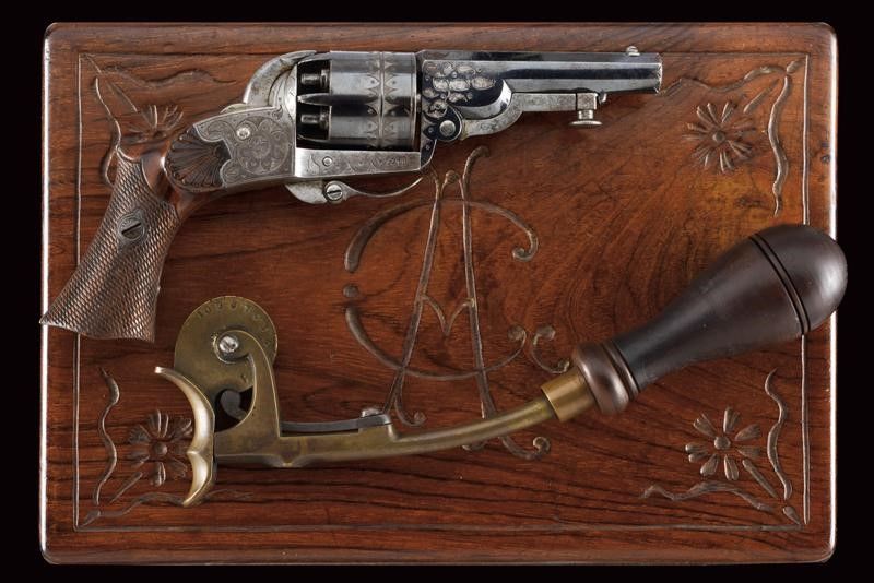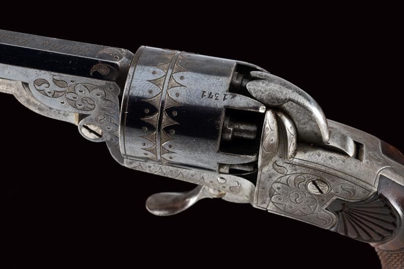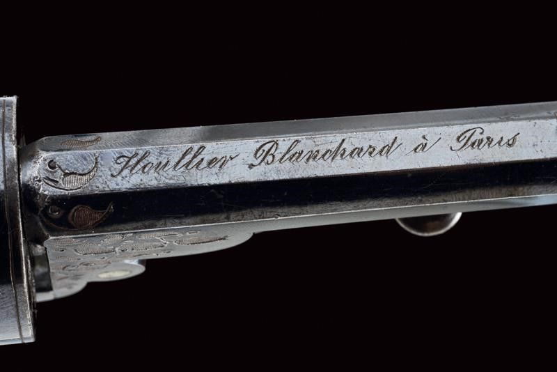 datazione: 1855 circa provenienza: Parigi, Canna ottagonale, rigata, firmata 'Houllier Blanchard à Paris', brunita e finemente incisa alla base e alla volata, con mirino, cal. 8 mm; tamburo a sei colpi inciso e brunito, munito di matricola '13xx'. Cartella incisa e con stessa matricola. Cane piatto. Leva per togliere rapidamente la canna e cambiare il tamburo. Grilletto pieghevole. Calcio a manico di sega con guancette in legno zigrinato e scolpito. In una cassetta di legno rivestita all'interno di velluto bordeaux, munita di bacchetta/svita luminello (difettoso) in ferro e con un raro prova-polvere in ottone con ruota munita di scala ed impugnatura in legno. Per Houllier & Blanchard vedi 'Der Neue Stöckel', vol. I, pag. 549. lunghezza 19 cm.