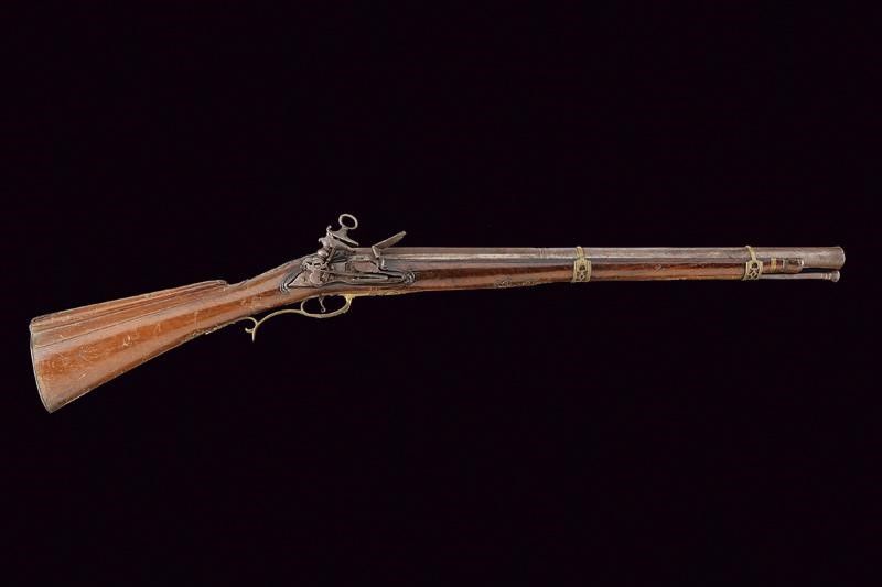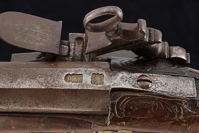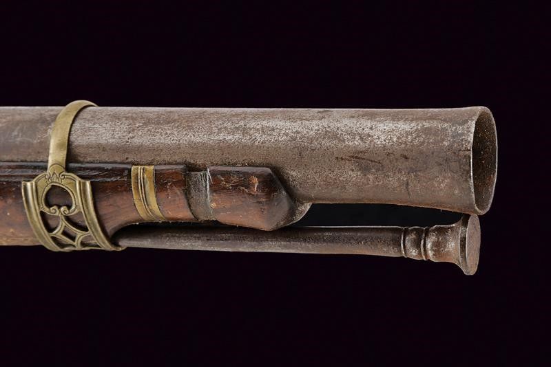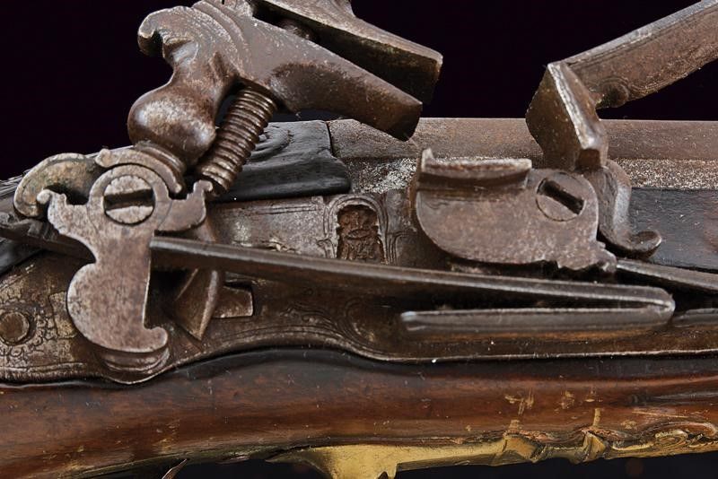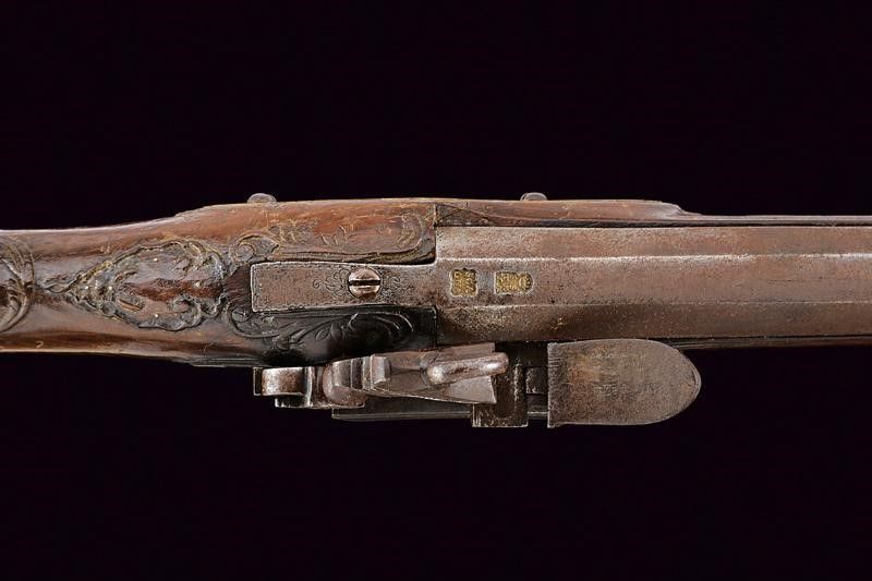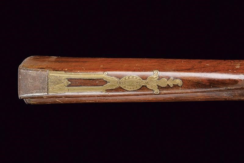 datazione: Fine XVIII inizio XIX Secolo provenienza: Napoli, Canna liscia a due ordini, ottagonale e tonda recante alla base punzoni rimessi in ottone, uno coronato uno con lettere 'SCA / GN', munita di anellatura e cornicetta intagliate al cambio, e con volata leggermente strombata, cal. 24 mm. Codolo con cornicetta incisa. Batteria alla micheletta con profondo timbro della manifattura sulla cartella, recante piccole incisioni e delineature. Meccanica funzionante. Cassa intera in legno con intagli floreali vicino ai fornimenti. Bacchetta in ferro. Fornimenti in ottone con resti di antica doratura e incisioni floreali. Il calciolo in ottone e ferro. Contropiastra e reggicanna ornati anche a traforo. lunghezza 102 cm.