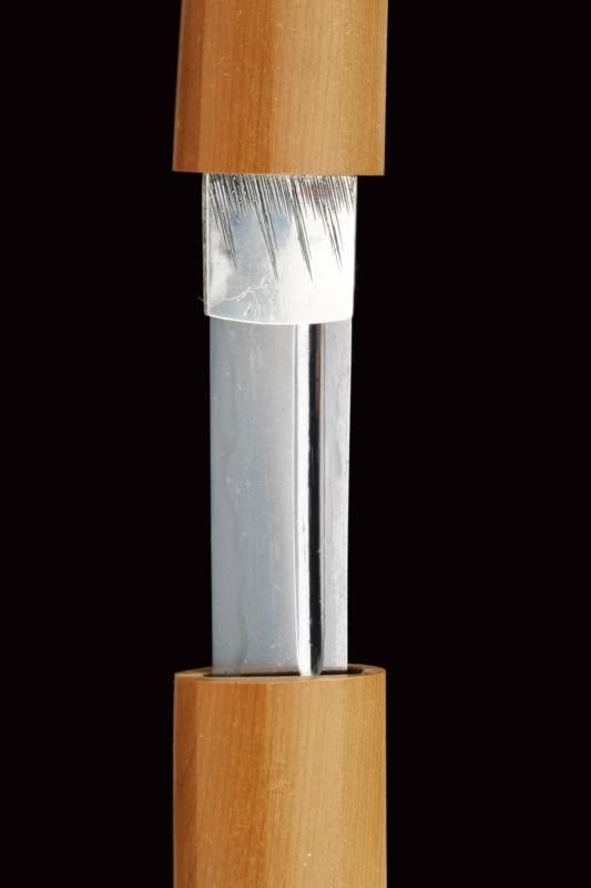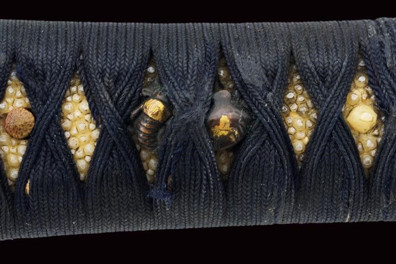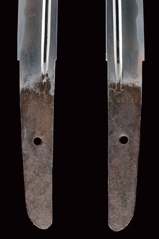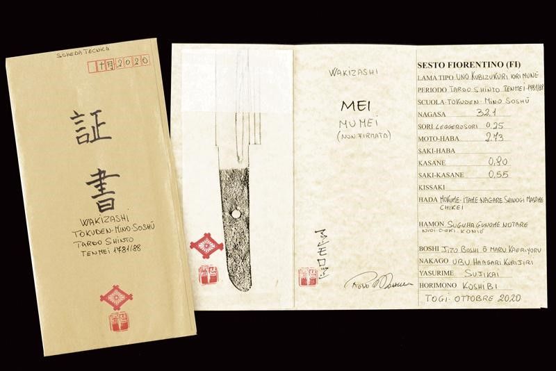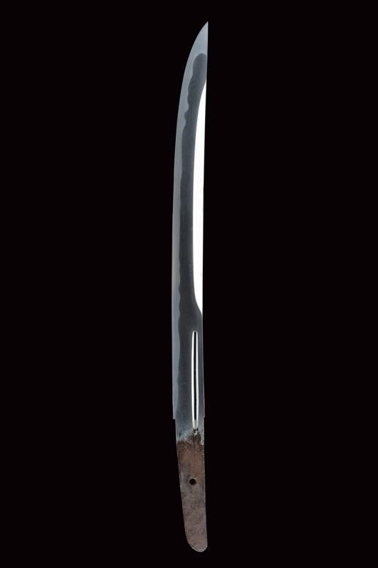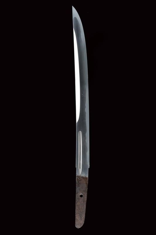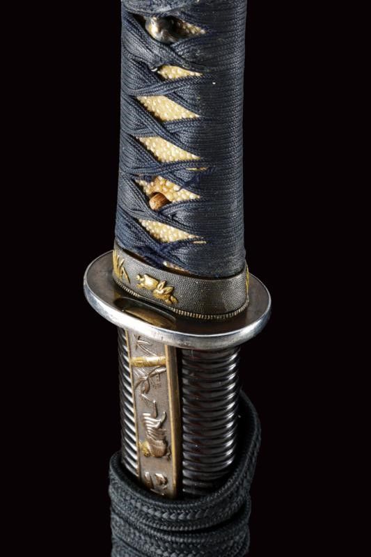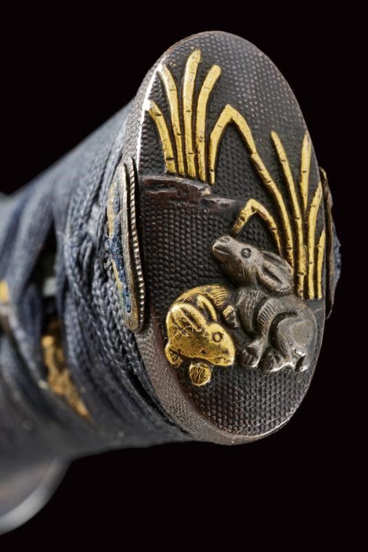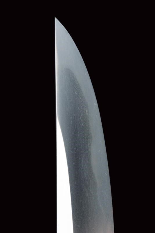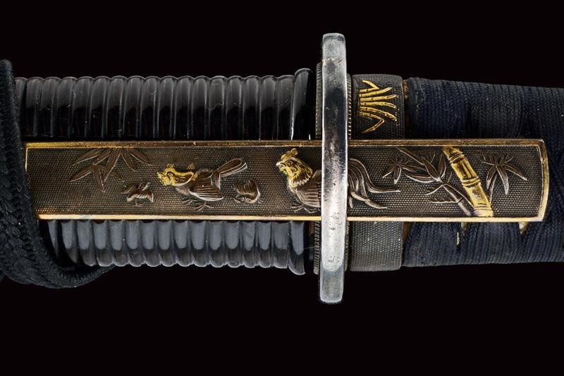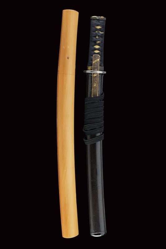 datazione: Periodo Edo (1603-1867) provenienza: Giappone, Uno kubi zukuri iori mune. Nagasa (lung. 32.1 cm), hada: mokume itame nagare shinogi masame chikei; hamon: suguha gunome notare nioi-deki-ko-nie; boshi: jizo boshi o maru kaeri yoru; horimono: koshibi; habaki in argento. Nakago: ubu haagari kurijiri, un mekugi-ana; yasurime: sujikai. Koshirae con tsuba in shakudo, naga-maru-gata, uchi-gaeshi-mimi; fuchi-kashira in shakudo, niku-bori su nanako annerito; menuki parzialmente dorati. Tsuba in lacca nera, la parte superiore a spire. Kozuka mumei con impugnatura in ottone decorata con volatili e piante di bambù. Con scheda tecnica di M. Rossi. Epoca: tardo periodo Shinto Tenmei 1781/88. lunghezza 48.5 cm.