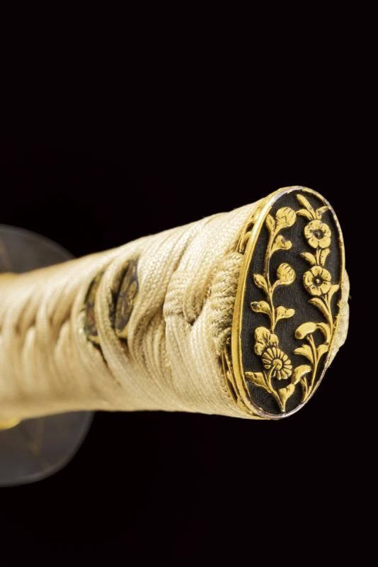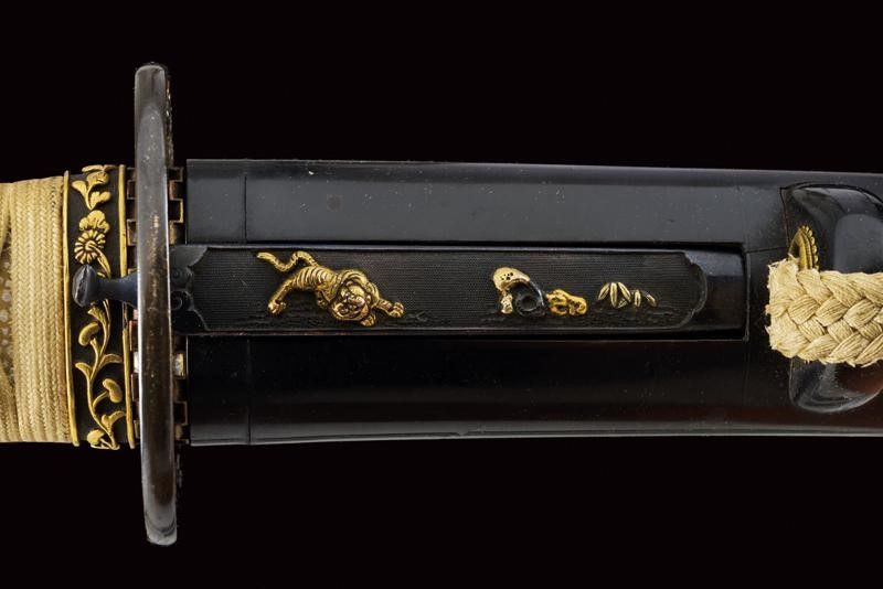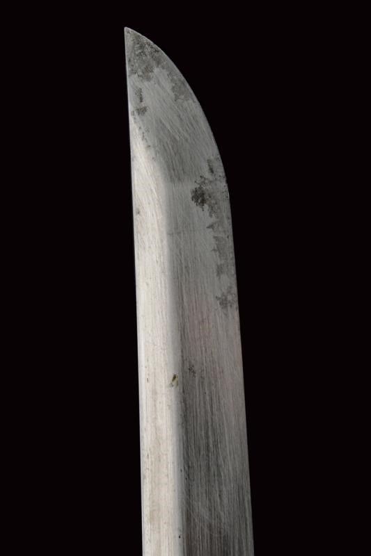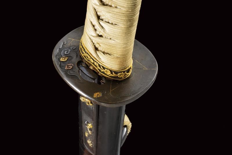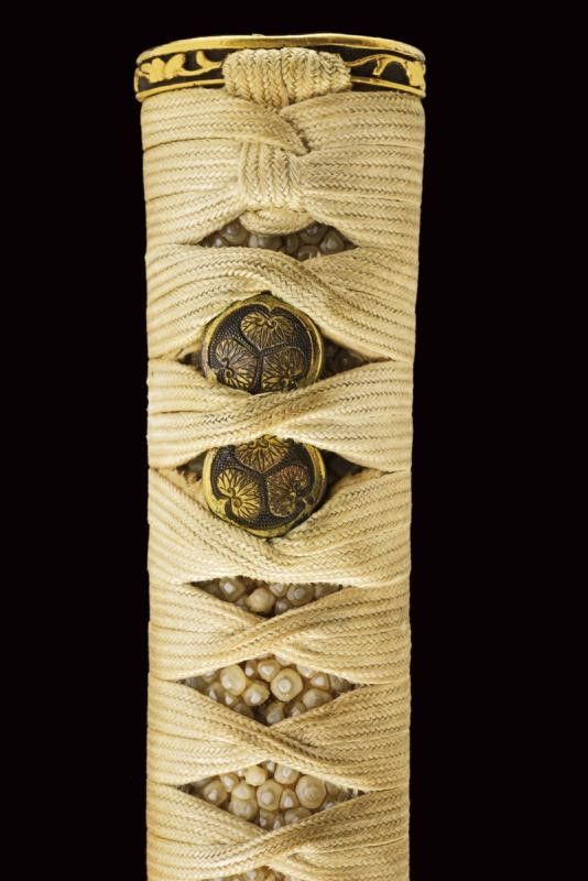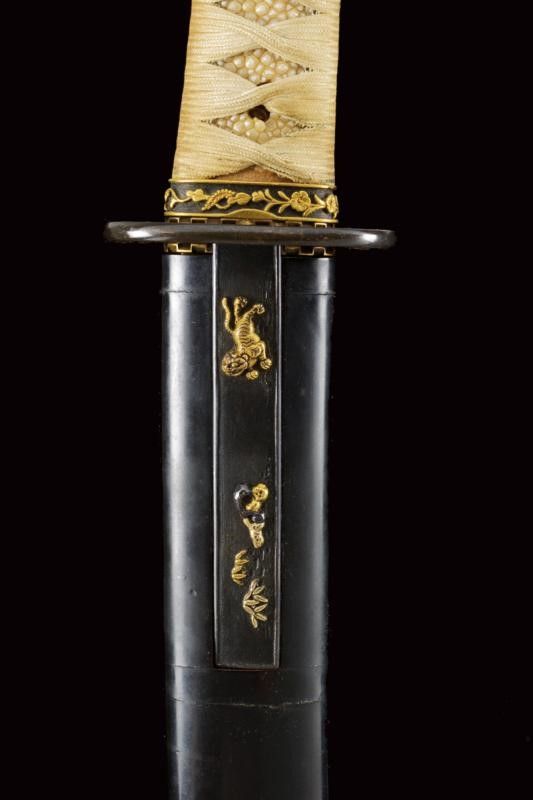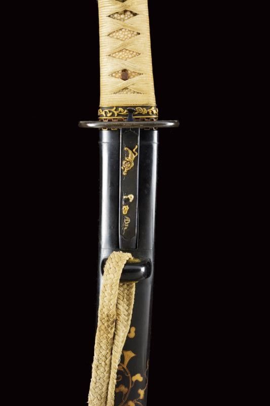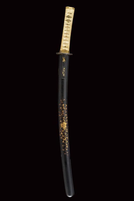 datazione: Periodo Muromachi (1392-1573) provenienza: Giappone, Nagasa (lung. 49.2 cm), shinogi zukuri iorimune; hada: mokume (poco visibile); hamon: suguha nioi deki; boshi: suguha komaru; habaki in rame. Nakago: ubu-ha magari kurijiri yasuri kattesagari; mei firmata e datata su entrambi i lati 'Bishu Osafune Tadamitsu Saku' e 'Bunmei go non achigatsu hi 1473' con un mekugi-ana. Bel koshirae, la tsuba in shakudo con fini incisioni a nuvole parzialmente rimesse in rame o dorate. Fuchi-kashira sempre in shakudo decorati a motivi floreali in bassorilievo rimessi in oro su fondo nero. Menuki con doppio mon Tokugawa. Impugnatura rivestita in same con tsuka in seta bianca. Bella saya in legno laccato di nero e decorata in oro a motivi floreali, munita di kozuka mei 'Minamoto Hiro Tsugo' decorato con una tigre e a motivi floreali, kogai decorato en suite. Laccio in seta di sospensione. Interessante wakizashi con lama in buono stato ma che merita una pulitura professionale. lunghezza 69.5 cm.