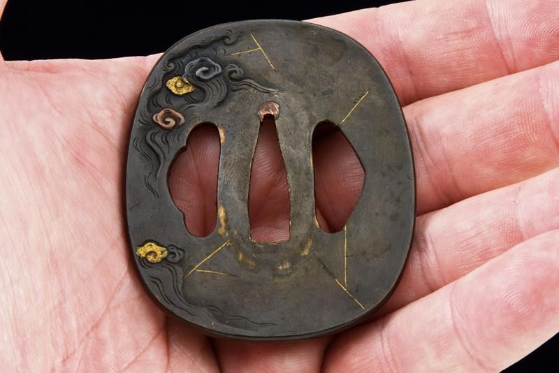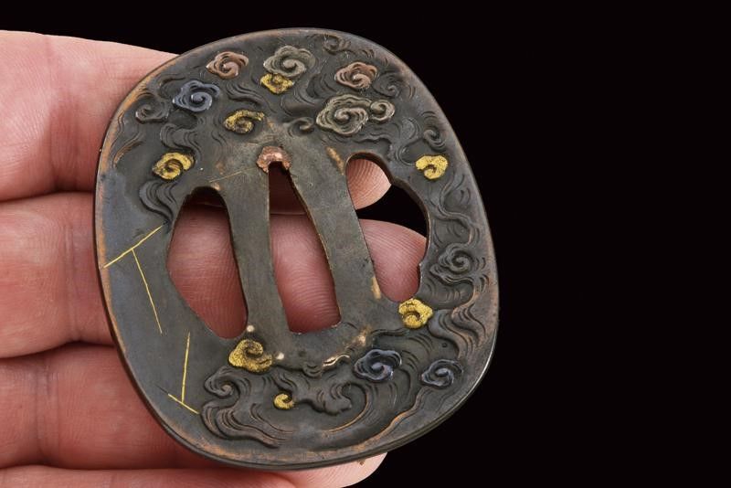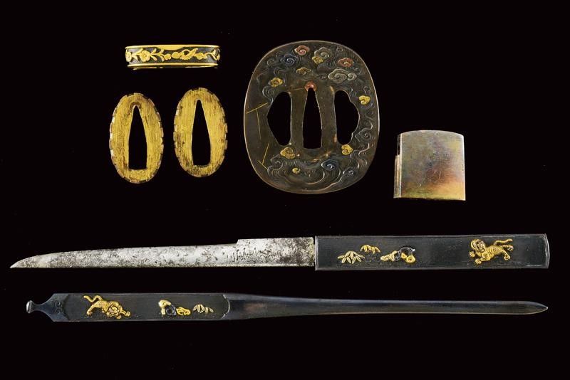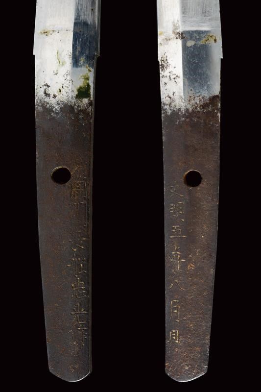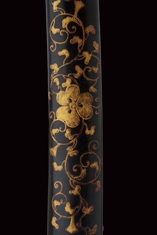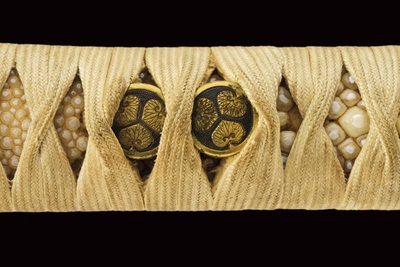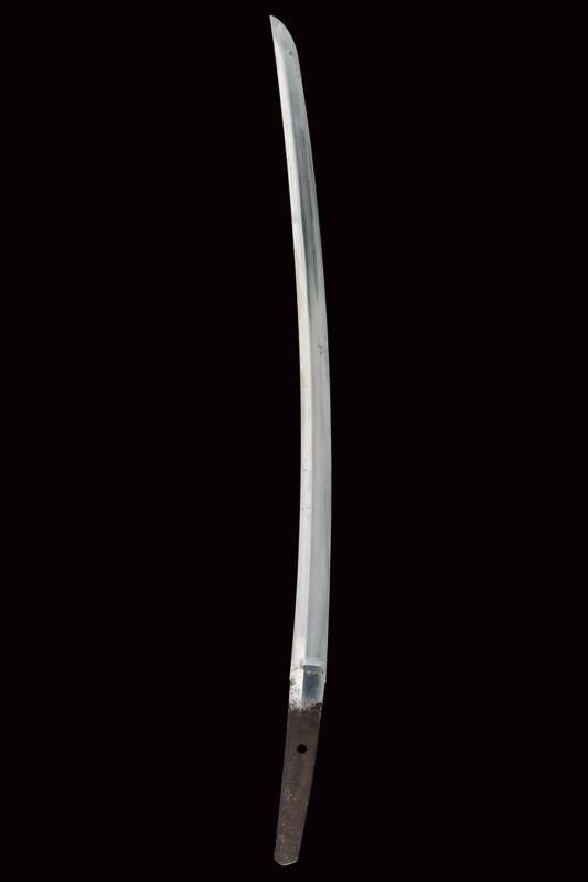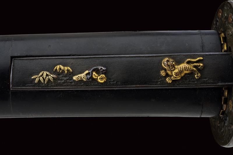 datazione: Periodo Muromachi (1392-1573) provenienza: Giappone, Nagasa (lung. 49.2 cm), shinogi zukuri iorimune; hada: mokume (poco visibile); hamon: suguha nioi deki; boshi: suguha komaru; habaki in rame. Nakago: ubu-ha magari kurijiri yasuri kattesagari; mei firmata e datata su entrambi i lati 'Bishu Osafune Tadamitsu Saku' e 'Bunmei go non achigatsu hi 1473' con un mekugi-ana. Bel koshirae, la tsuba in shakudo con fini incisioni a nuvole parzialmente rimesse in rame o dorate. Fuchi-kashira sempre in shakudo decorati a motivi floreali in bassorilievo rimessi in oro su fondo nero. Menuki con doppio mon Tokugawa. Impugnatura rivestita in same con tsuka in seta bianca. Bella saya in legno laccato di nero e decorata in oro a motivi floreali, munita di kozuka mei 'Minamoto Hiro Tsugo' decorato con una tigre e a motivi floreali, kogai decorato en suite. Laccio in seta di sospensione. Interessante wakizashi con lama in buono stato ma che merita una pulitura professionale. lunghezza 69.5 cm.