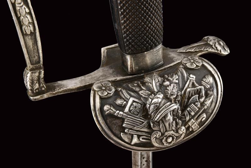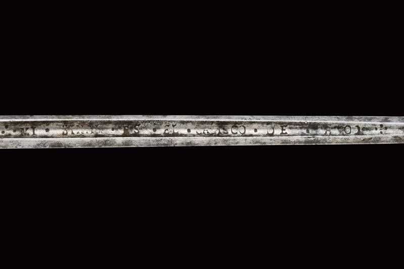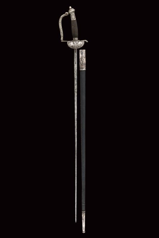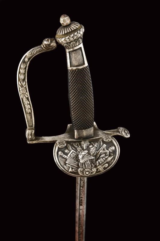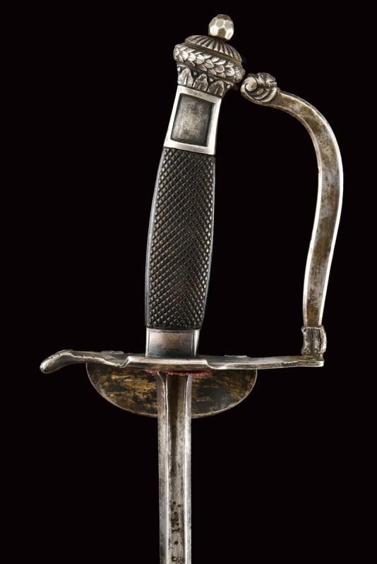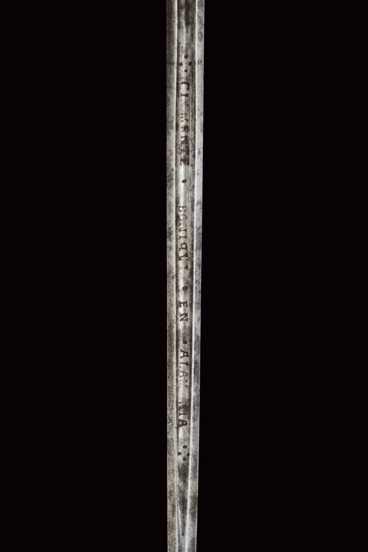 datazione: 1810 circa provenienza: Regno Italico, Sottile lama di sezione esagonale, allargata nella prima parte e con scanalatura recante iscrizioni non del tutto leggibili, su un lato la marcatura 'CLEMENTE BONIQ... EN ALAM.NIA'. Bellissimo fornimento in argento massiccio, la pelta con trofei in rilievo; braccio di parata, ramo di guardia e pomo a motivi floreali. Impugnatura in legno zigrinato. Completo di fodero in cuoio con fornimenti in argento. lunghezza 91 cm.
