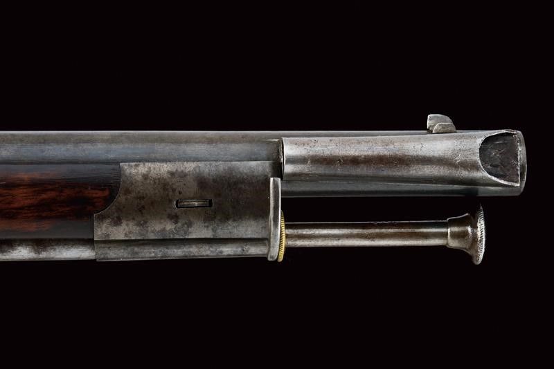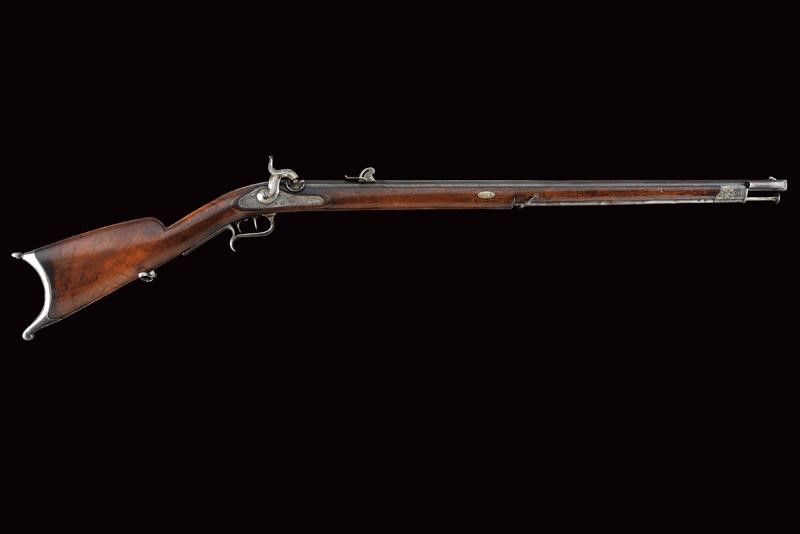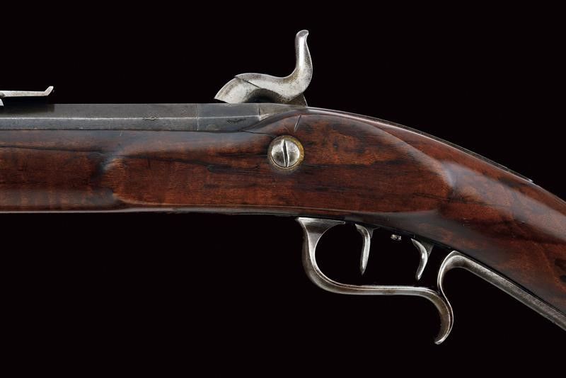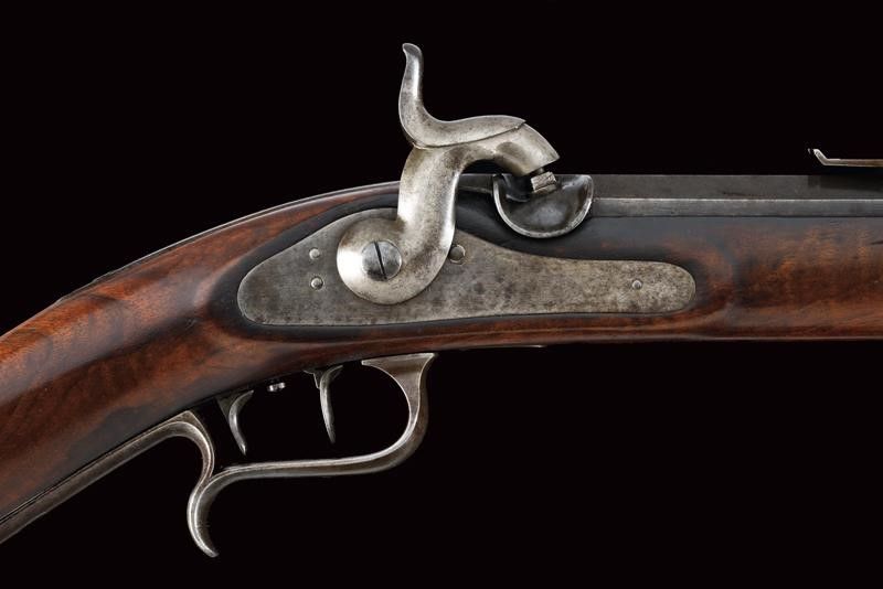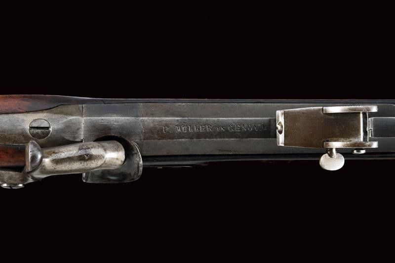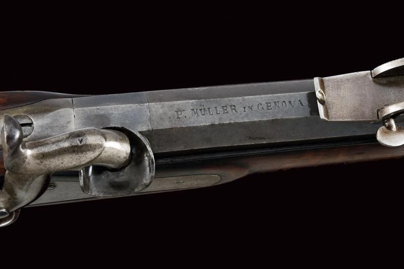 datazione: Metà del XIX Secolo provenienza: Genova, Canna rigata a due ordini, prima ottagonale con firma 'MÜLLER in GENOVA' e munita di alzo variabile, poi tonda con mirino di precisione e attacco per la baionetta, cal. 11 mm; lunga codetta liscia; batteria a molla in avanti con cartella piatta. Cassa intera con fornimenti e bacchetta in ferro. Ponticello con poggiadito. Stecher. lunghezza 126.5 cm.