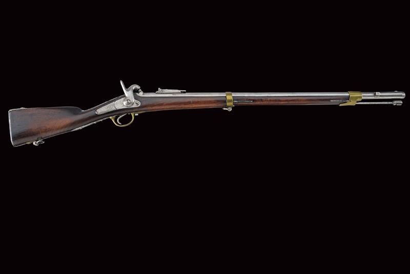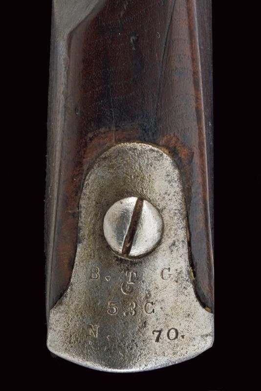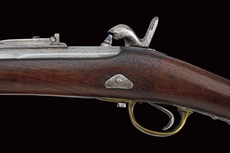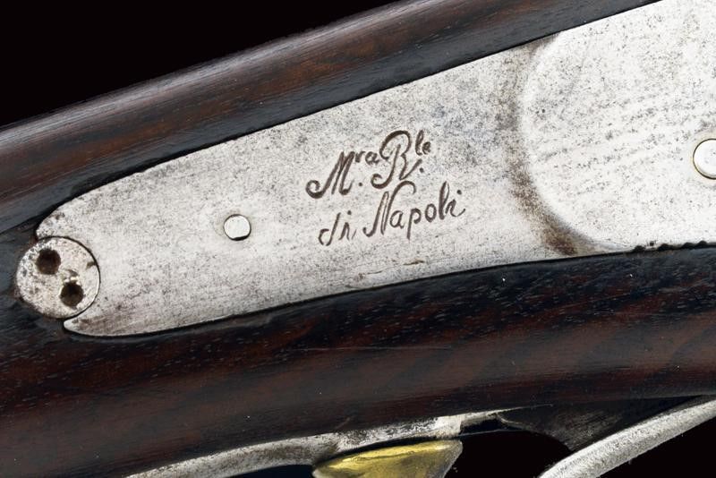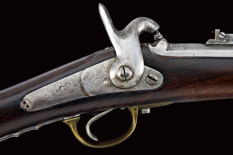 datazione: 1852 provenienza: Napoli, Canna tonda con base ottagonale, rigata (anima con pitting, rigatura solo in qualche punto ancora visibile), munita di alzo variabile e abbattibile, mirino e attacco per la baionetta marcata '6', cal. 17.5 mm; batteria a molla indietro firmata 'M.re R.le di Napoli', all'interno datata '1852'; cassa intera in legno (con timbro 'RM' sul calcio lato sinistro) con fornimenti in ottone e ferro, il calciolo marcato 'B.T.G / 5 C / N 70'. Bacchetta in ferro. Rara. Vedi 'L'esercito Borbonico dal 1830 al 1861' Boeri/Crociani/Fiorentino, Rome 1998, pagine 176/7 lunghezza 125 cm.