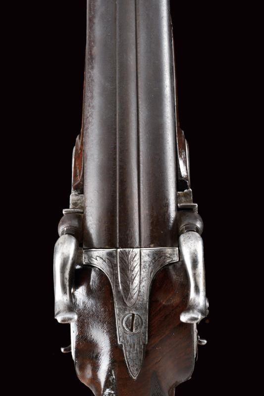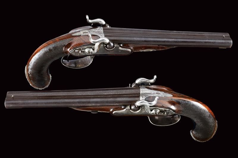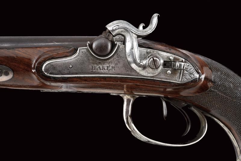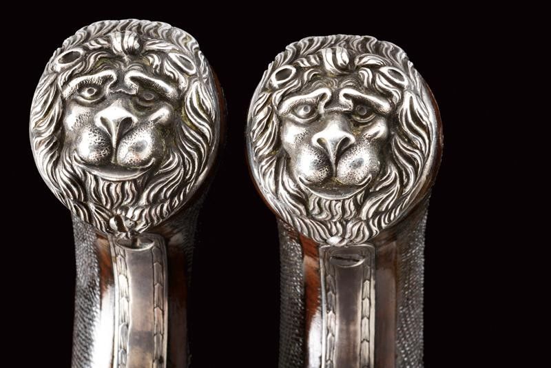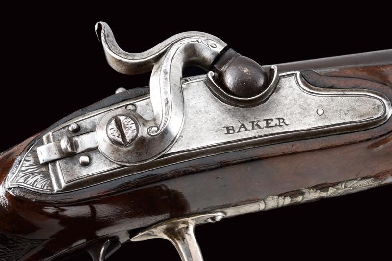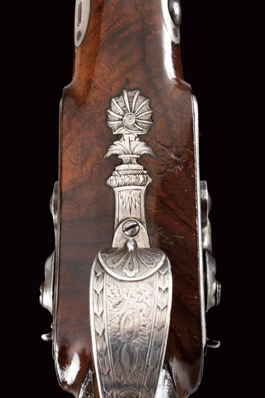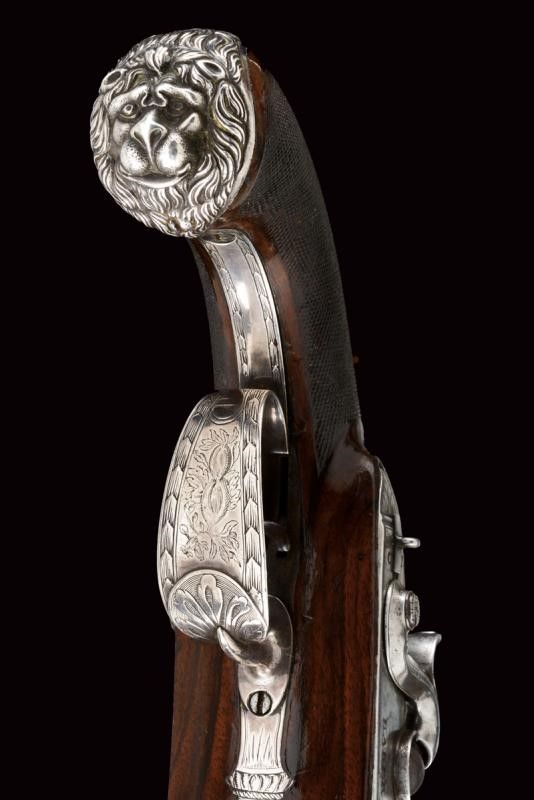 datazione: 1840 circa provenienza: Inghilterra, Canne tonde, lisce, giustapposte, con bindella e mirino, cal 14 mm; codette incise e munite di traguardo. Batterie a molla in avanti firmate 'BAKER' parzialmente incise e dotate di sicura. Casse in legno con calcio zigrinato. Bellissimi fornimenti in argento con cocce sbalzate a testa di leone e con ponticelli riccamente incisi a motivi floreali. Bacchette in legno con battipalla in argento. lunghezza 37.5 cm.