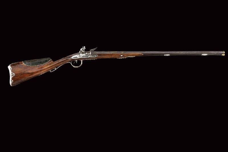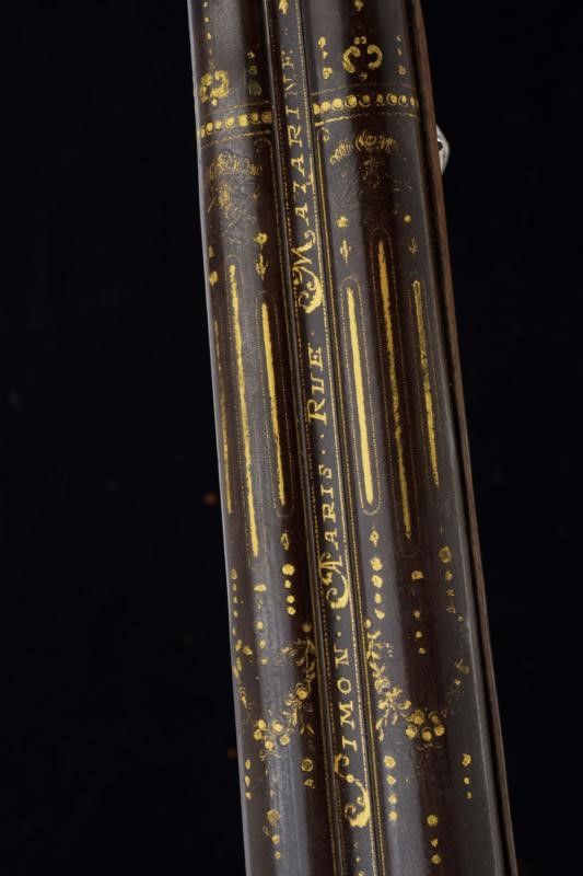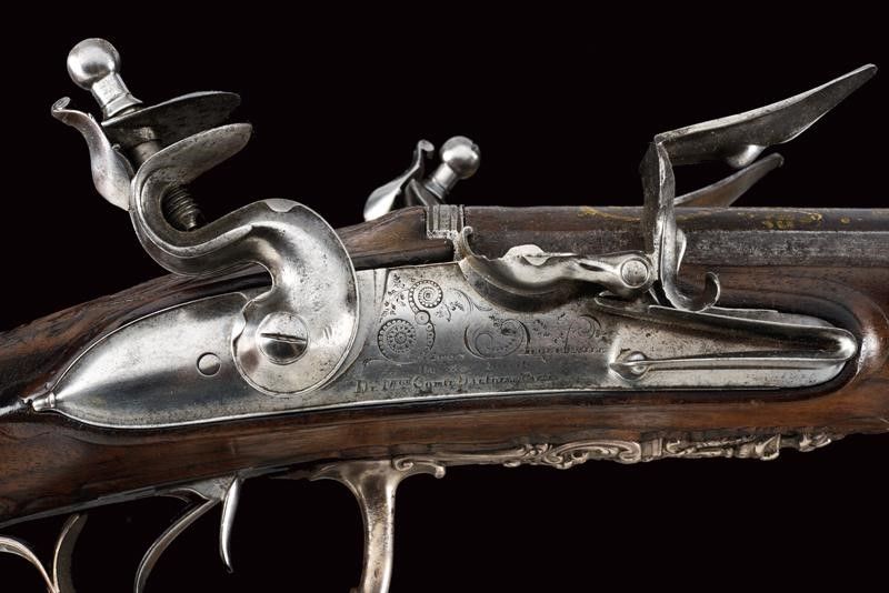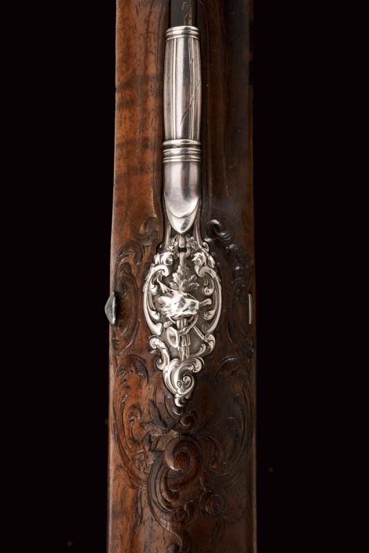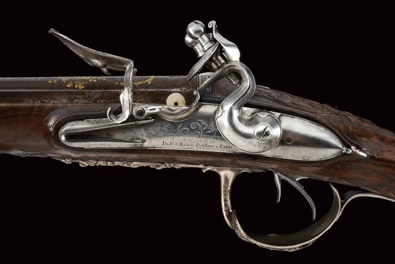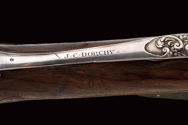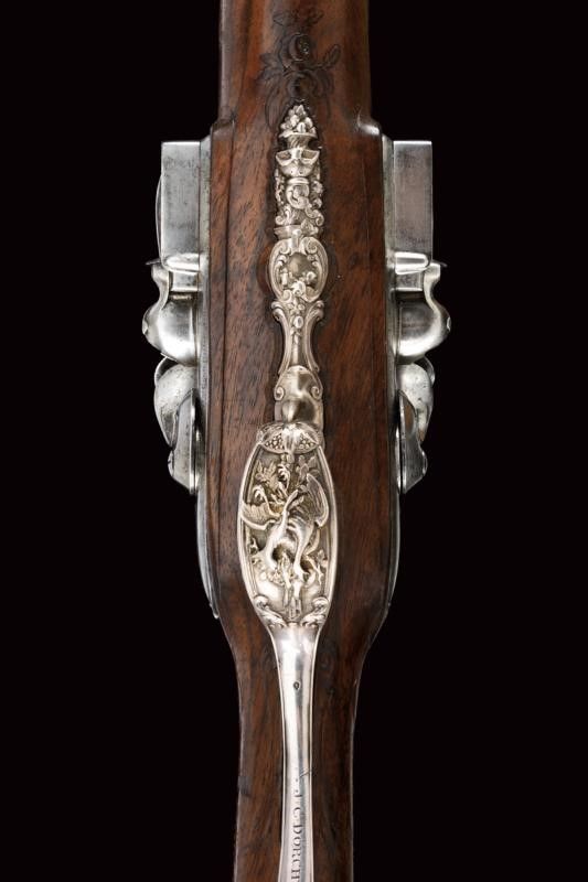 datazione: fine del XVIII Sec. provenienza: Parigi, Canne tonde lisce, recanti punzoni alla base, con bindella marcata 'SIMON PARIS RUE MAZARINE' e decorata a motivi floreali in oro, munita di mirino in argento con raggi in oro, cal. 14,5 mm. Codetta incisa e dotata di traguardo. Batterie a pietra firmate 'SIMON ARQUEBUSIER DU ROY BREVETE E DE MGR. COMTE D'ARTOIS PARIS'; mezza cassa in legno, scolpita a motivi floreali; bellissimi fornimenti in argento con trofei di caccia e fiorami in alto e bassorilievo; ponticello marcato con il nome del proprietario 'J. C. DORCHY'; punzoni. Dorso del calcio munito di cuscino ricoperto di pelle. Bacchetta in legno con cavastracci in ferro e battipalla in ottone. Charles Simon è documentato dal 1765 al 1796, diventa Maestro nel 1765. Lavorò per Luigi XVI e Carlo X. 'Der Neue Stockel', Vol. II pag.1172. lunghezza 121 cm.