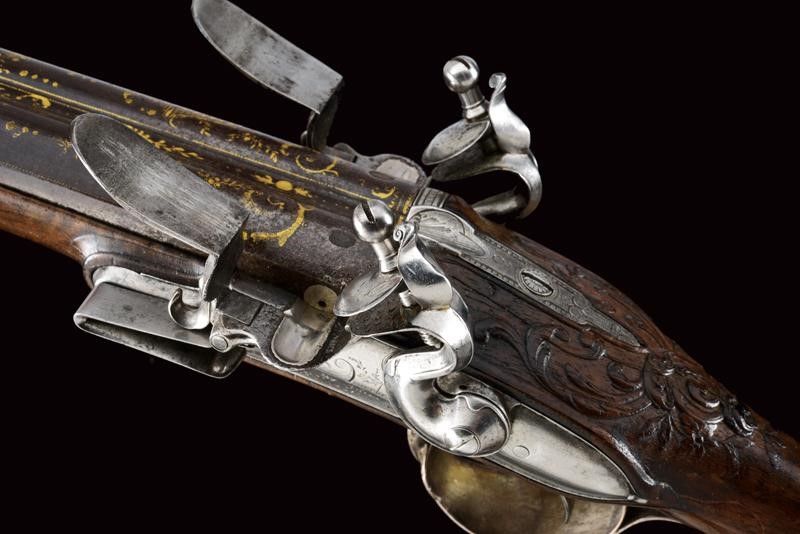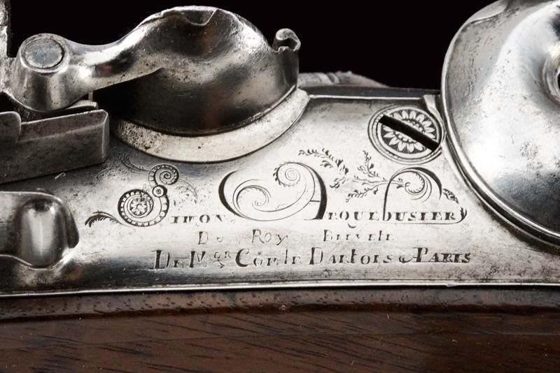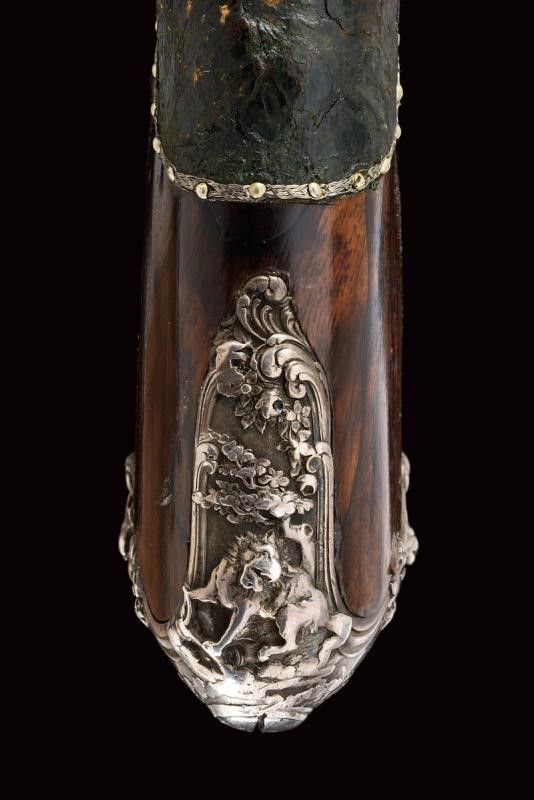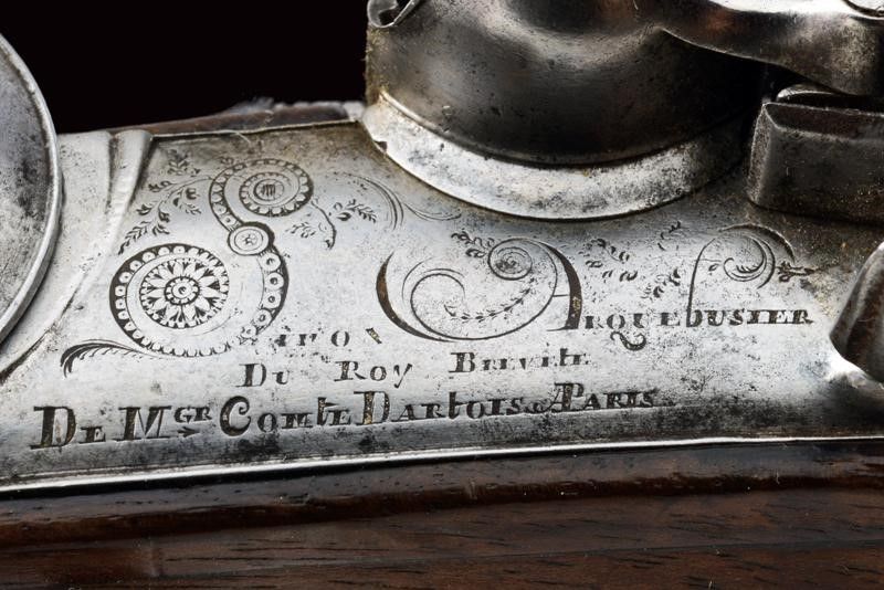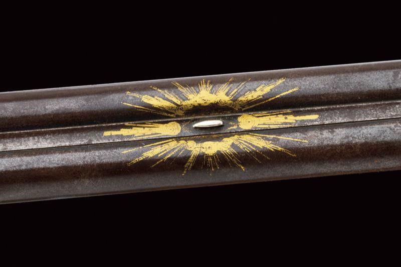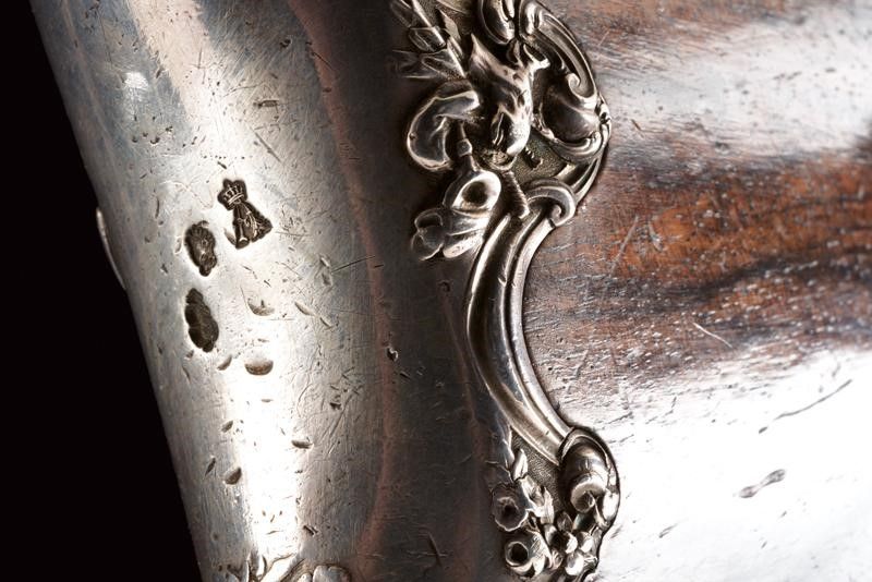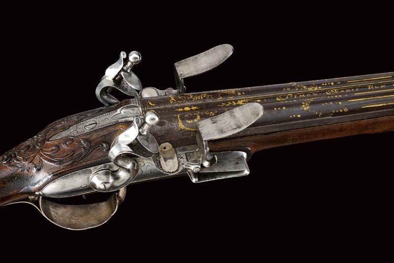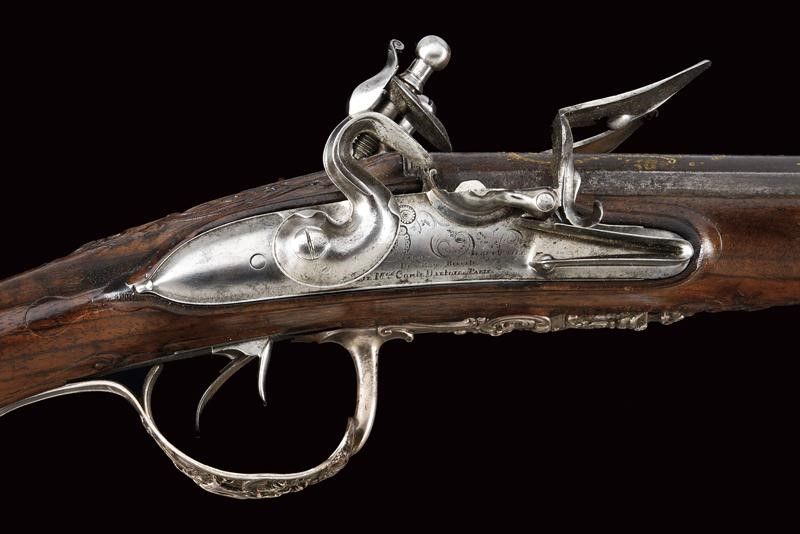 datazione: fine del XVIII Sec. provenienza: Parigi, Canne tonde lisce, recanti punzoni alla base, con bindella marcata 'SIMON PARIS RUE MAZARINE' e decorata a motivi floreali in oro, munita di mirino in argento con raggi in oro, cal. 14,5 mm. Codetta incisa e dotata di traguardo. Batterie a pietra firmate 'SIMON ARQUEBUSIER DU ROY BREVETE E DE MGR. COMTE D'ARTOIS PARIS'; mezza cassa in legno, scolpita a motivi floreali; bellissimi fornimenti in argento con trofei di caccia e fiorami in alto e bassorilievo; ponticello marcato con il nome del proprietario 'J. C. DORCHY'; punzoni. Dorso del calcio munito di cuscino ricoperto di pelle. Bacchetta in legno con cavastracci in ferro e battipalla in ottone. Charles Simon è documentato dal 1765 al 1796, diventa Maestro nel 1765. Lavorò per Luigi XVI e Carlo X. 'Der Neue Stockel', Vol. II pag.1172. lunghezza 121 cm.