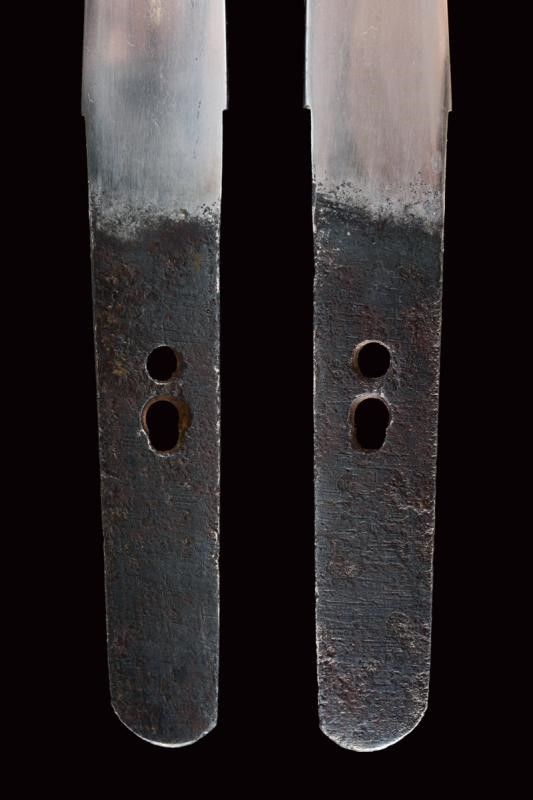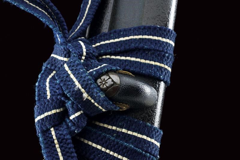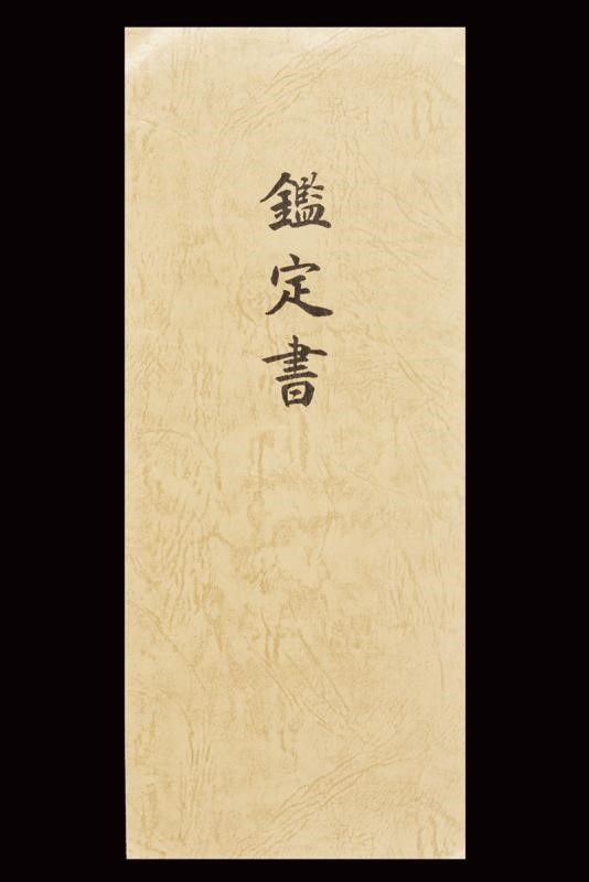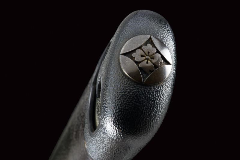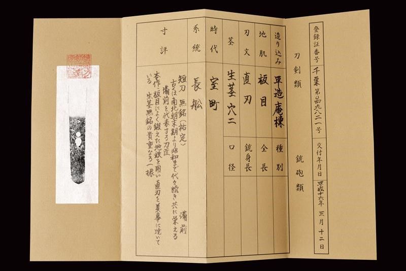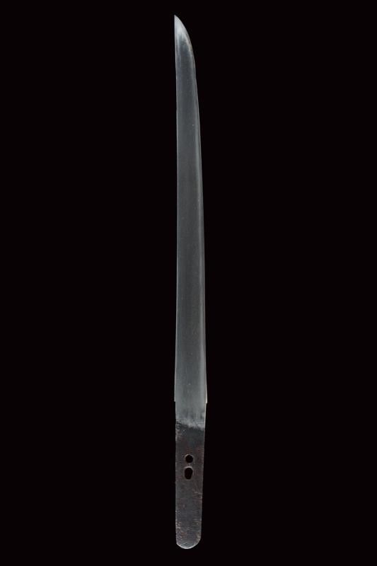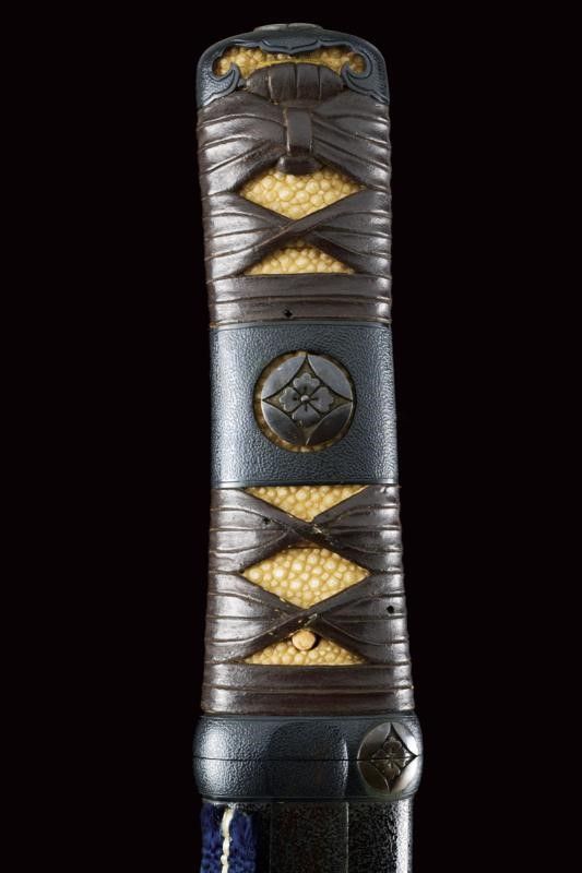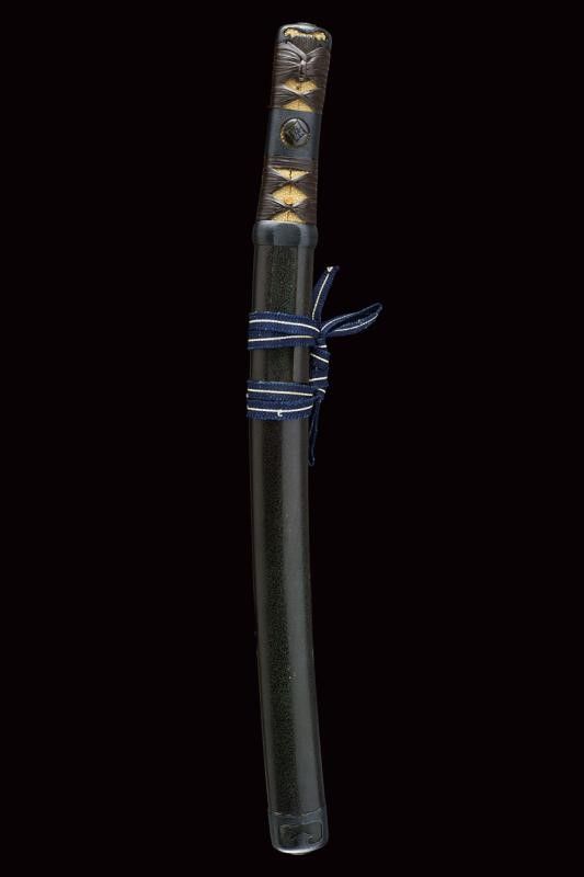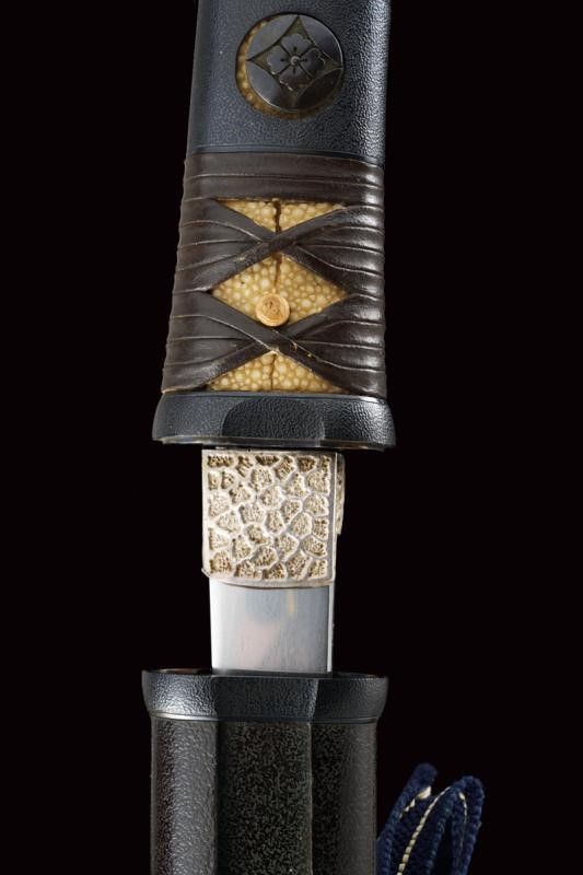datazione: Periodo Muromachi (1392-1573) provenienza: Giappone, Lama (nagasa 23.2 cm) con hamon e hada visibili, habaki in argento inciso a rete. Nakago-mei con due mekugi-ana. Tutto il koshirae con lo stesso disegno a Hanakkaku-mon. La lama accompagnata con 'Juhou Token Kenkyukai' che la certifica come Bizen-Osafune-Sukesada, periodo Muromachi. Il koshirase di tarda epoca Edo. Con custodia in tessuto policromo. lunghezza 38.5 cm.