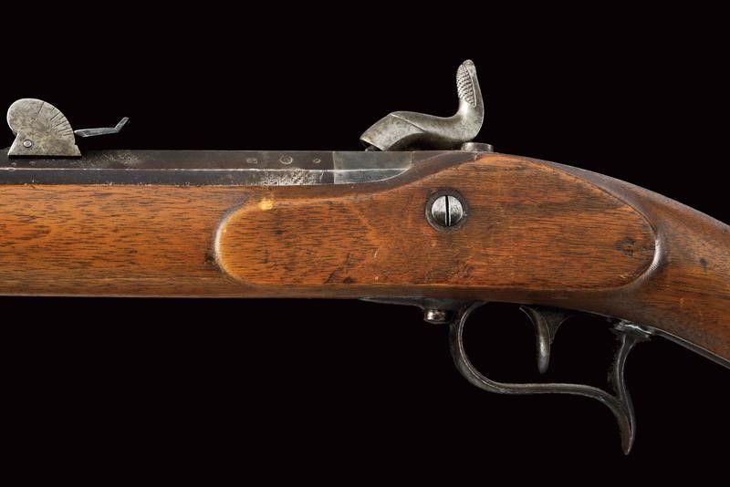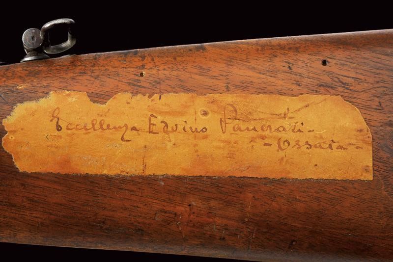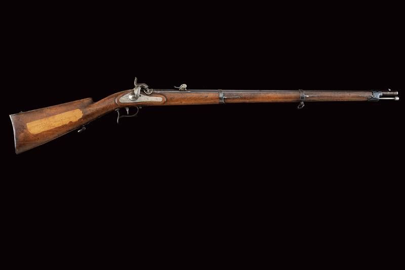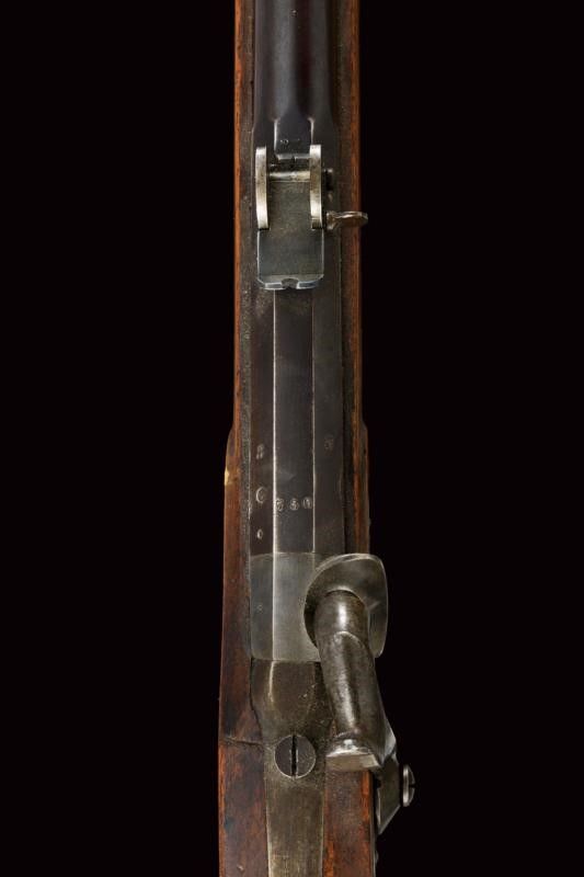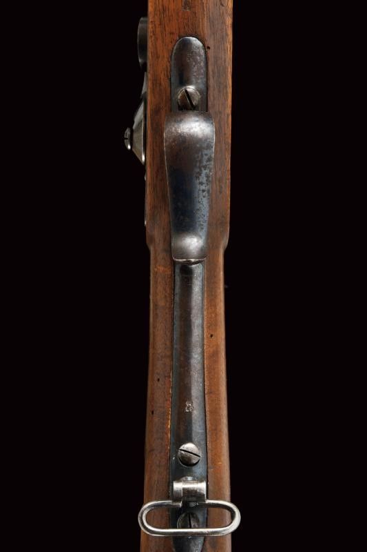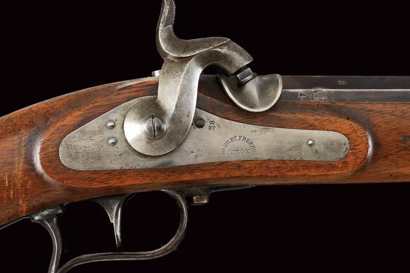 datazione: 1860-70 provenienza: Svizzera, Canna tonda rigata, dotata di mirino, numerata, con alzo regolabile, culatta ottagonale marcata 'BF', coronata 'P' e con timbro del banco di Liegi. Anima da pulire, rigatura visibile, cal. 10,4 mm in volata. Batteria a molla in avanti punzonata 'BF' coronato, e marcata 'BEURET FRERES A LIEGE'. Meccanica funzionante. Cassa intera in legno con qualche foro di tarlo. Sulla pala un'antica lunga etichetta con iscrizione vergata a mano in inchiostro, in italiano. Fornimenti in ferro con resti di brunitura antica. Baionetta a ghiera con fodero in cuoio dotato di fornimenti in ottone. lunghezza 132 cm.