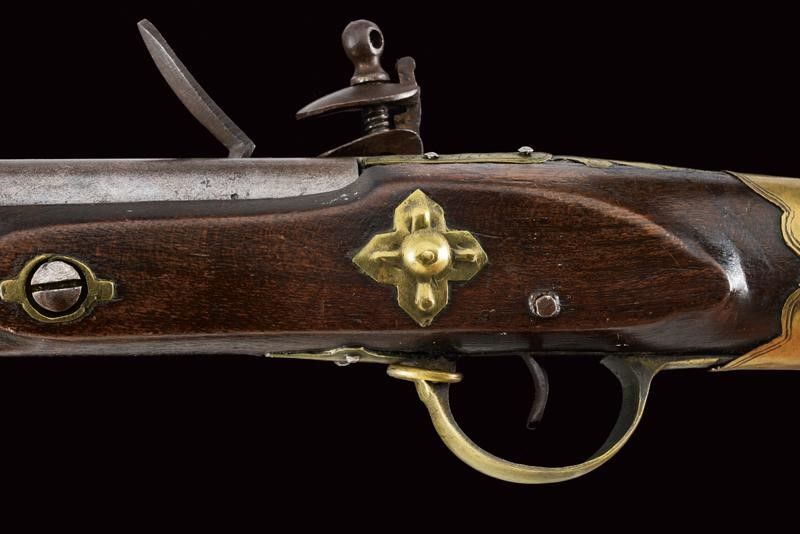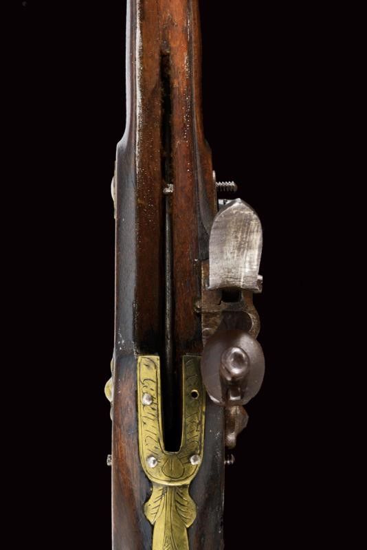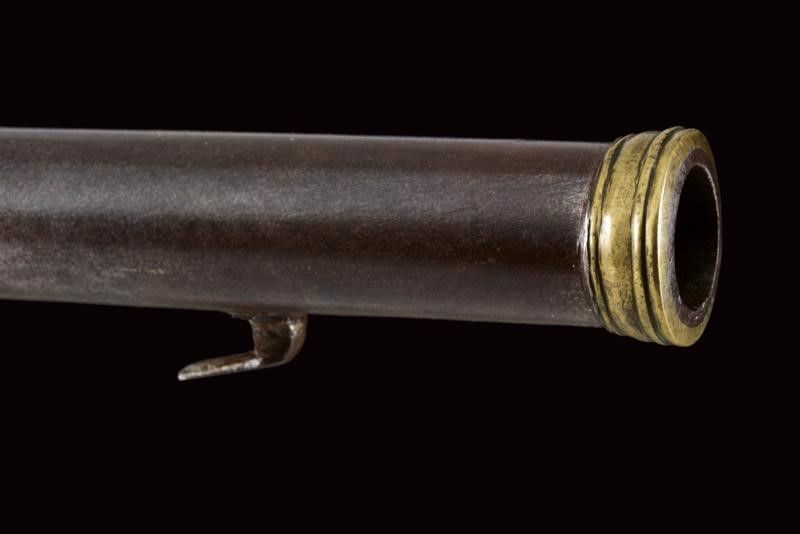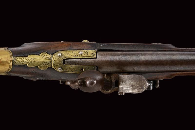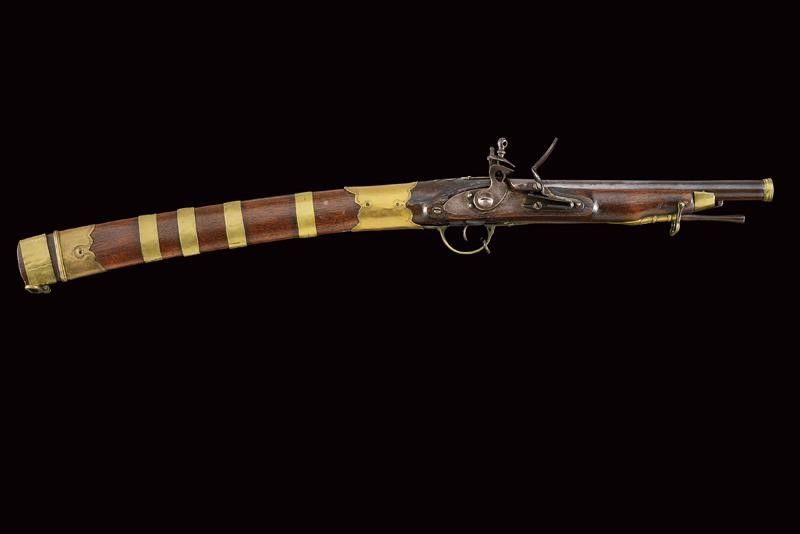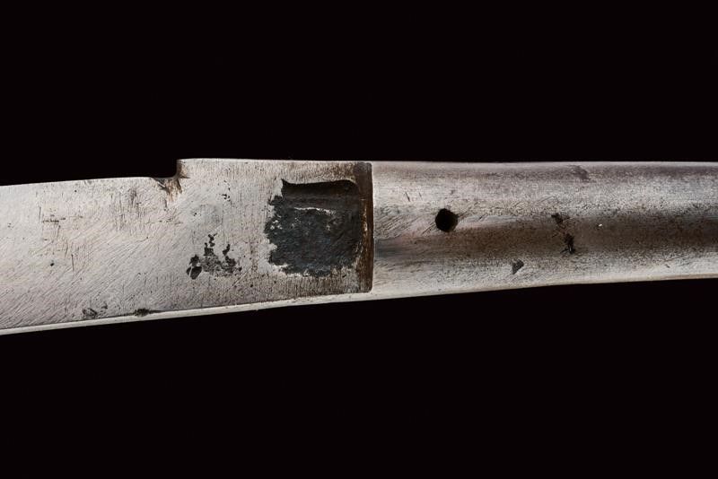 datazione: Prima metà del XIX Secolo provenienza: Birmania, Canna tonda, liscia, con gioia di bocca in ottone, cal. 13 mm, il cui codolo è prolungato in una lama di dha, di forma incurvata. La lama è inserita all'interno del lungo calcio, che è sagomato nella tipica forma dei foderi dei dha. L'impugnatura del dha è la canna stessa. Batteria a cartella piatta con meccanica funzionante. Cassa in legno con fornimenti in ottone e bacchetta in legno. Raro. lunghezza 63 cm.