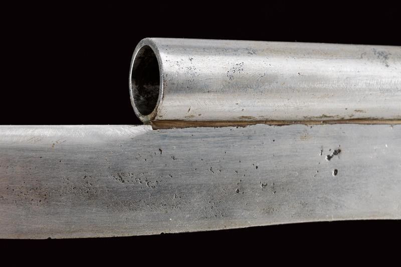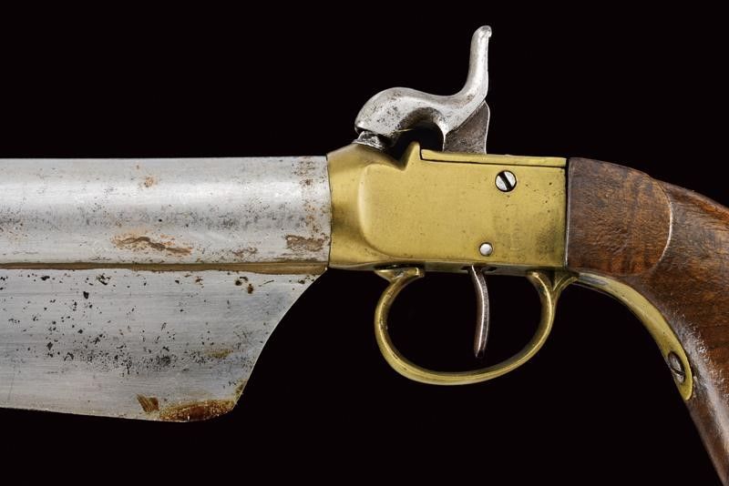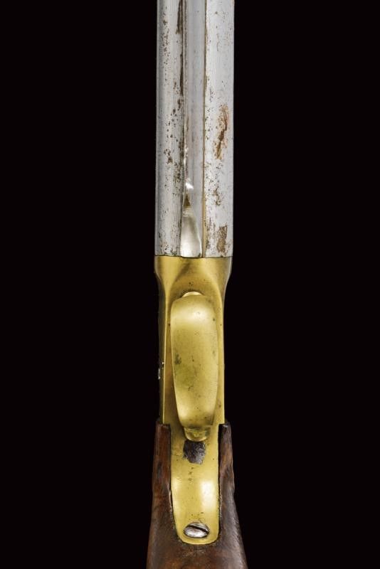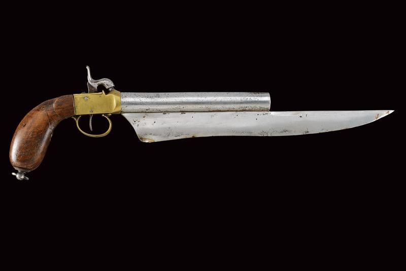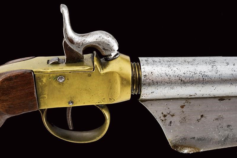 datazione: Metà del XIX Secolo provenienza: Europa, Canna cilindrica svitabile, liscia, cal. 18 mm. Intaccature. Castello boxlock in ottone con meccanica funzionante. Impugnatura in legno con anello porta correggiolo. Sotto alla canna una lunga baionetta integrata. lunghezza 44,5 cm.