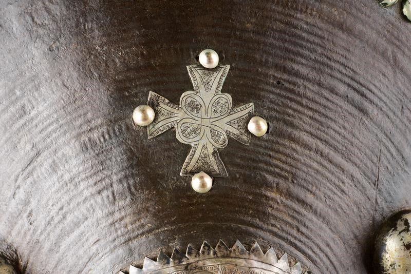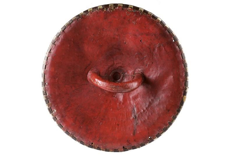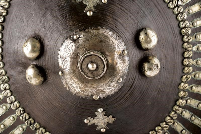 datazione: 1900 circa provenienza: Etiopia, Di forma circolare in spesso cuoio bruno. Riccamente ornato con fornimenti in metallo bianco (argento?), l'umbone centrale con incisioni a bande intrecciate, affiancato su due lati da coppie di borchiette emisferiche e con due fornimenti incisi e sagomati a croci copte. La banda esterna tutta rinforzata da doghe tenute da borchiette. Il retro (qualche piccola sforatura, segni d'uso e del tempo) foderato in pelle tinta di rosso e dotato di grande maniglione. diametro 51 cm.