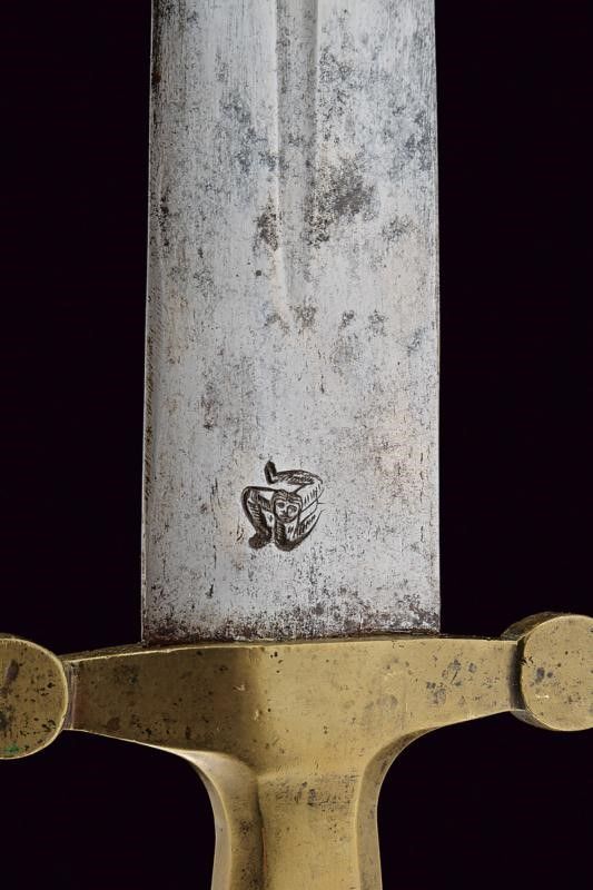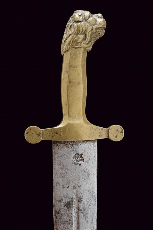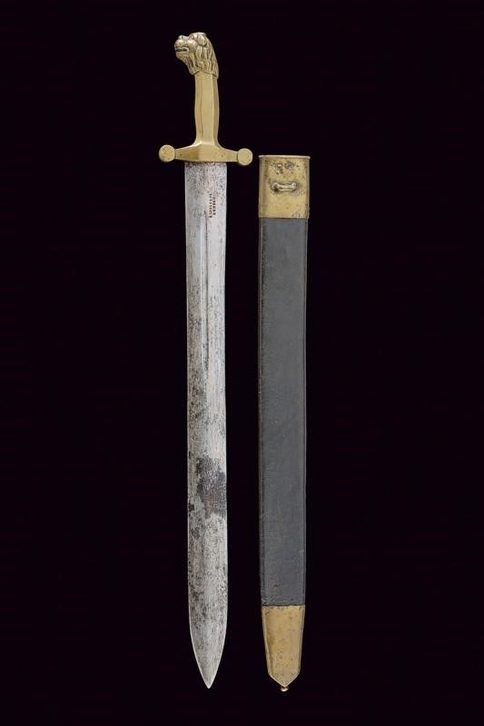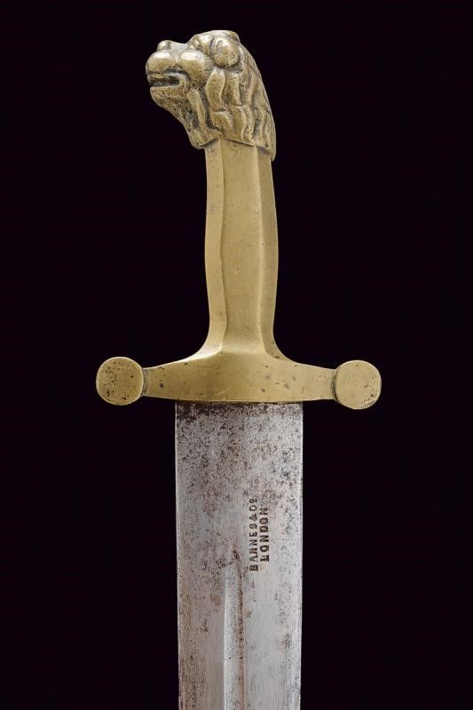 datazione: Metà del XIX Secolo provenienza: Sicilia, Ampia lama dritta a due fili paralleli con breve sguscio e aree intaccate, marcata 'BARNES & Co. LONDON' su un lato, su quello opposto alla base la Trinacria (simbolo dell'isola e adottato come emblema dal Governo Provvisorio del 1848). Fornimento in ottone, in un unico pezzo, con pomo a testa di leone. Fodero in cuoio antico con fornimenti in ottone. Interessante arma militare con raro marchio, probabilmente appartenente al breve periodo del Governo Provvisorio di Sicilia del 1848-1849. Sicuramente merita uno studio adeguato.Cfr: 'Storia dell'Arma Bianca Italiana' di C. Calamandrei, pag. 357. lunghezza 68,5 cm.