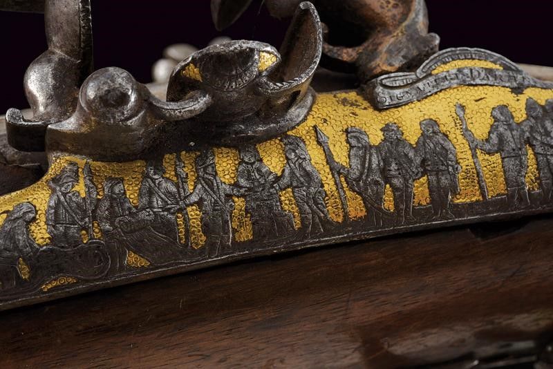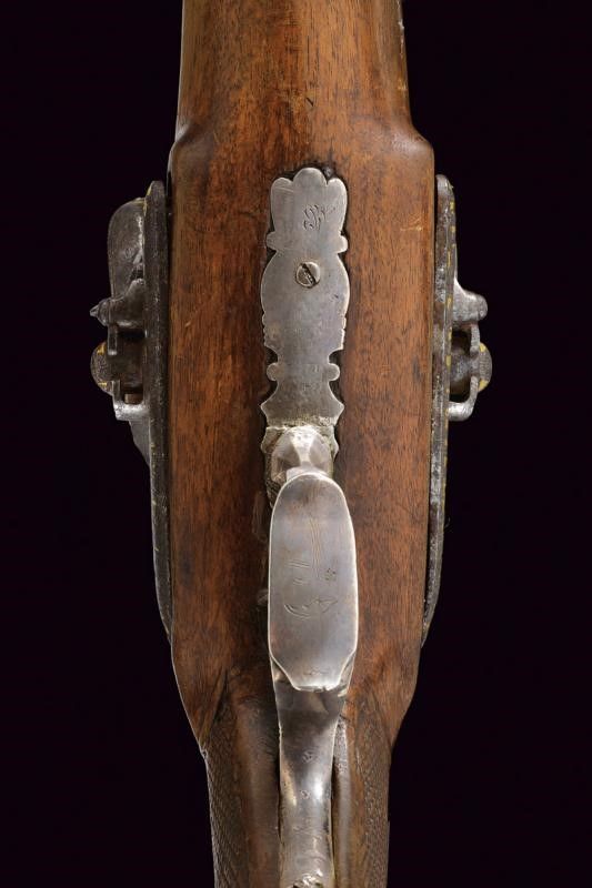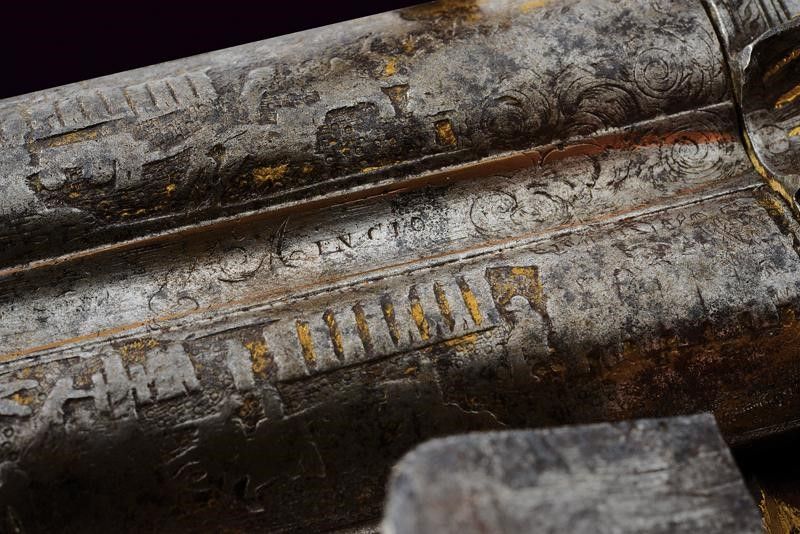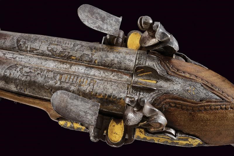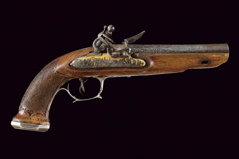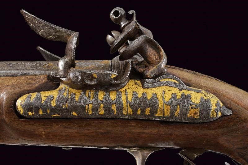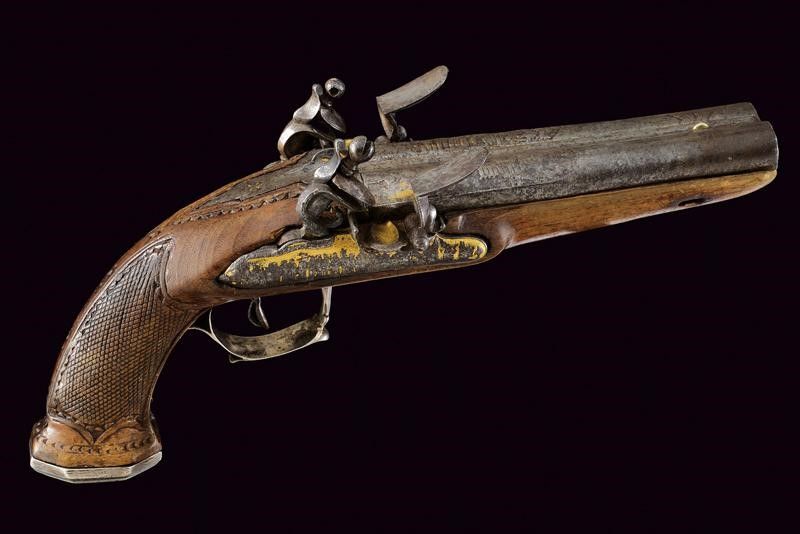 datazione: 1800 circa provenienza: Francia, Canne tonde a due ordini, giustapposte, con bindella, incise nella prima parte con personaggi a cavallo davanti ad una città, recanti resti di doratura e mirino in argento, cal. 18 mm. Codetta incisa e dorata, munita di traguardo a sella. Batterie a molla in avanti con cani interni, firmate in modo non chiaramente leggibile 'SIGN....DARMI' su un lato, sull'altro '...AIX', entrambe incise con file di soldati su fondo in oro, munite di scodellini a tenuta stagna. La batteria sinistra in condizioni migliori. Cassa intera in legno con collo zigrinato e leggermente scolpito; fornimenti in argento, il ponticello con resti di incisioni. Realizzata senza bacchetta. Si tratta sicuramente di una pistola importante, probabilmente appartenuta ad un generale; anche se non in perfette condizioni resta un'arma di grande rilevanza storica ed artistica. lunghezza 32 cm.