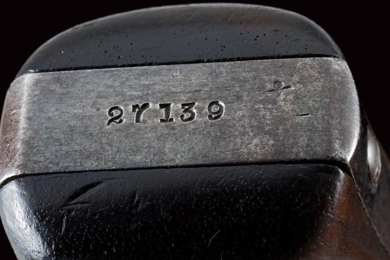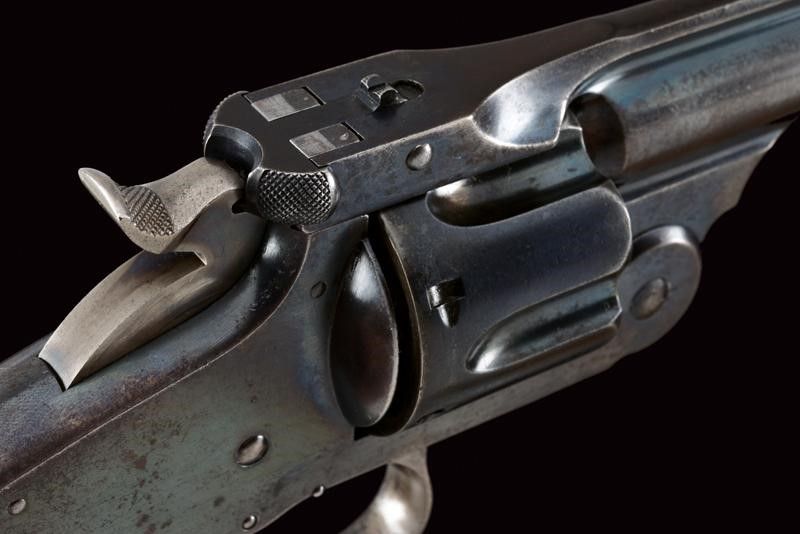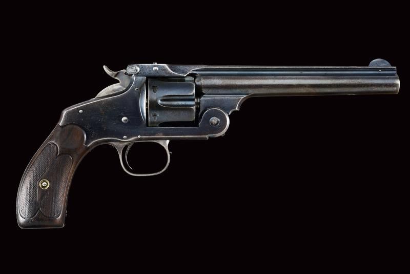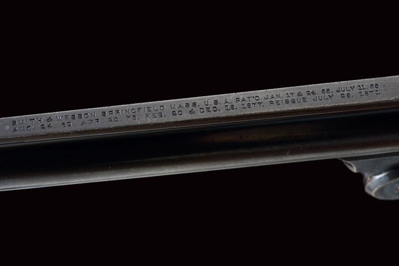 datazione: 1875-1890 provenienza: USA, Canna cilindrica rigata da 6-1/2' con marcatura in due righe sulla bindella recante brevetti sino al 1877, indirizzo della ditta e 'REISSUE JULY 25 1871'. Cal. 44 Russian. Anima pulita rigatura visibile. Tamburo a sei colpi. Meccanica ben funzionante. Conserva il 65% circa di brunitura color blu antica. Matricola '271xx' coeva sul canna, gancetto e impugnatura, sul tamburo solo visibili lievi tracce di numerazione non interpretabili. Guancette in legno zigrinato. Molto probabilmente si tratta di uno degli esemplari destinati alla marina militare Giapponese. Il secondo ordine di 8754 pezzi effettuato da Takata & Co. nel 1880-90 circa. I pezzi di quest'ordine erano standard con canna da 6-1/2', finitura blu e guancette in legno, il marchio che avevano più frequentemente era una semplice ancora timbrata sul fondo dell'impugnatura (Base di Tokoyama). Spesso inoltre avevano tamburi con numerazioni non pertinenti (che non ne abbassano tuttavia il valore). Le matricole tra 27018 e 27300 furono spedite a Takata nel 1891. Tutte queste caratteristiche sono presenti sul pregevole esemplare da noi presentato. Vedi 'Standerd Catalogue of Smith & Wesson' 3rd Edition di Supica/Nahals, pagg. 102-105. lunghezza 29,5 cm.