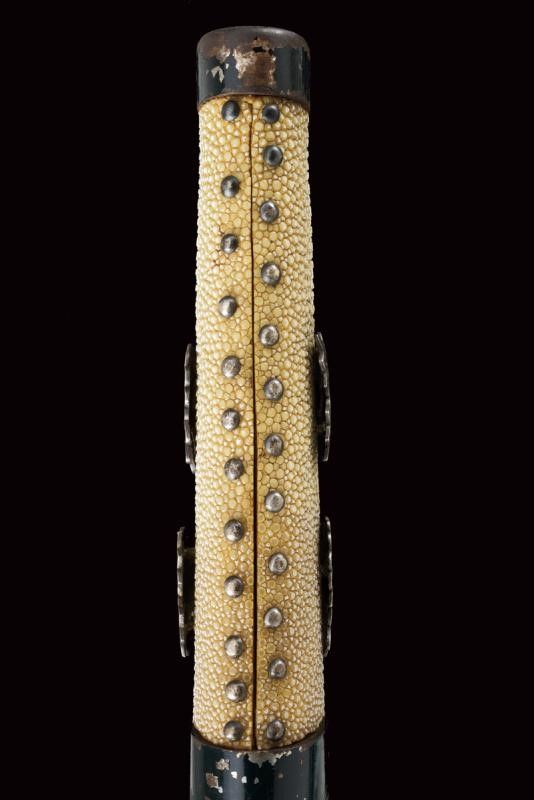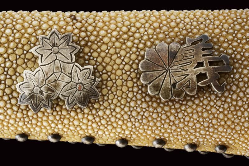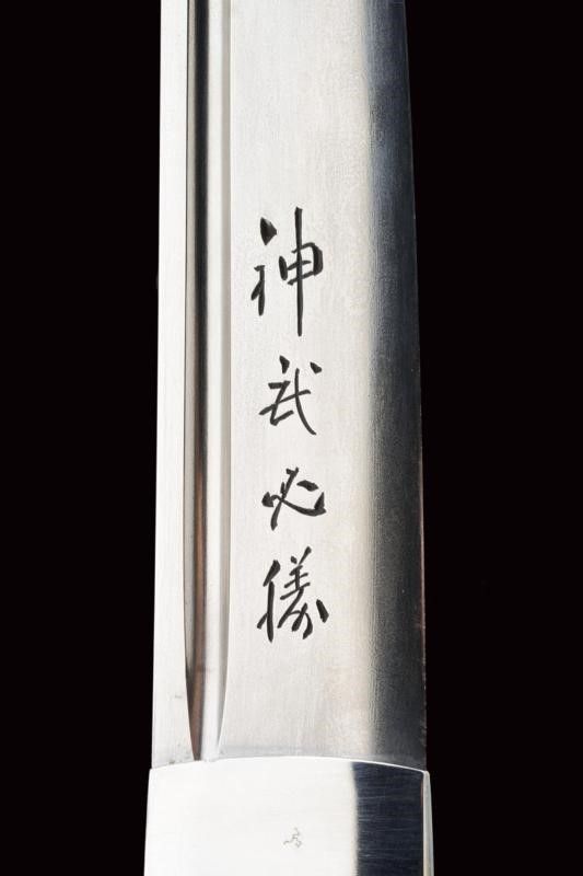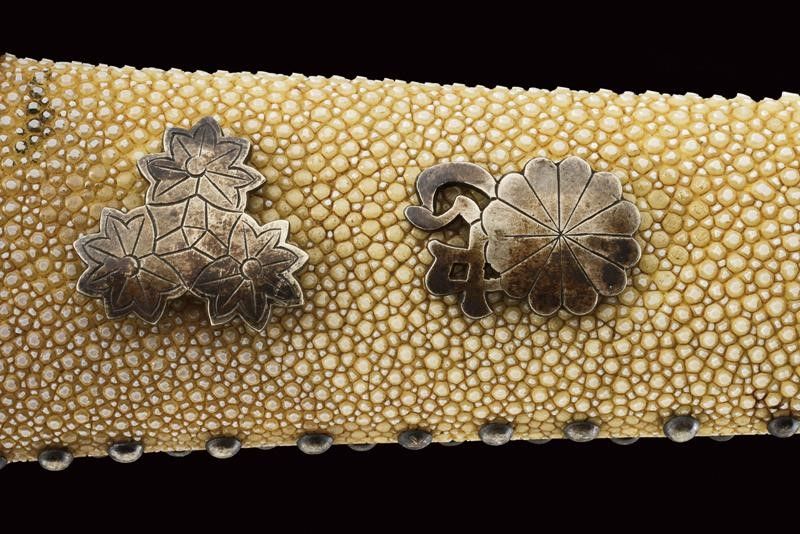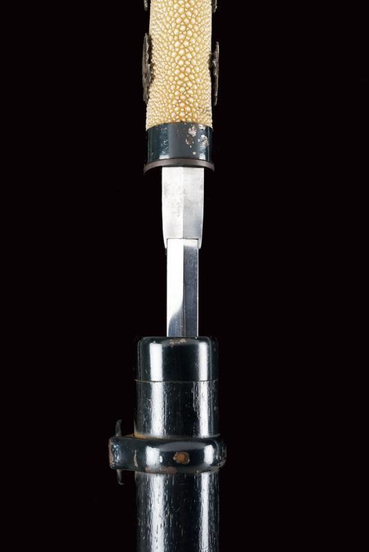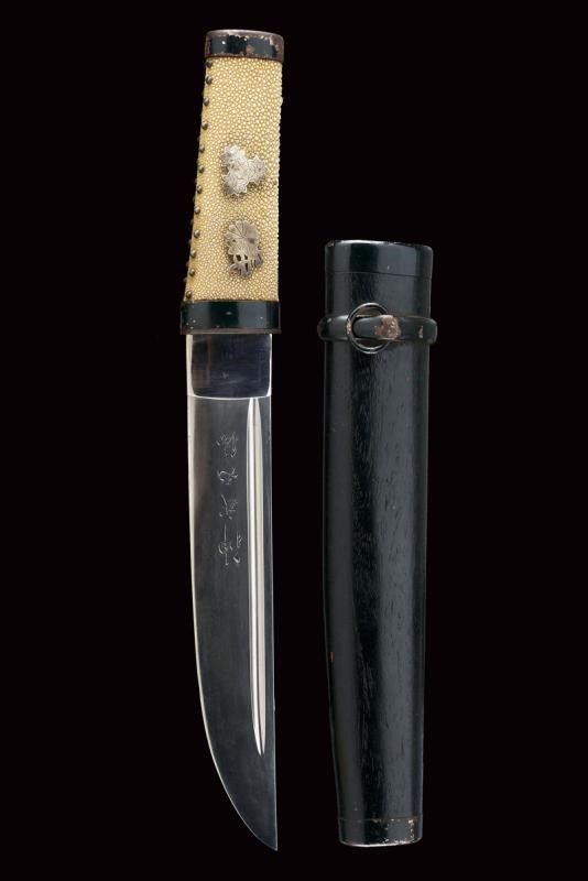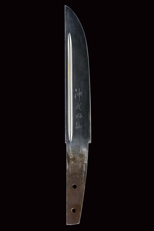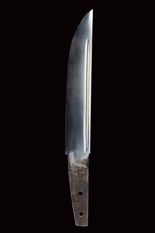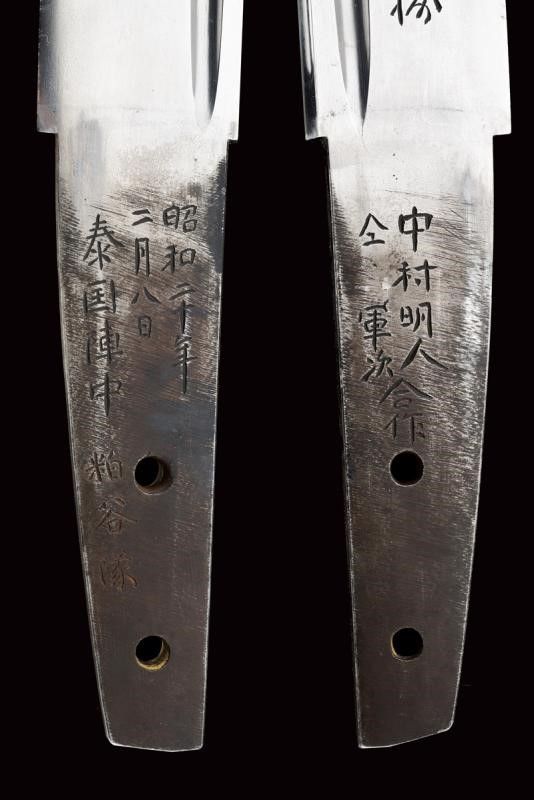 datazione: 1945 provenienza: Giappone, Pesante e larga lama, (nagasa lung. 25 cm) con hi su entrambi i lati e con iscrizioni di quattro kanji sul lato di terza, habaki in ferro. Nakago mei a due mekugi-ana con iscrizione su entrambi i lati: su una faccia la data '8 febbraio 1945' e 'Tailandia', 'sul campo di battaglia' e 'unità Kasuya', sull'altra 'Aketo Nakamura', 'Gunji' e il kanji per il lavoro di due armaioli. Koshirae in stile occidentale, impugnatura rivestita in pelle di razza con semplici fuchi-kashira in ferro laccato di nero, su ogni lato un mon a tre fiori ed un mon a dodici petali con due differenti kanji, che formano insieme la parola 'Lealtà' (verso l'Imperatore), tutti in argento. La saya in legno annerito con fornimenti in ferro laccato di nero e fascia con un anello di sospensione. Aketo Nakamura (1889 - 1966) fu tenente generale dell'esercito giapponese, dal 1940 al comando della quinta divisione, che fu parte delle forze di invasione dell'indochina francese. Dal gennaio del 1943 e fino alla fine della guerra al comando della 39° armata in Thailandia.La particolarità di questo tanto è che il generale stesso collaborò alla sua realizzazione con l'esperto armaiolo, infatti il nakago porta anche il nome del generale accanto a quello dell'armaiolo Gunji. lunghezza 44.5 cm.