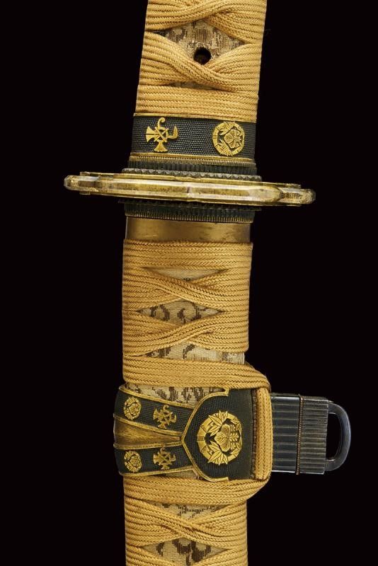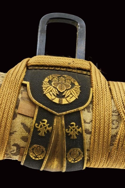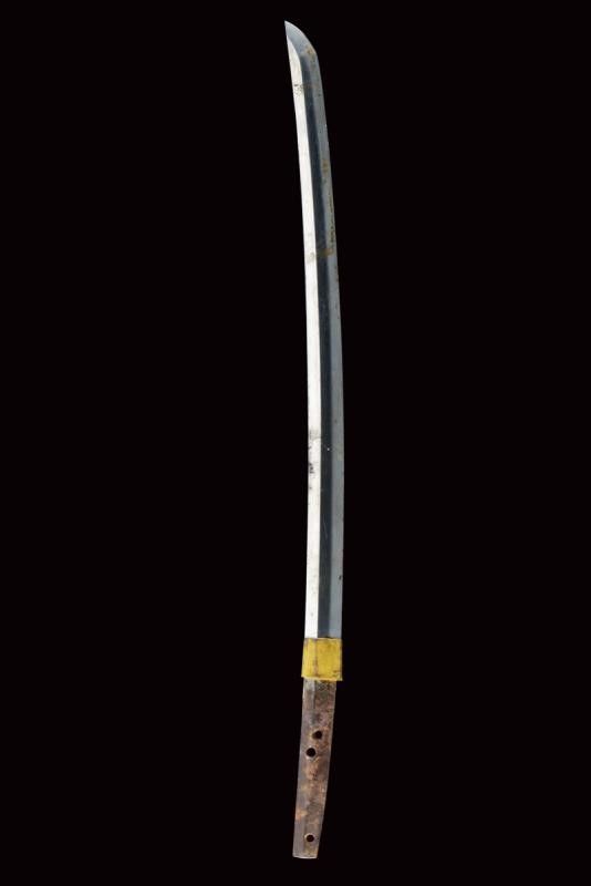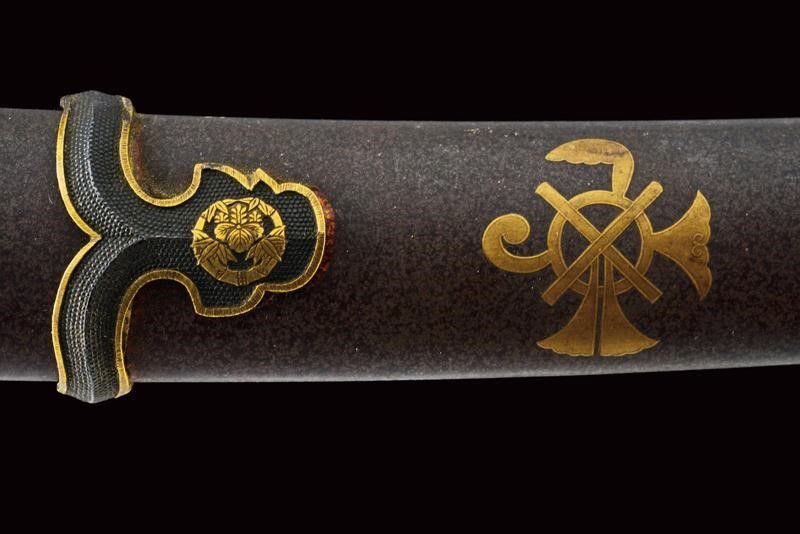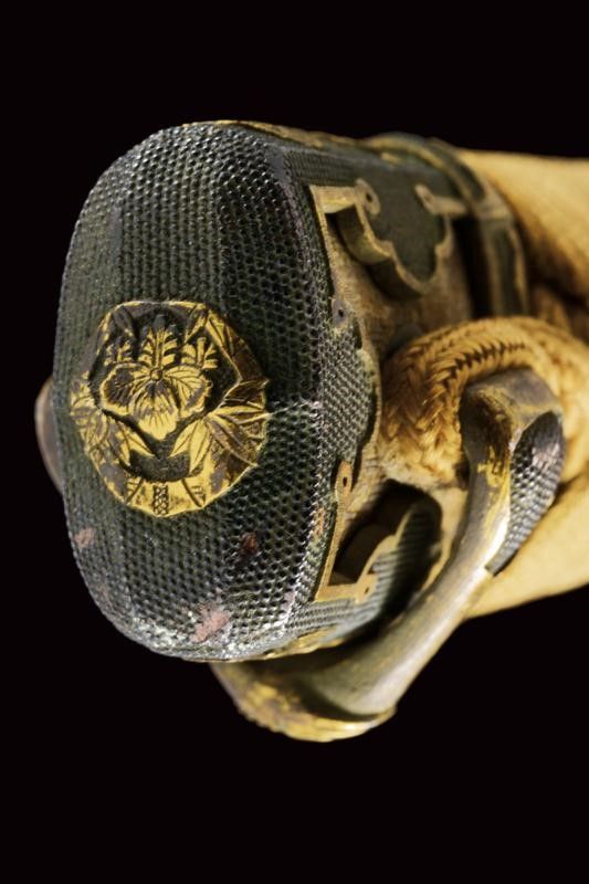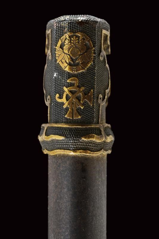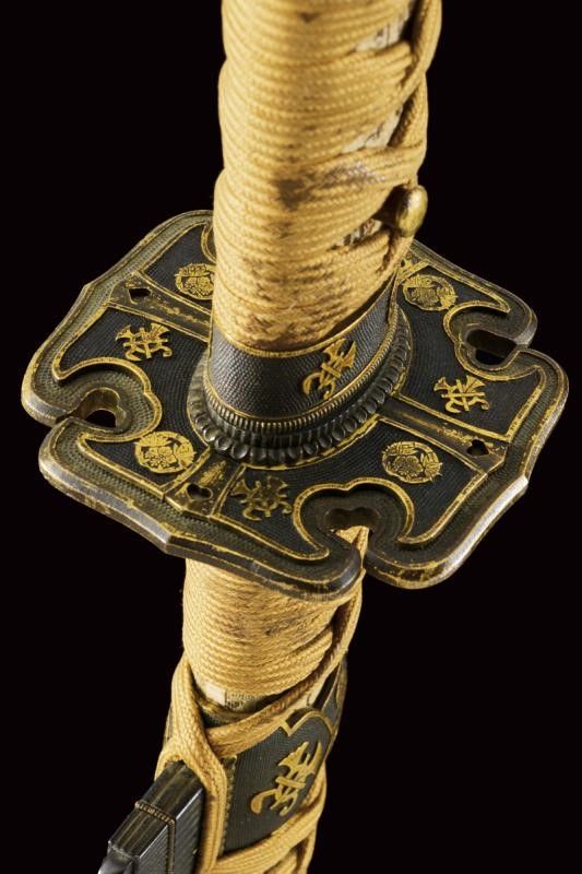 datazione: Periodo Muromachi (1392-1573) provenienza: Giappone, Wakizashi shinogizukuri-iorimune in koshirae da tachi. Nagasa (lung. 43 cm, accorciata). Hada: non visibile; hamon: suguha ko nie deki; boshi: ko maru kaeri fukai; habaki in rame con resti di doratura. Nakago mumei con tre mekugi-ana. Bellissimo koshirae con tutti i fornimenti en suite, aoi-gata tsuba in shakudo che reca, come tutti gli altri fornimenti, due diversi mon in oro su fondo nanako scuro. Tsukamaki in seta color beige con fondo in tessuto che prosegue nella parte superiore della saya, gli ashi senza cordatura. L'area della saya sottostante il tessuto con lacca rossa, il resto in lacca opaca marrone scuro con gli stessi mon in oro. Corta ma interessante lama del medio periodo Muromachi. lunghezza 68.4 cm.