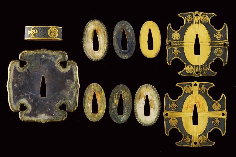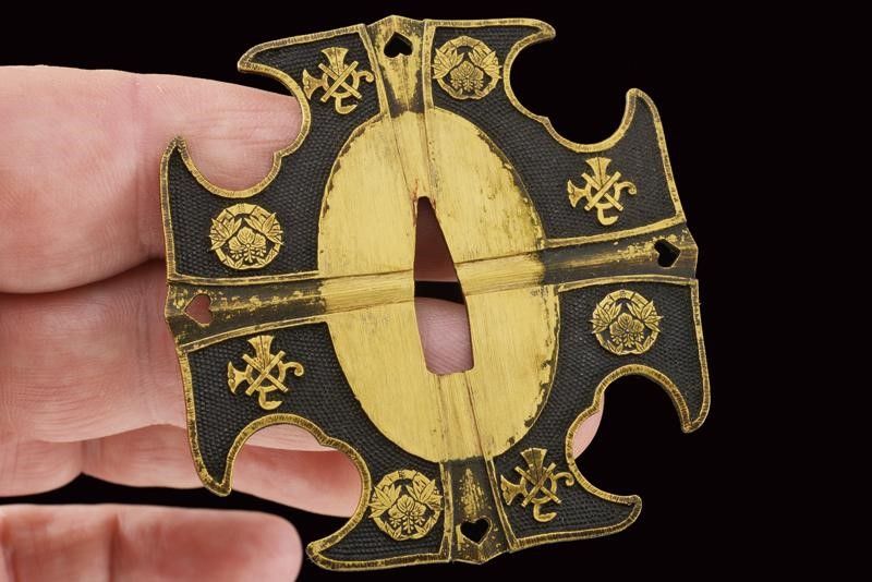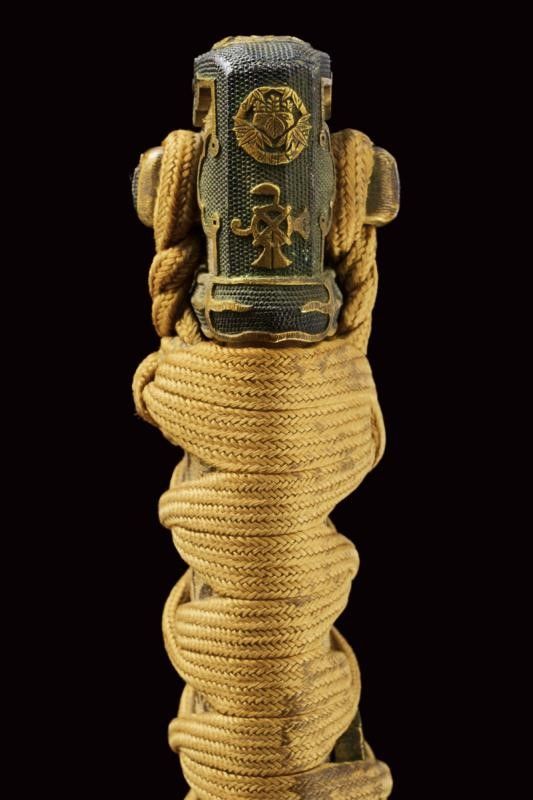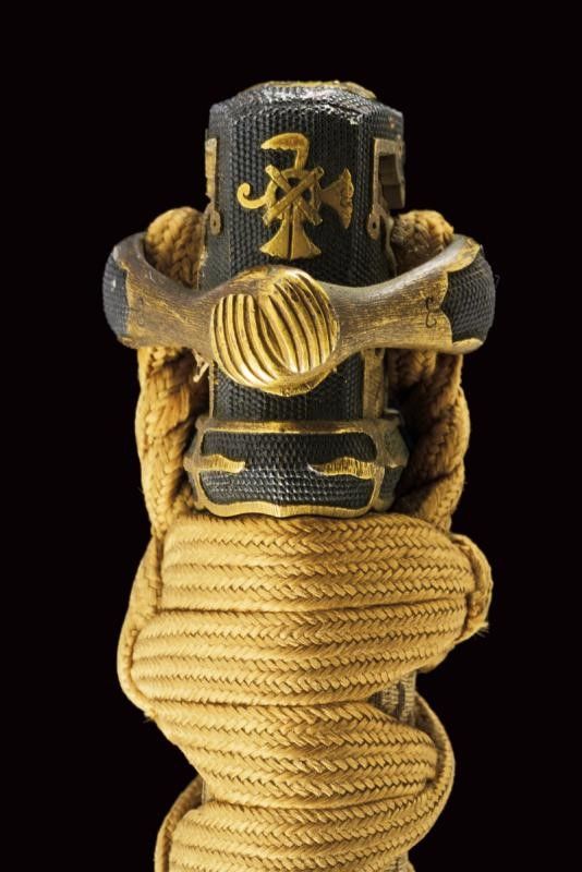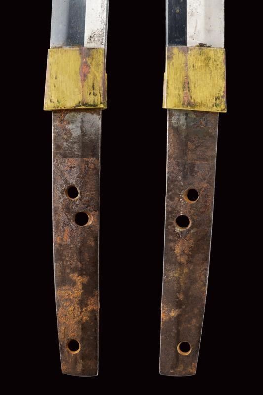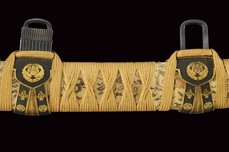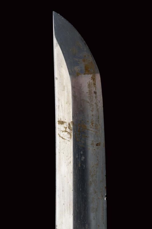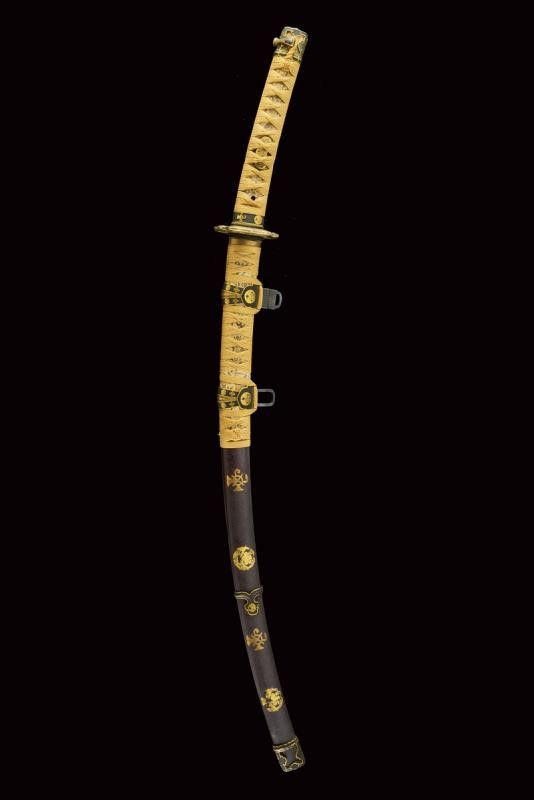 datazione: Periodo Muromachi (1392-1573) provenienza: Giappone, Wakizashi shinogizukuri-iorimune in koshirae da tachi. Nagasa (lung. 43 cm, accorciata). Hada: non visibile; hamon: suguha ko nie deki; boshi: ko maru kaeri fukai; habaki in rame con resti di doratura. Nakago mumei con tre mekugi-ana. Bellissimo koshirae con tutti i fornimenti en suite, aoi-gata tsuba in shakudo che reca, come tutti gli altri fornimenti, due diversi mon in oro su fondo nanako scuro. Tsukamaki in seta color beige con fondo in tessuto che prosegue nella parte superiore della saya, gli ashi senza cordatura. L'area della saya sottostante il tessuto con lacca rossa, il resto in lacca opaca marrone scuro con gli stessi mon in oro. Corta ma interessante lama del medio periodo Muromachi. lunghezza 68.4 cm.