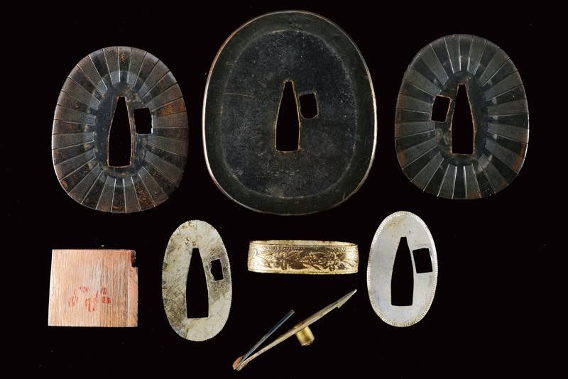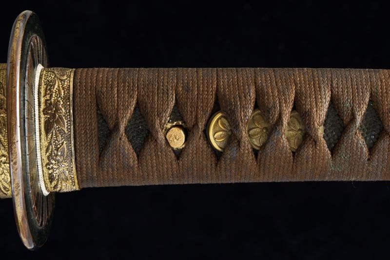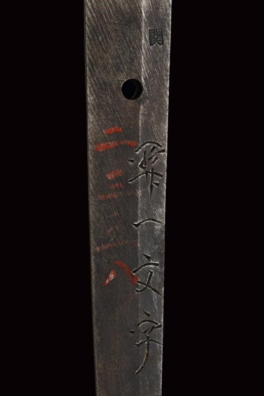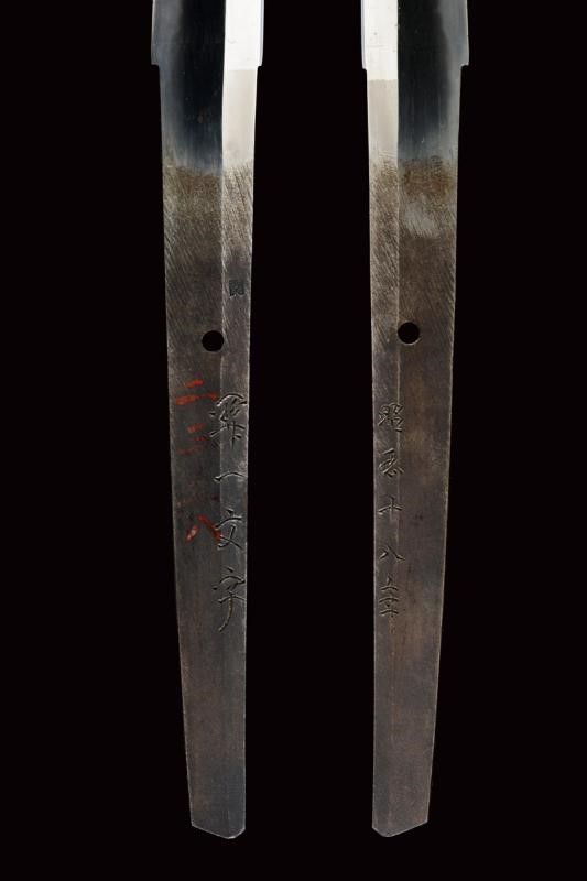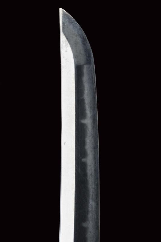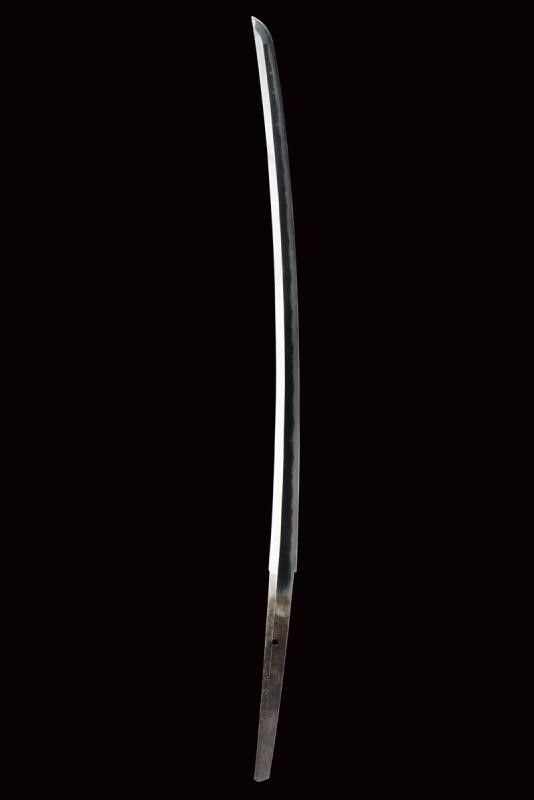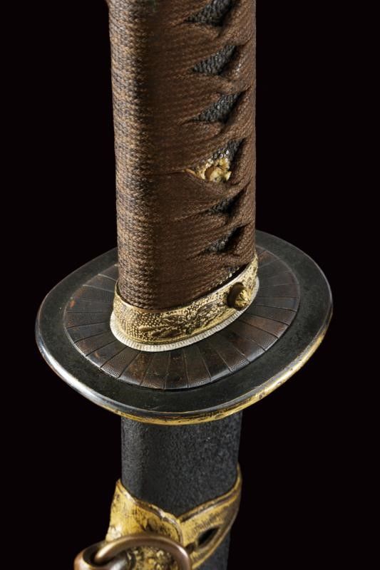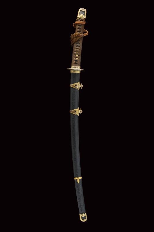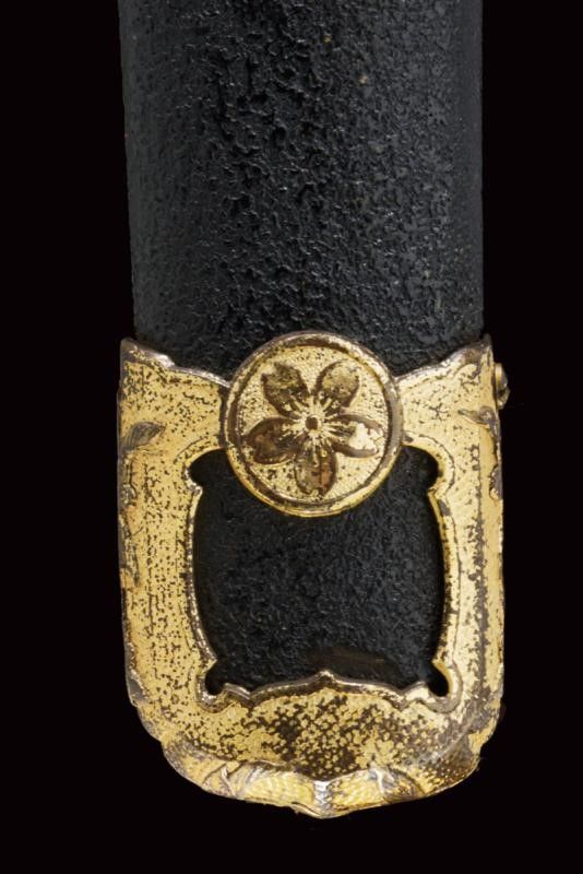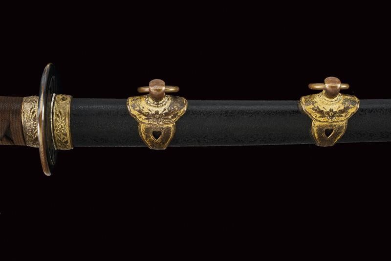 datazione: Periodo Showa (1926-1989) provenienza: Giappone, Buona lama con nagasa di 64.7 cm. Hada: mokume itame compatto; hamon: o-gunome togari nioi deki konie; boshi: ko maru - kaeri yoru; habaki in rame. Nakago mei Ichimonji (seki mino) seki, punzone Showa ju hachi non, 18° anno showa (1943), un mekugi-ana. Bella koshirae da ufficiale di alto rango, con tipica tsuba della marina militare con seppa inciso a raggi. Fornimenti gunto in shakudo dorato e decorati a motivi floreali. lunghezza 93 cm.
