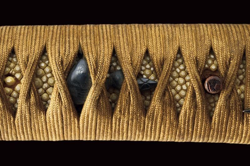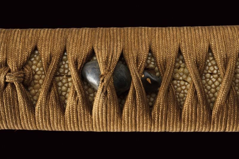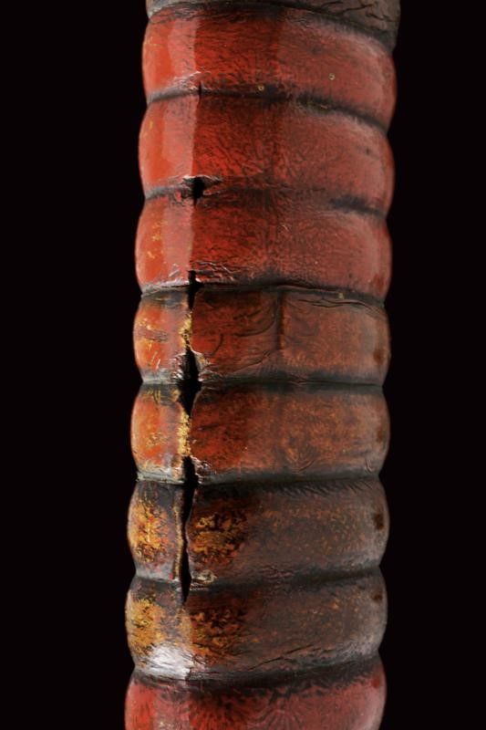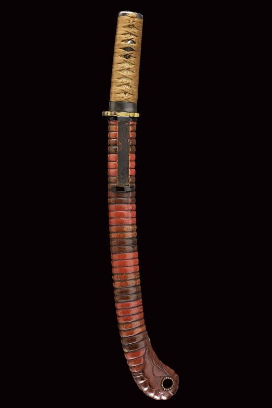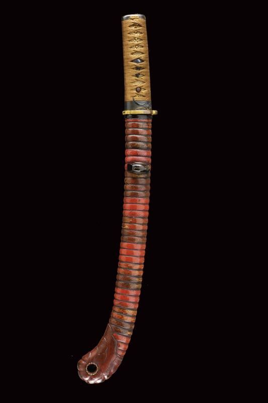 datazione: Periodo Edo (1603-1867) provenienza: Giappone, In forma Ebi (a gambero) completo di tsuba in shakudo dorato (mancanze), fini fuchi-kashira parzialmente dorati, menuki e tsuka in seta marrone. Saya lavorato a spire e laccato color rosso. Koiguchi e Kurigata in corno. Lama in legno. Con custodia in tessuto policromo. lunghezza total closed 50.5 cm.