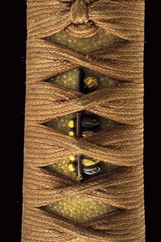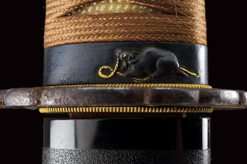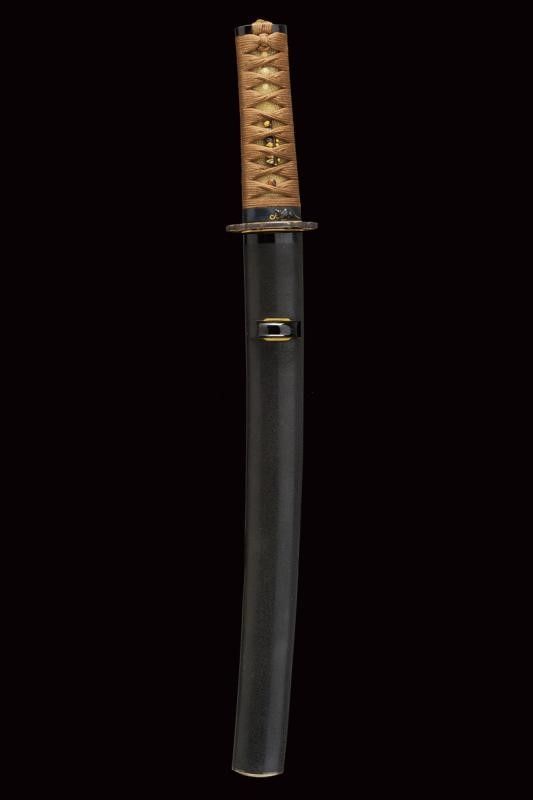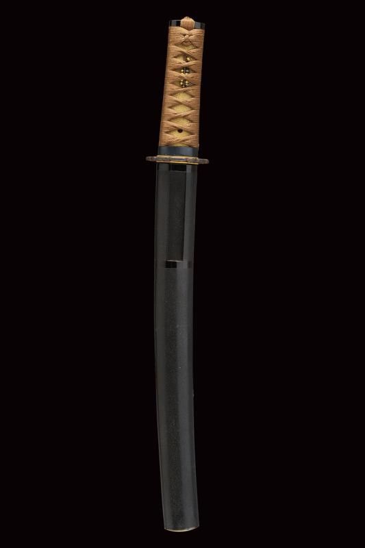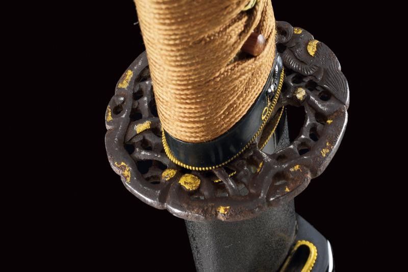 datazione: Periodo Edo (1603-1867) provenienza: Giappone, Lama e habaki in legno, tsuba in ferro riccamente traforata e ornata con volatili e racemi, parzialmente dorata. Fuchi e kashira in corno, il primo intagliato con un animale in bassorilievo con agemine in oro, i menuki in shakudo e parzialmente dorati. Tsuka-ito in seta marrone. Saya in lacca nera Ishimeji. Con custodia in tessuto policromo. lunghezza total closed 48 cm.