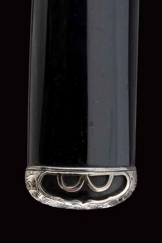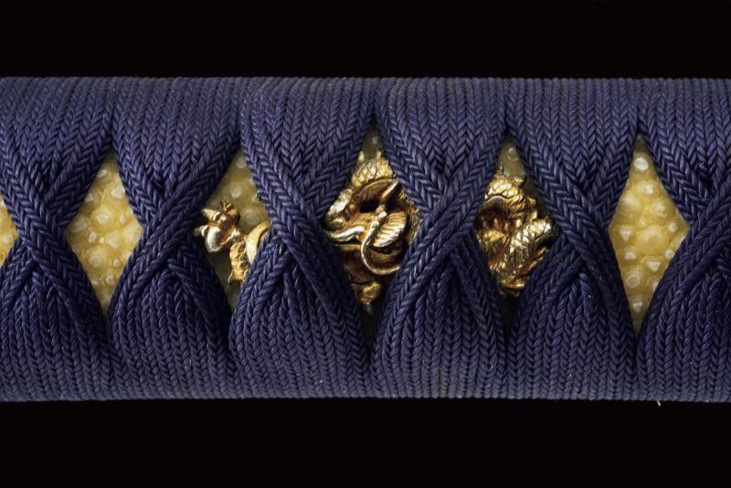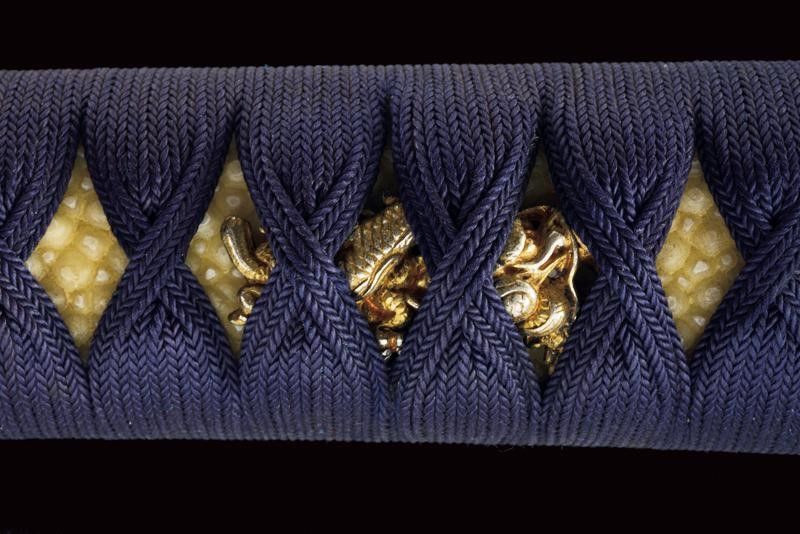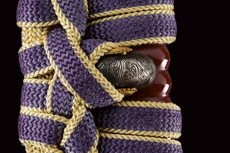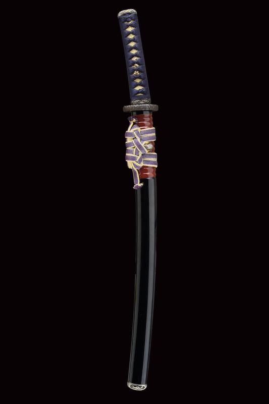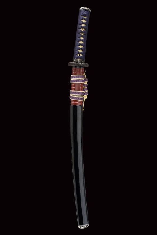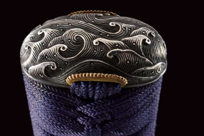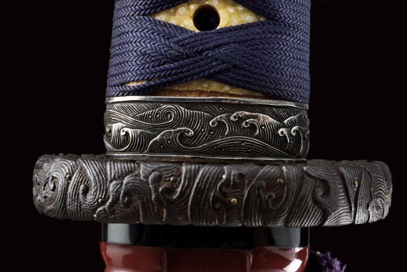 datazione: Periodo Edo (1603-1867) provenienza: Giappone, Lama e habaki in legno. Tutti i fornimenti, menuki a parte, con decorazioni a onde. Interessante tsuba in ferro completamente intagliata, tondeggiante, con puntini in ottone, fuchi-kashira-mei in argento, bei menuki dorati, tsuka in seta blu scura. Saya in legno laccata in due colori, la parte superiore a scanalature color rosso, la parte inferiore liscia con lacca nera. Bel kurigata in argento en suite con fuchi-kashira e kojiri. Con custodia in tessuto policromo. lunghezza total closed 68.5 cm.