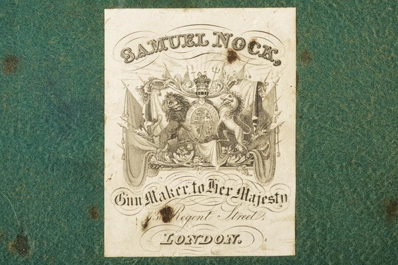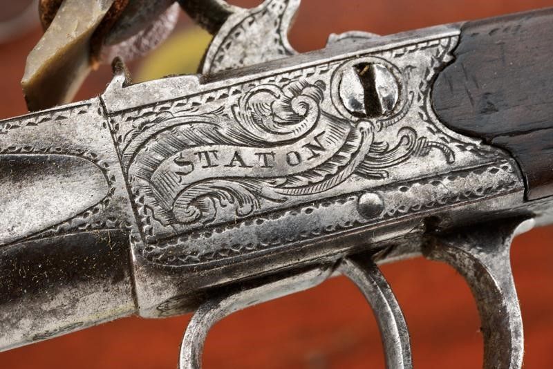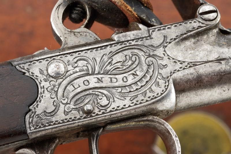 datazione: 1770/80 provenienza: Londra, Canne tonde, lisce, svitabili, decorate ad anellature e con incisione al cambio, munite di gioia di bocca, cal. 11 mm. Castelli del tipo boxlock firmati 'STANTON' e LONDON' fra disegni floreali, punzoni del banco di prova di Londra. Calcio in legno con fornimenti in ferro inciso. In una cassetta antica, adattata, di legno, foderata di panno verde e con etichetta di Samuel Nock. Completa di vari attrezzi inclusa una fiasca doppia e la chiave. Thomas Staton è documentato a Londra, al 24 di Crooked Lane, nel 1777 (Der Neue Stöckel Vol. II, pag. 1214). lunghezza 20.5 cm.