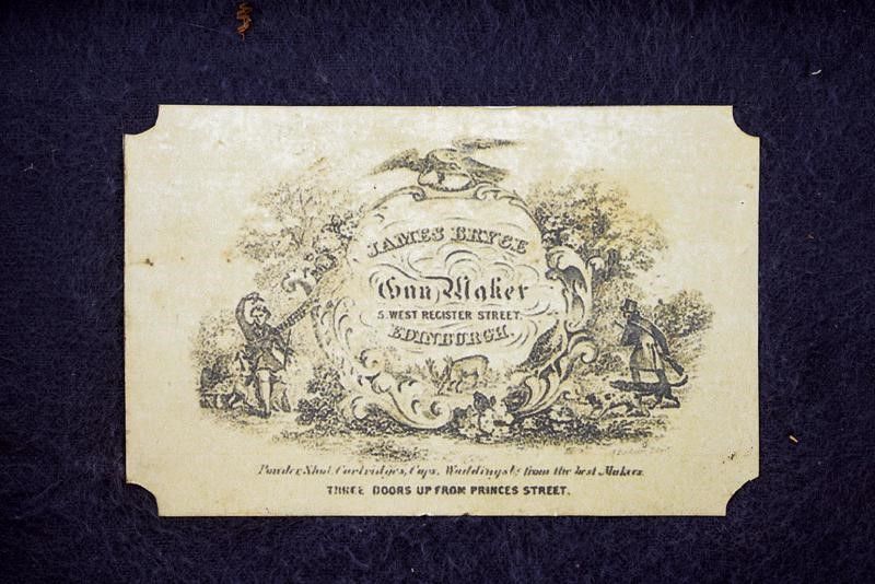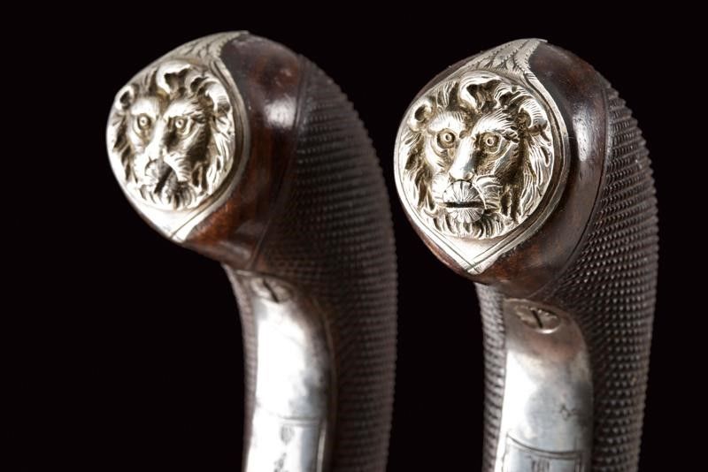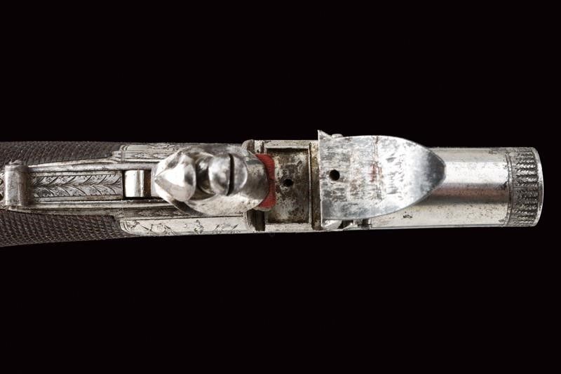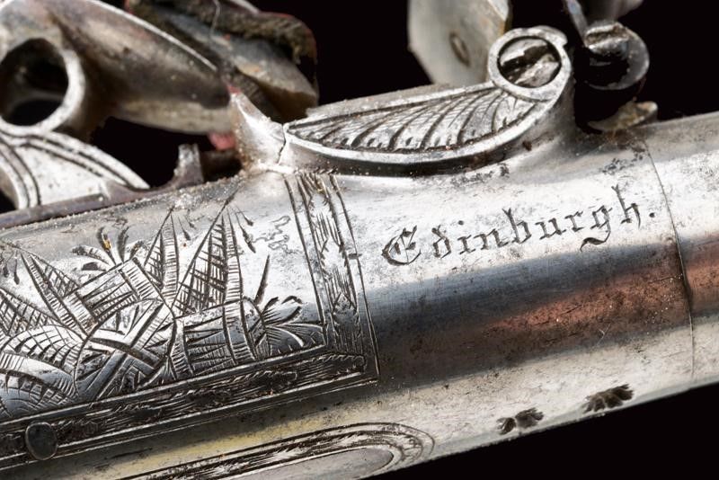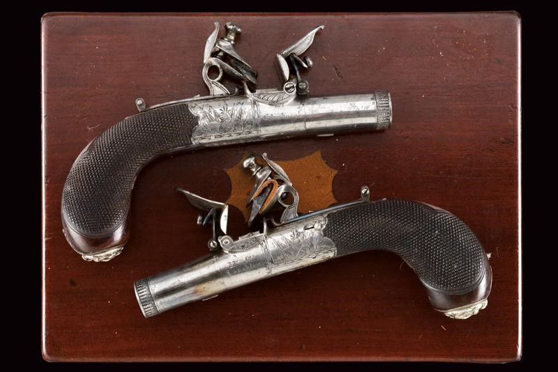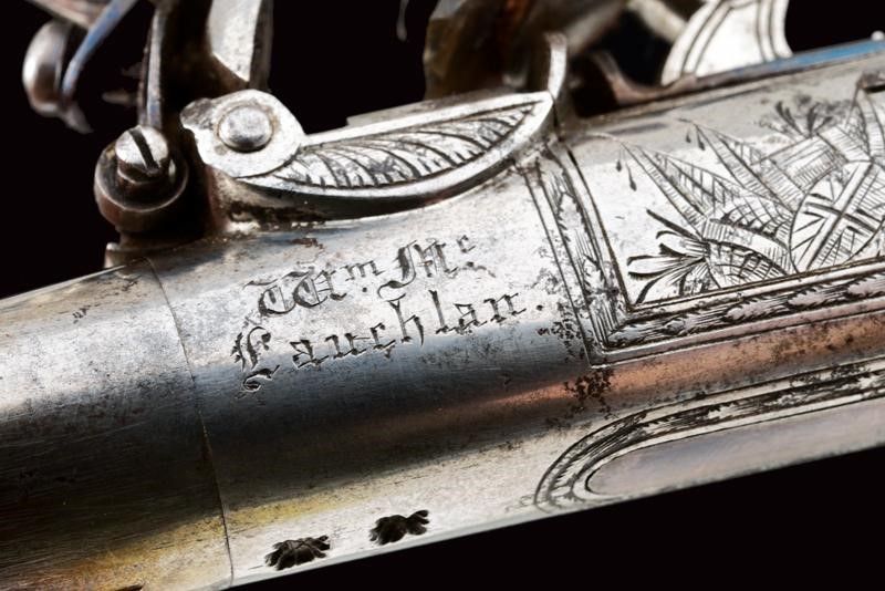 datazione: 1810 circa provenienza: Edimburgo, Canne tonde, lisce, incise alla volata, svitabili, cal. 12 mm; castelli ovali firmati 'W.m Mc.Lauchlan' su un lato e 'Edinburgh' su quello opposto, con fine incisioni a trofei, punzoni del banco di prova e con grilletto a scomparsa. Cani dotati di sicura. Calci in legno zigrinato, le cocce con testa di leone in argento sbalzato. I dorsi con scudetto in argento a losanga. In una cassetta antica di legno rivestita con panno bordeaux e con etichetta di James Bryce di Edinburgo, completa di vari attrezzi e della chiave. William McLauchlan è documentato a Edimburgo dal 1806 al 1847. (Der Neue Stöckel Vol. II, pag. 785). lunghezza 16 cm.