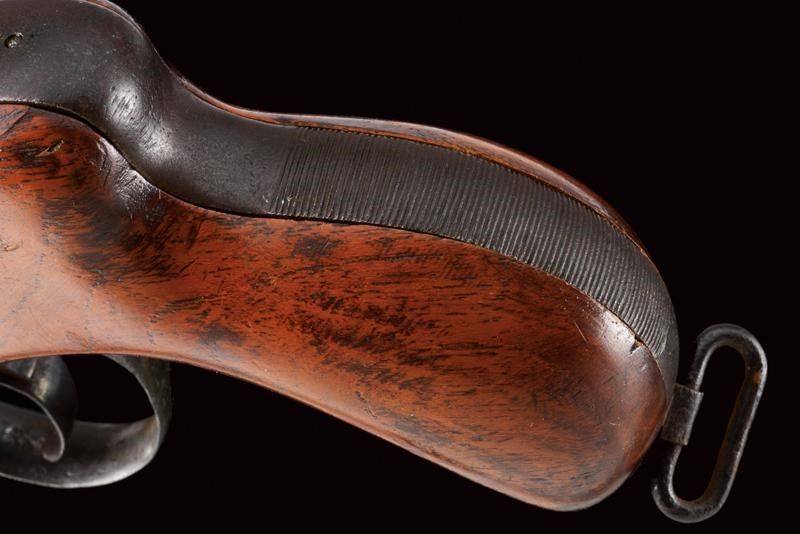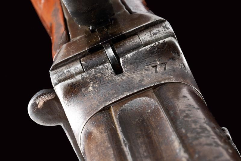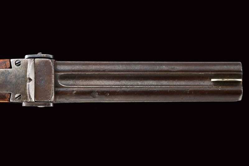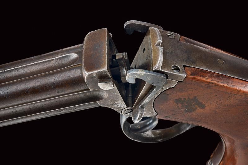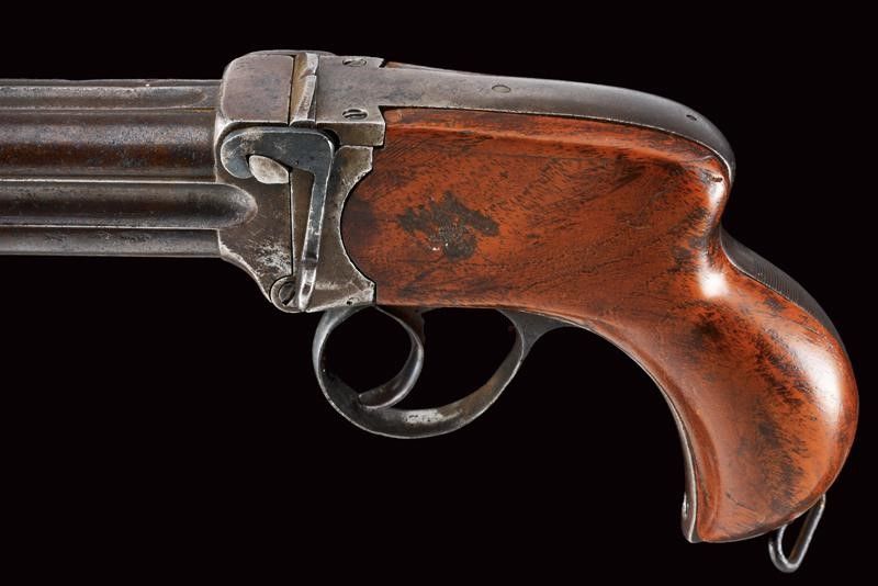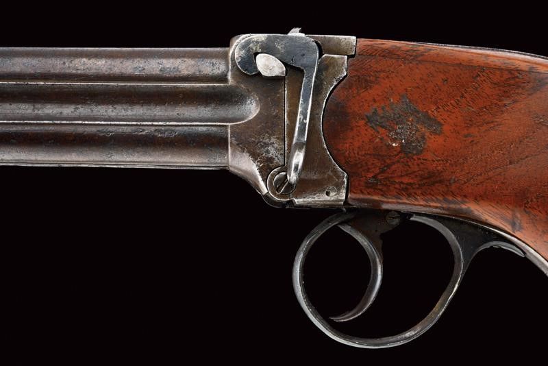 datazione: 1880 circa provenienza: Londra, Blocco di quattro canne con bindelle scanalate, il lato superiore con resti di firma Charles Lancaster con indirizzo, mirino in metallo bianco, basculanti, marcate '77' alla base, cal. 11.5 mm; breve castello in ferro con leva d'apertura sul lato sinistro. Ponticello con resti di matricola. Calcio in legno con fornimenti e passante per la corda di sospensione in ferro. Rara. lunghezza 29 cm.