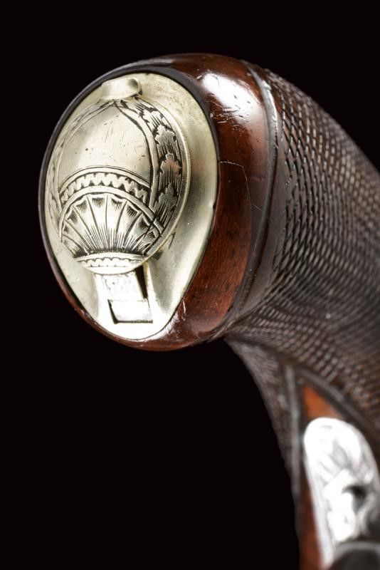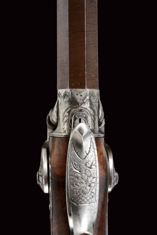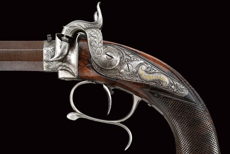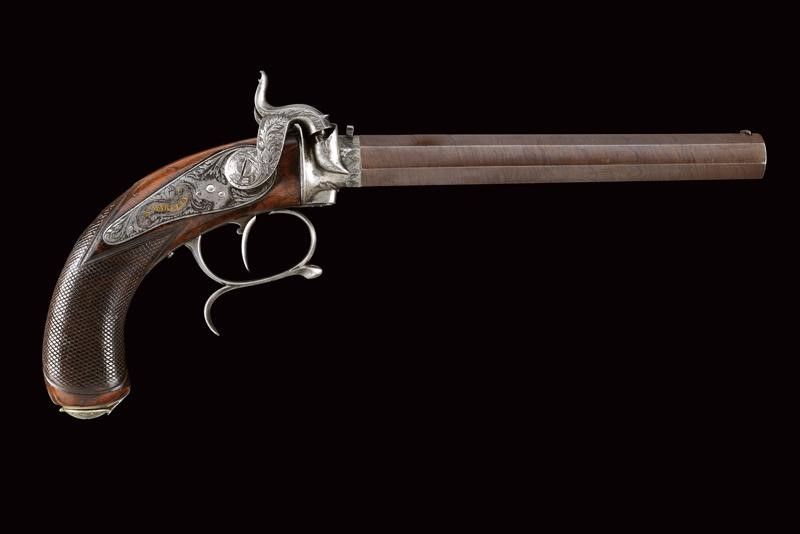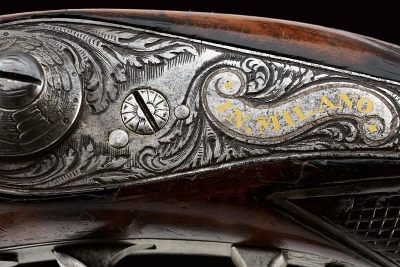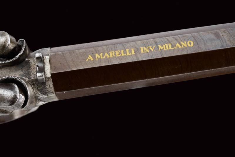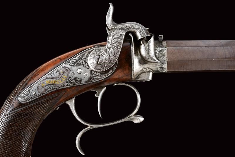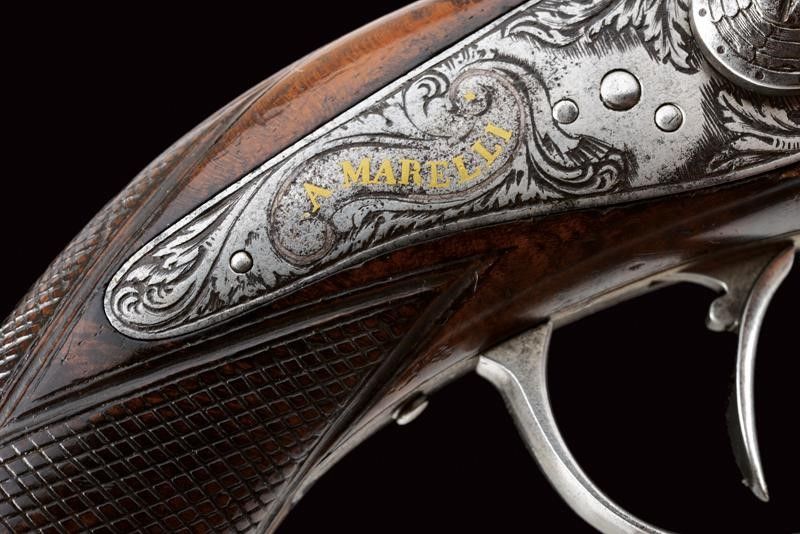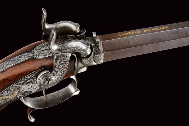 datazione: 1850/60 provenienza: Milano, Canna singola, liscia, ottagonale, con resti di vecchia brunitura, svitabile (da sbloccare) e dotata di mirino, marcata in oro al dorso 'A. MARELLI INV. MILNO', cal. 14,7 mm. Il blocco di culatta in ferro, con dorso e codolo incisi a motivi floreali e con alzo fisso. I pistoni con parascintille (qualche intaccatura alla base). Batterie a molla indietro, firmate in oro 'A. MARELLI / IN MILANO' ed incise a motivi floreali. Cani incisi. Il calcio in legno con due piccole crepe ma sano e con zigrinatura ben marcata. Meccanica funzionante ma tendente a incepparsi. Ponticello con poggiadito e incisioni floreali. Coccia in metallo bianco dotata di portacapsule inciso. Marelli Agostino (1815-1876) uno dei più noti armaioli milanesi (secondo solo a Colombo) 'merita il primo posto tra gli armaioli milanesi per qualità, quantità e varietà di produzione' (Barbiroli). Nel 1857 ottiene la medaglia di rame dell'industria nazionale per '... una pistola a molti tiri...' (Barbiroli). Vedi 'Repertorio Storico degli Archibugiari Italiani', pag. 347. lunghezza 32 cm.