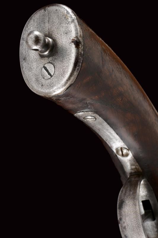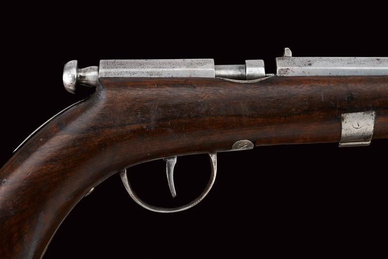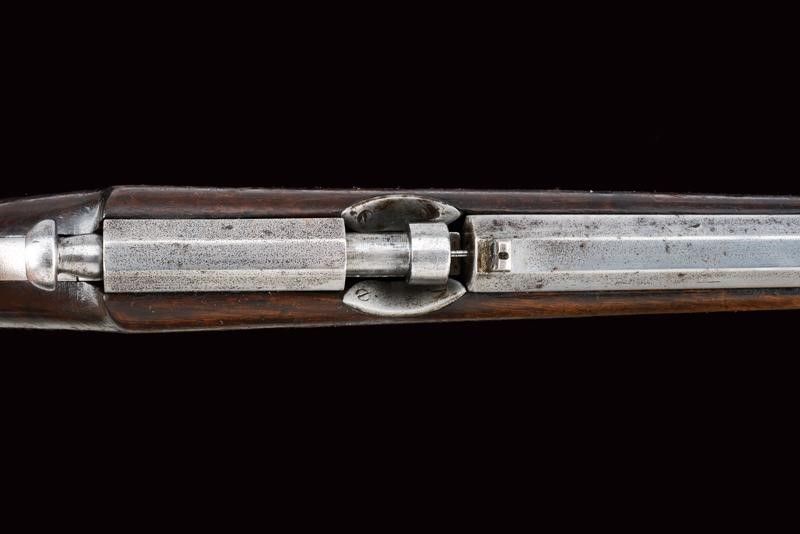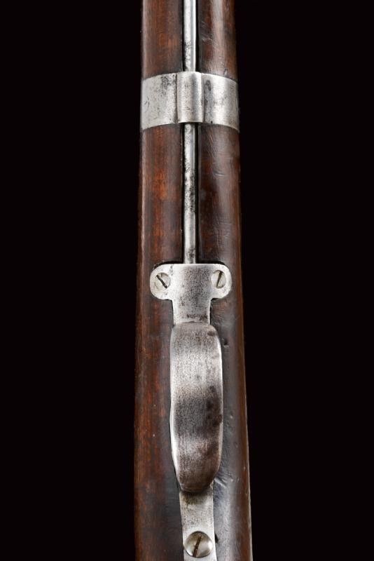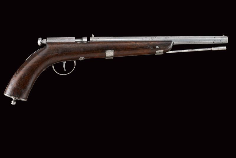 datazione: 1855 circa provenienza: Germania, Lunga canna ottagonale, liscia con alzo e mirino, cal. 10 mm; l'otturatore ottagonale, con caricamento a molla. Cassa a trequarti in legno con fornimenti e bacchetta in ferro. Anello di sospensione mancante. Per cartucce in carta, ad avancarica. Molto probabilmente un prototipo. lunghezza 51 cm.
